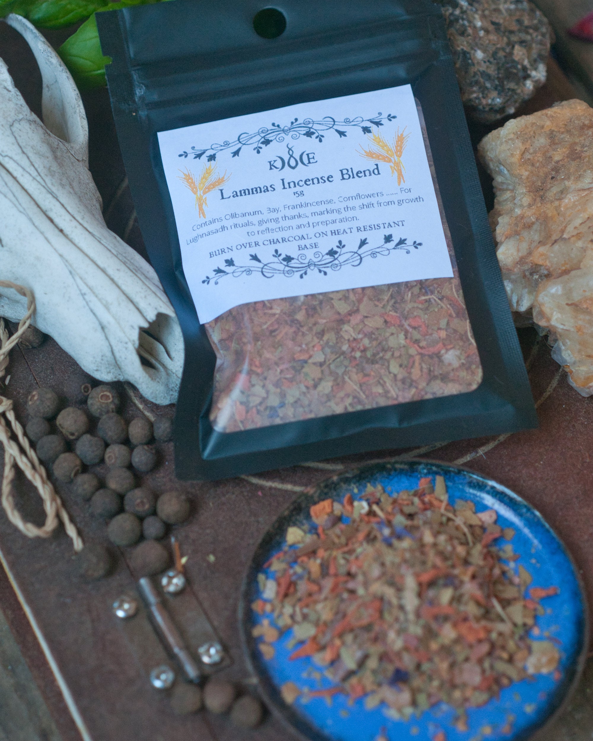 This is a proprietary blend based on traditional recipes and contains Olibanum, Bay, Frankincense, Cornflowers..... For Lughnasadh and Lammas rituals, but also can be used all year round for giving thanks and petitioning for abundance, and for rituals marking the shift from growth to reflection and preparation.