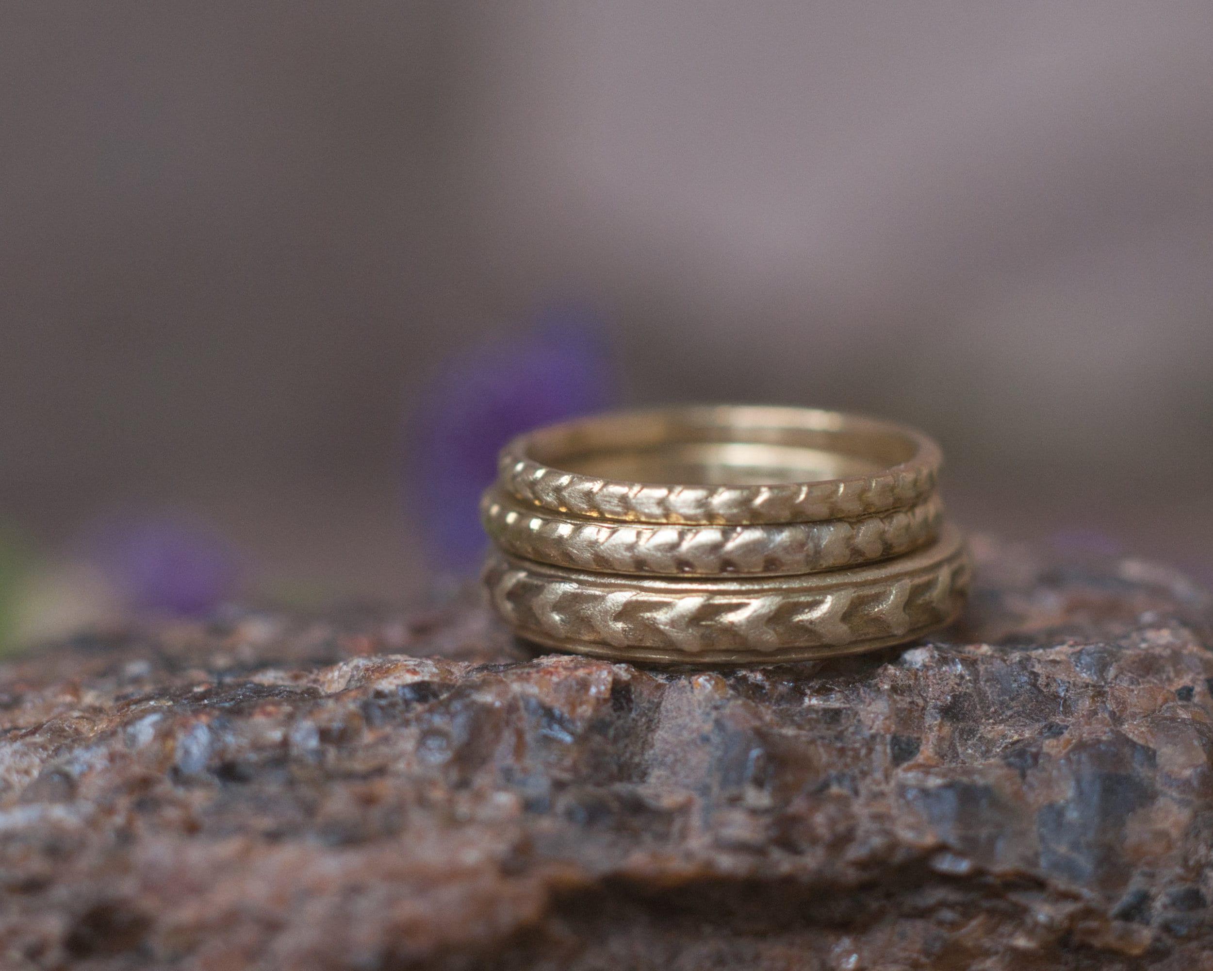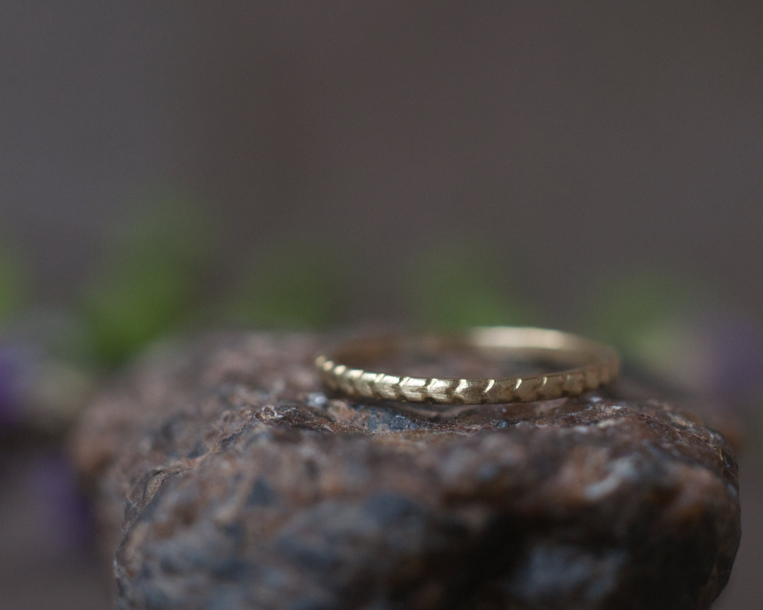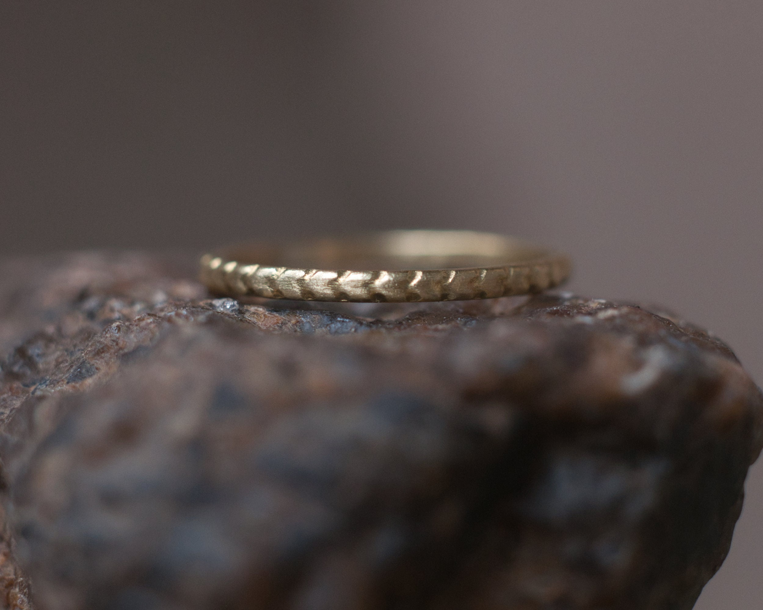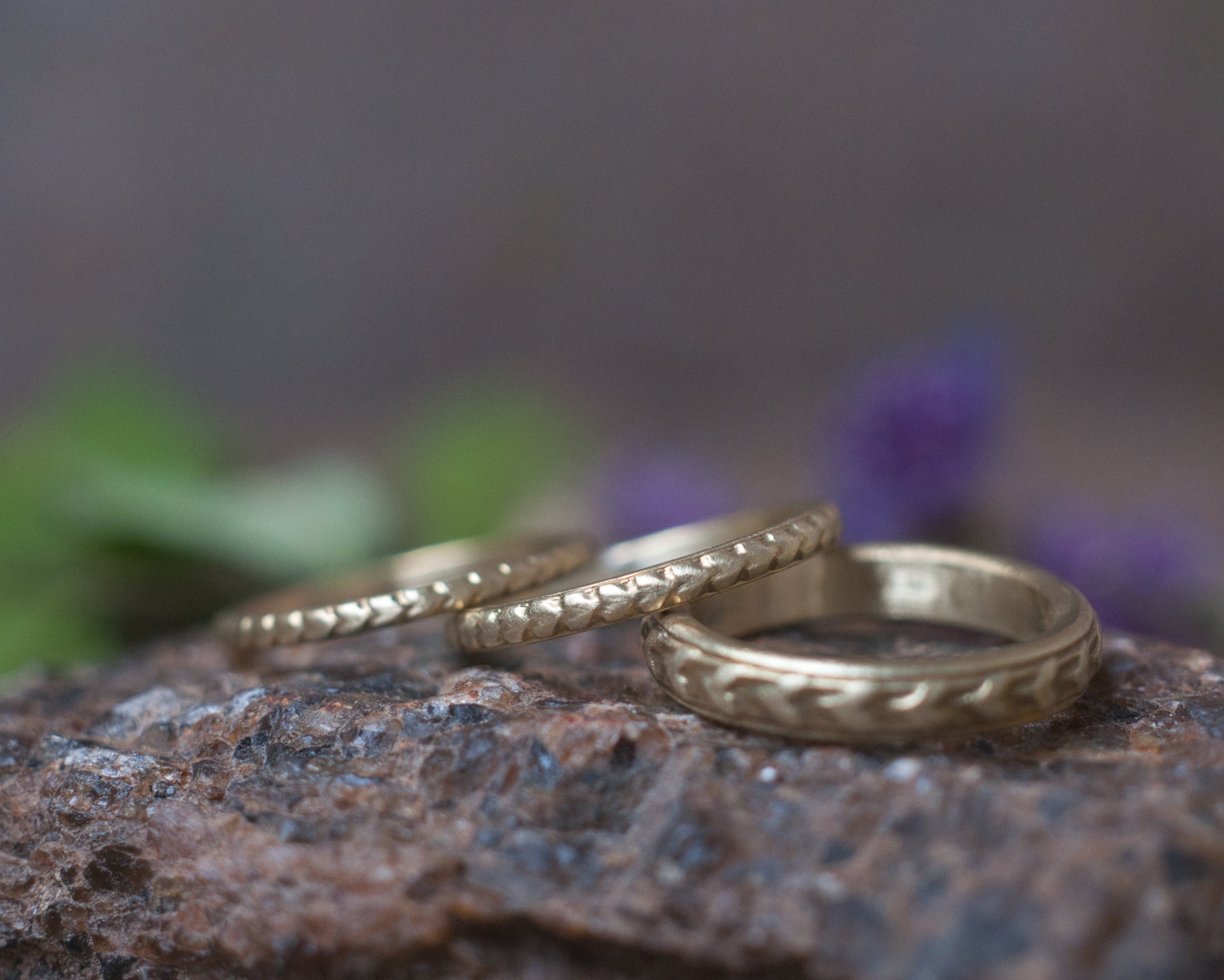 Sweet hearts for sweethearts... a simple, rustic band of love hearts in a choice of widths to suit all finger sizes. This ring is made from milling a length of gold (or silver) wire through a special patterned roller.