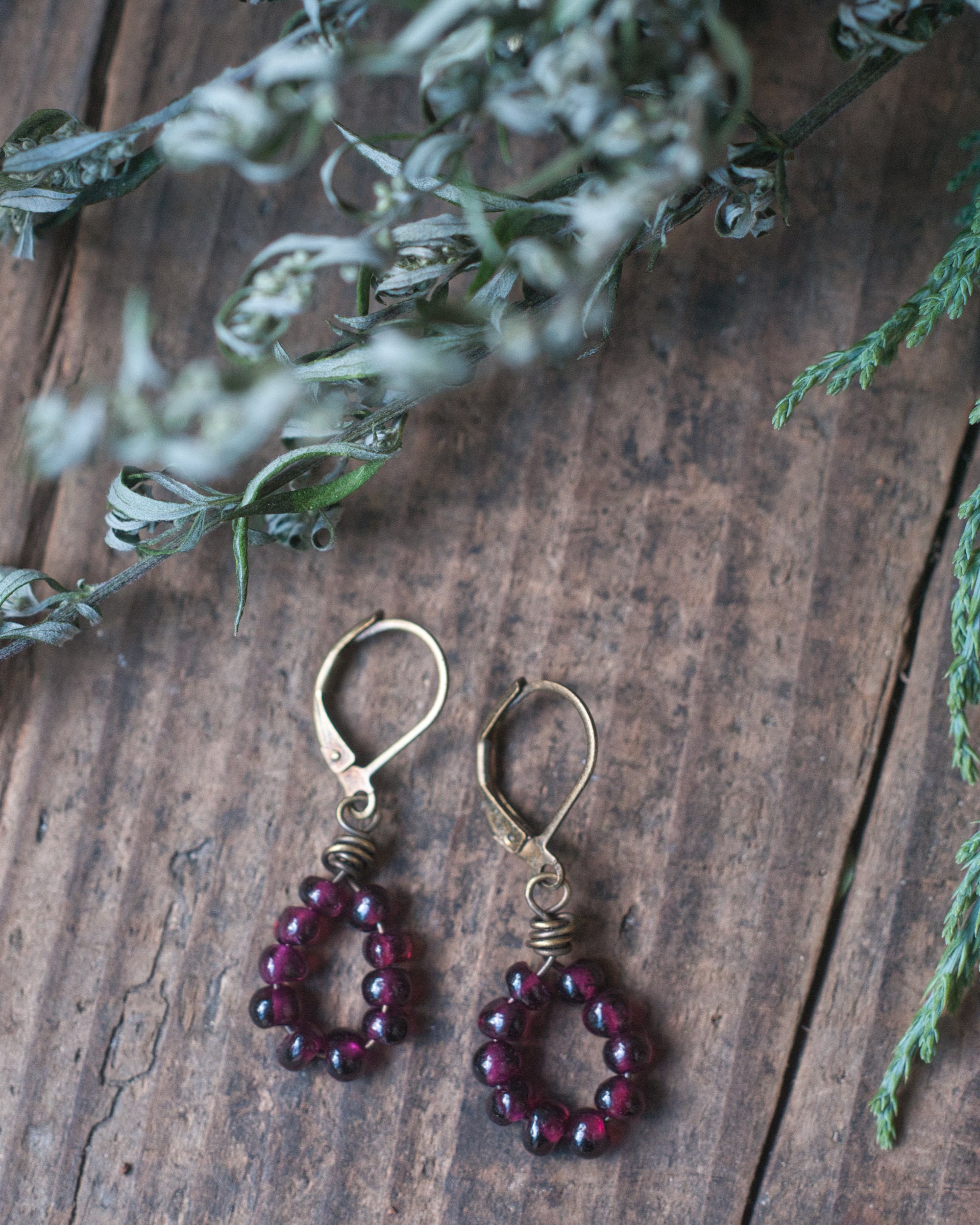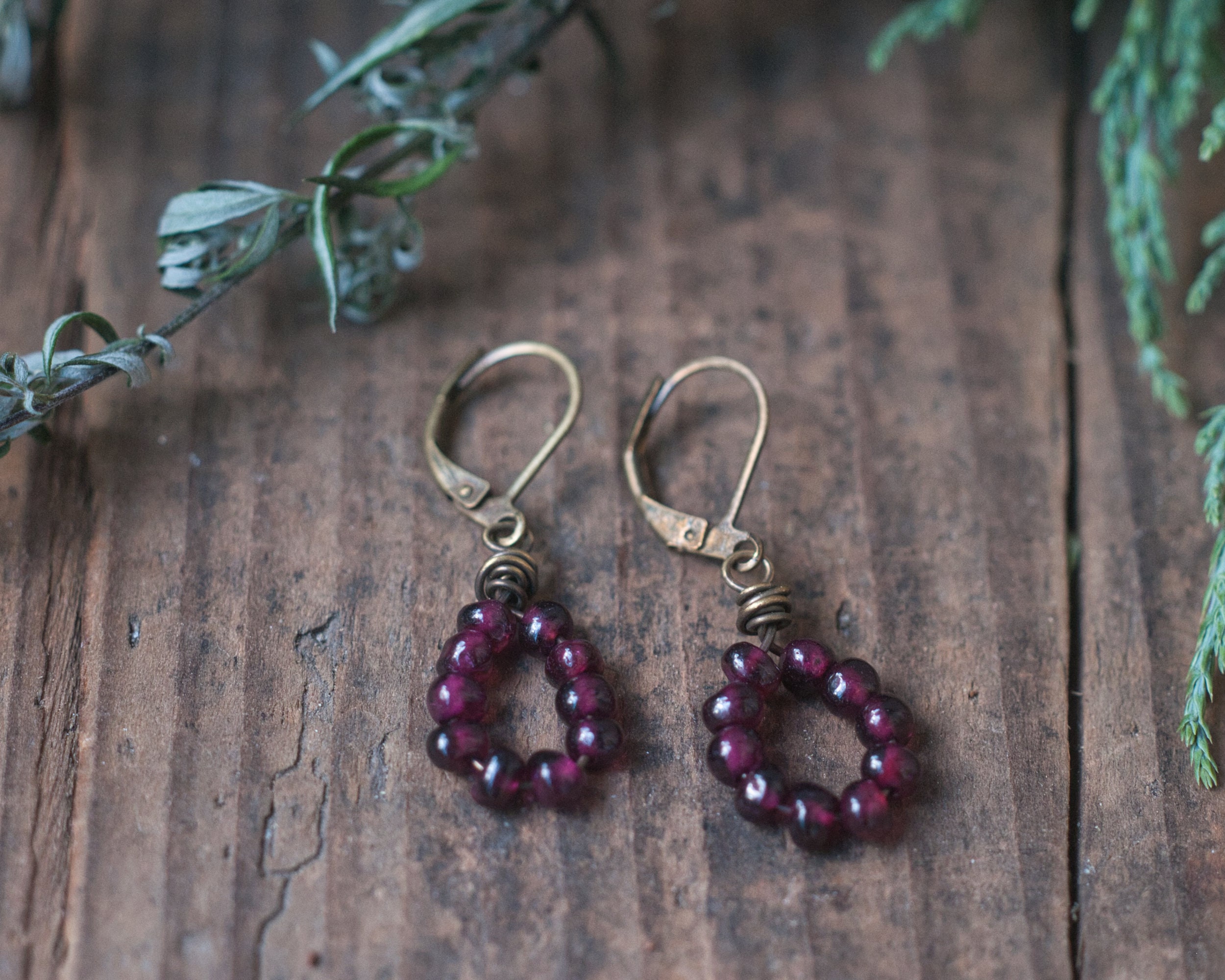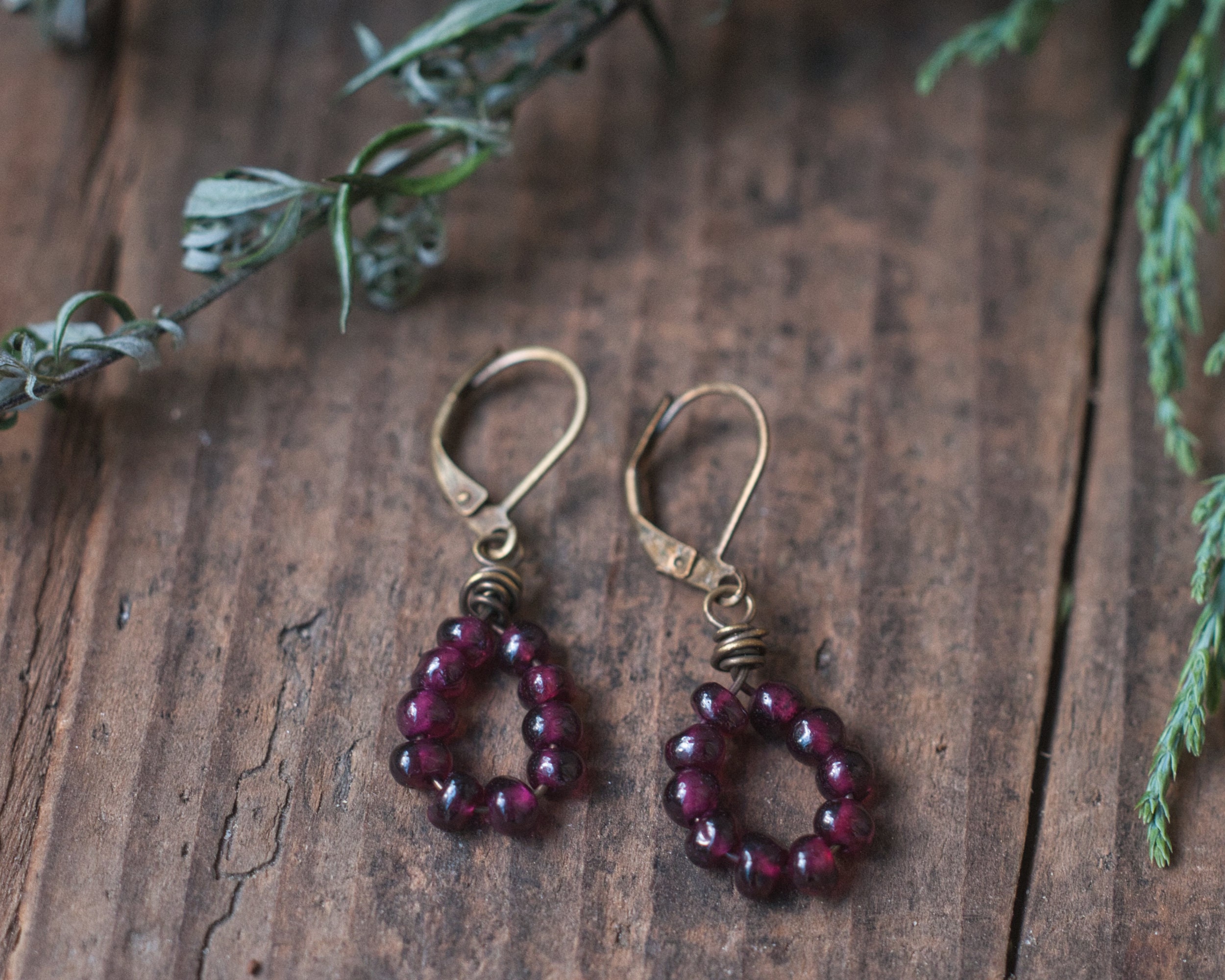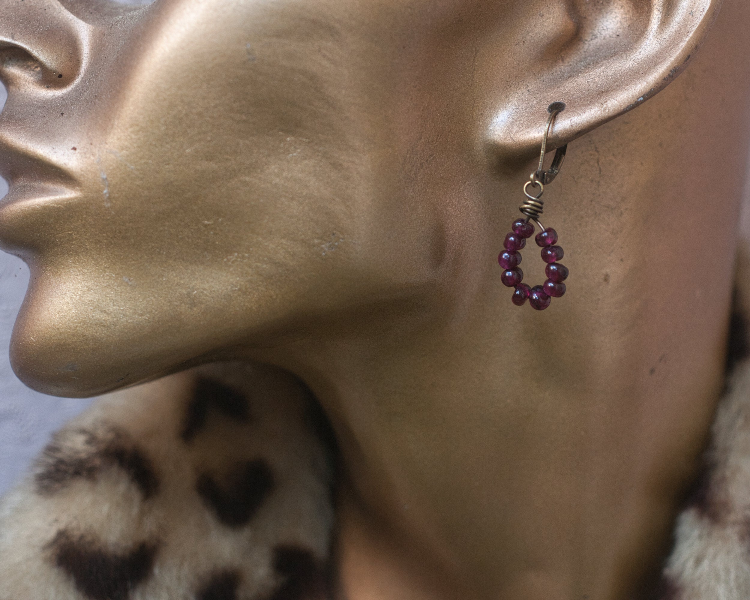 Antique brass earrings with little nuggets of garnet like pomegranate seeds in a wire wrapped teardrop shape. Perfect for the office or for a Bacchanalia feast!