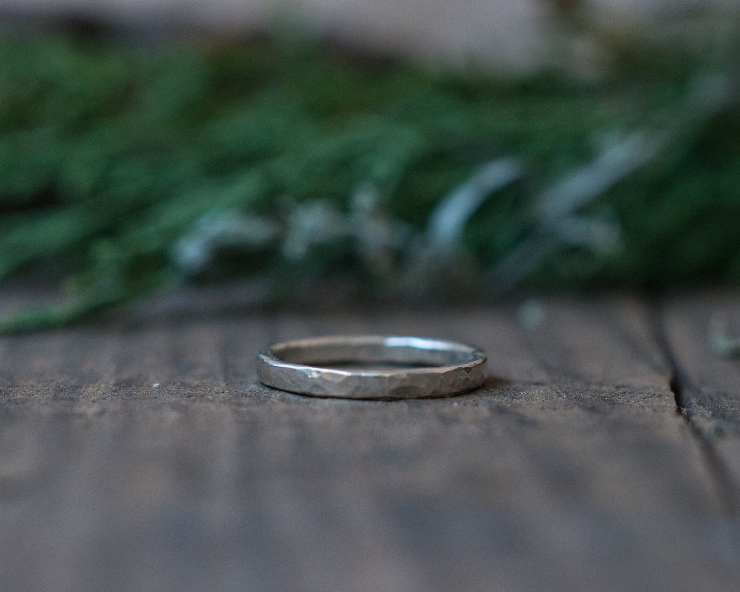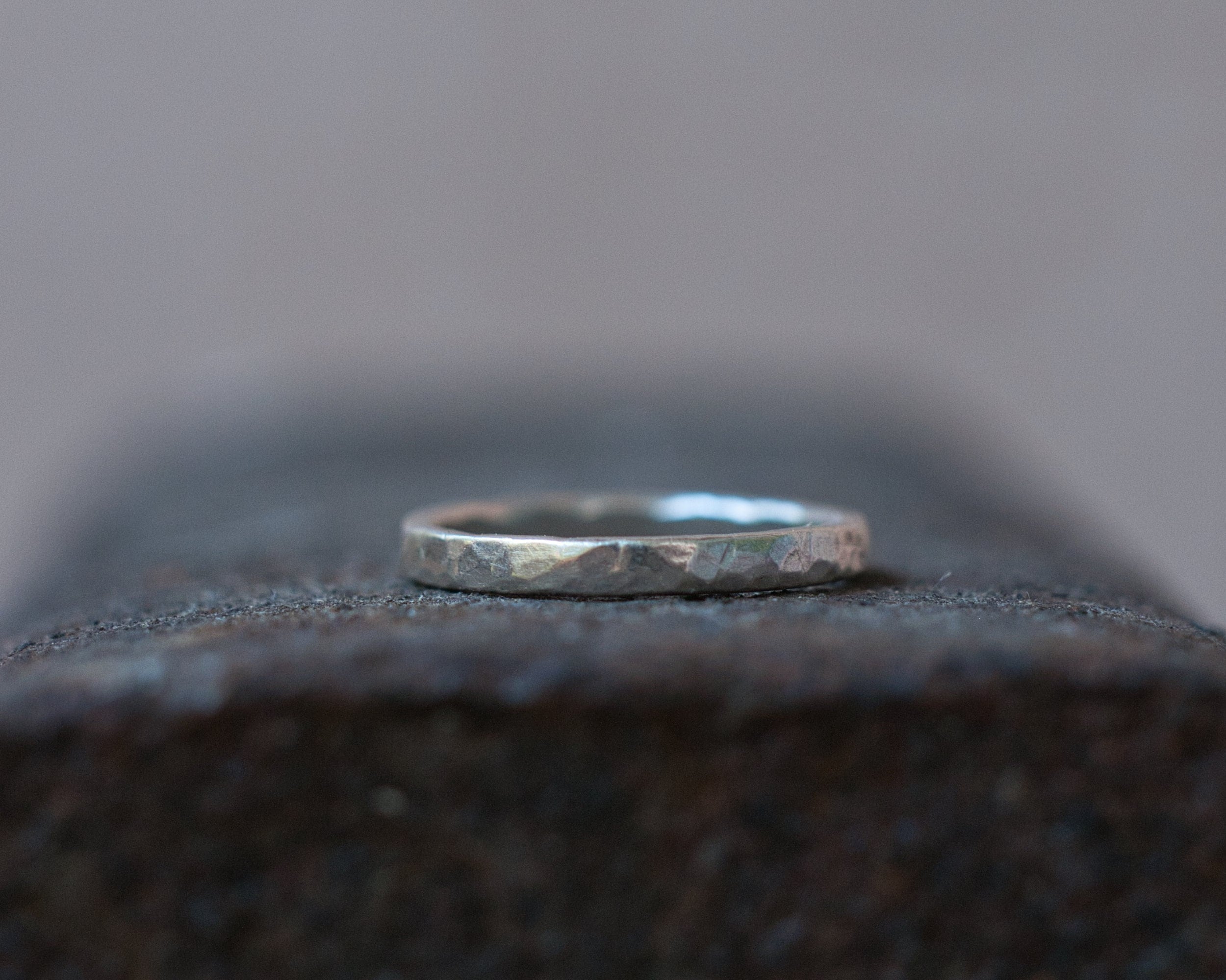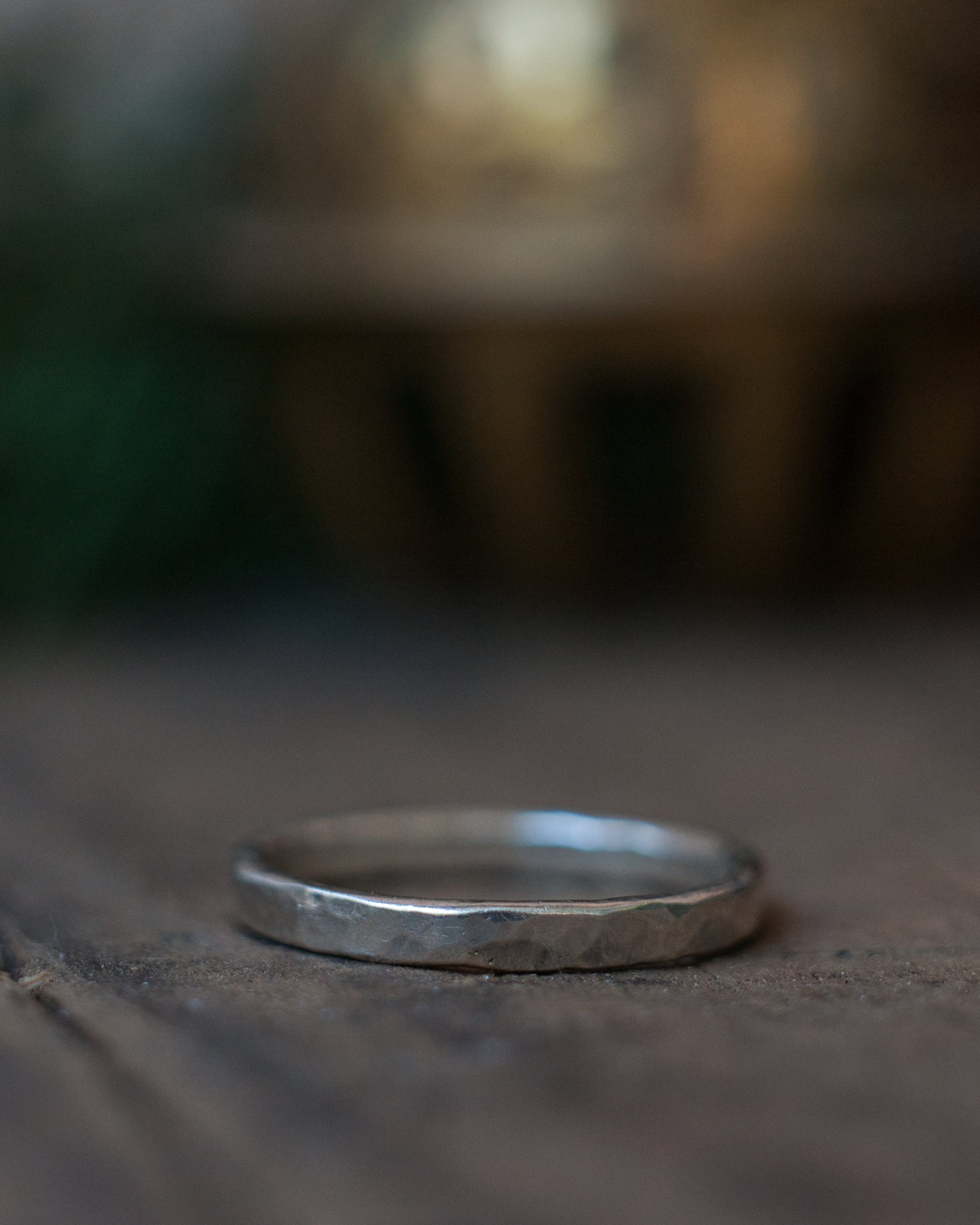 A slim band of sterling silver, hammered and brushed for a rustic, matt finish. Made from 2mm diameter wire stock.
