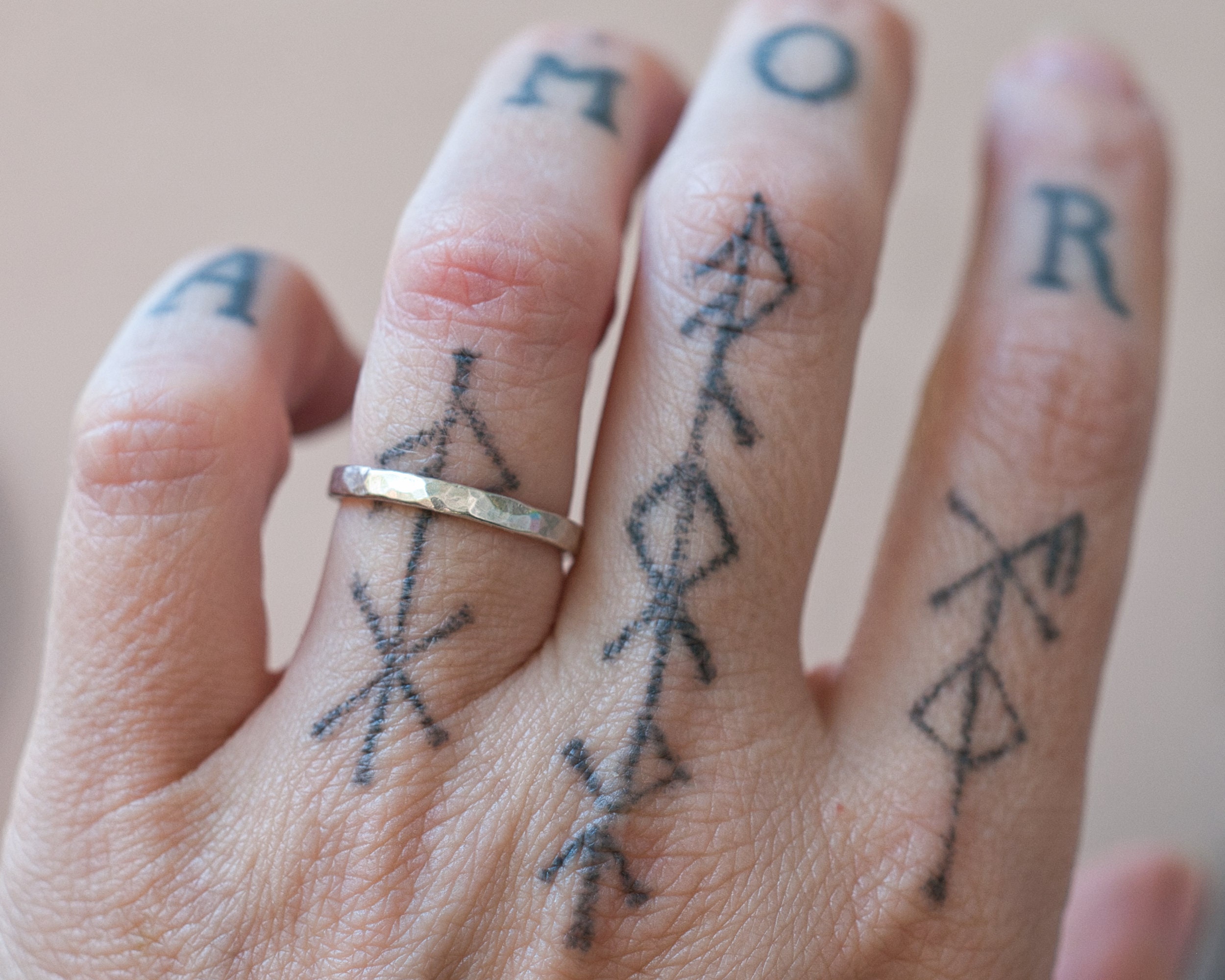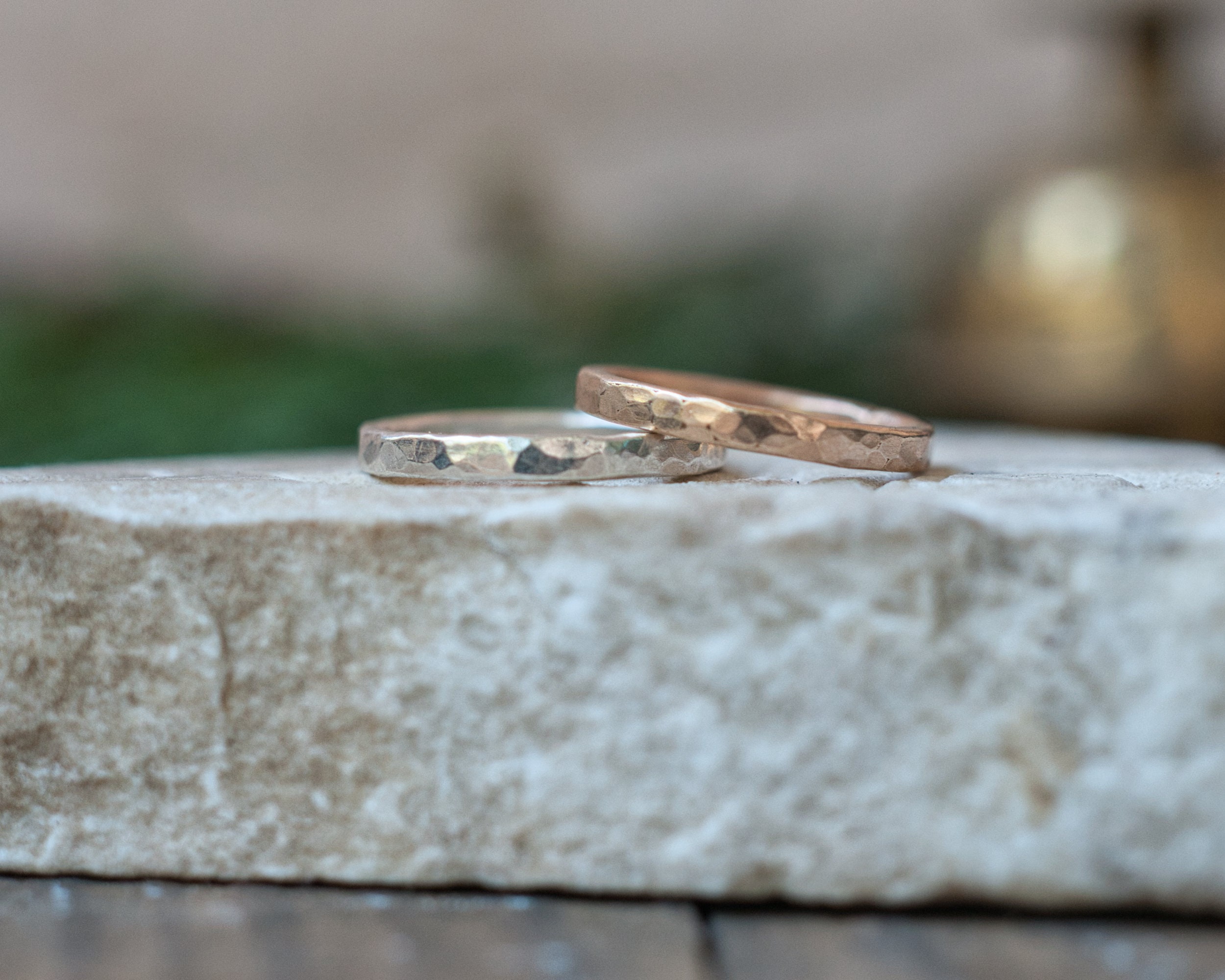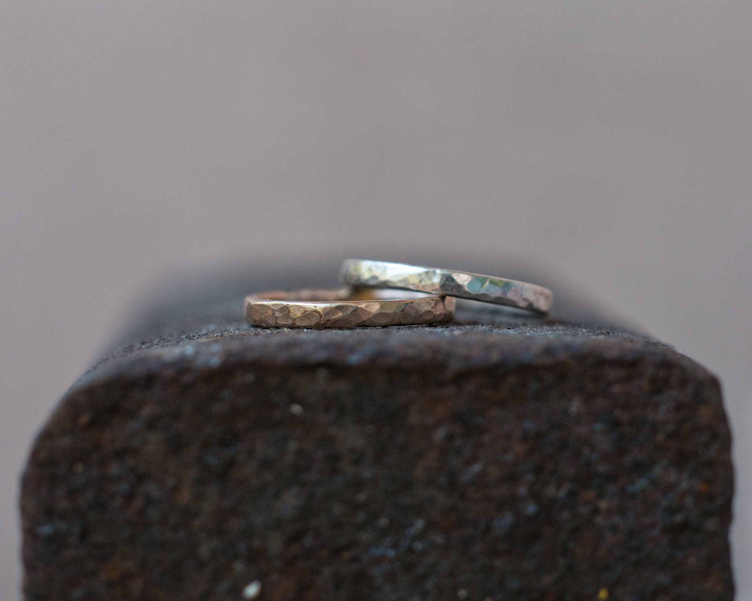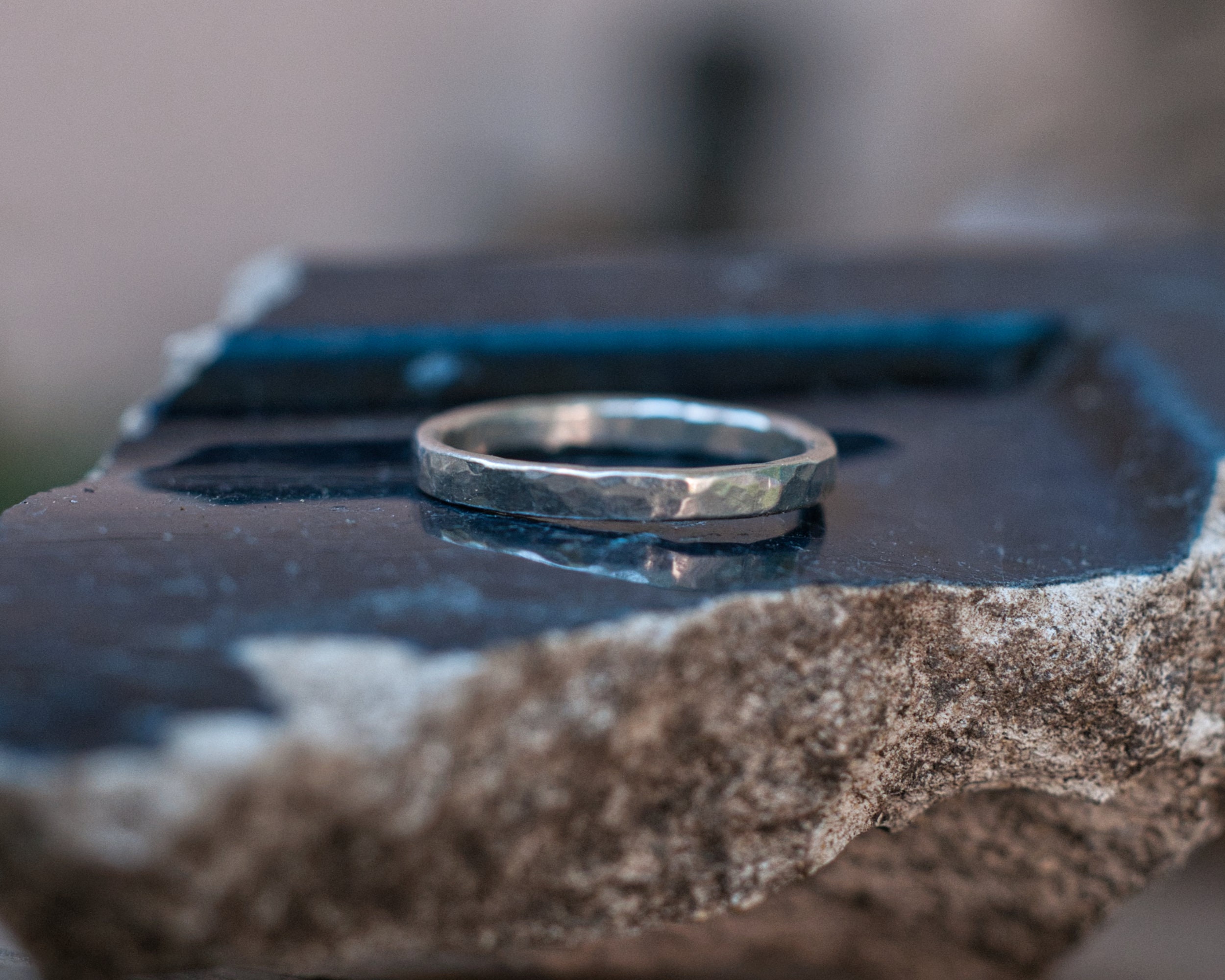 A slim band of sterling silver, hammered and brushed for a rustic, matt finish. Made from 2mm diameter wire stock.