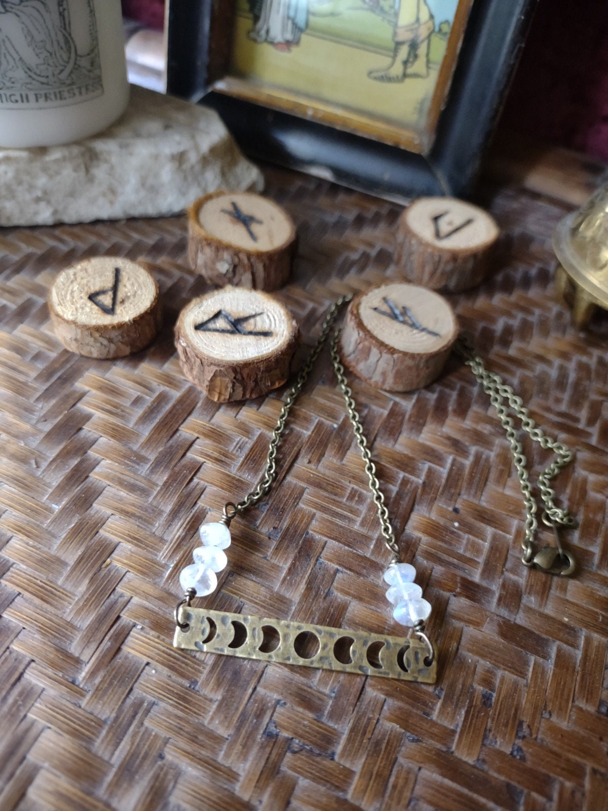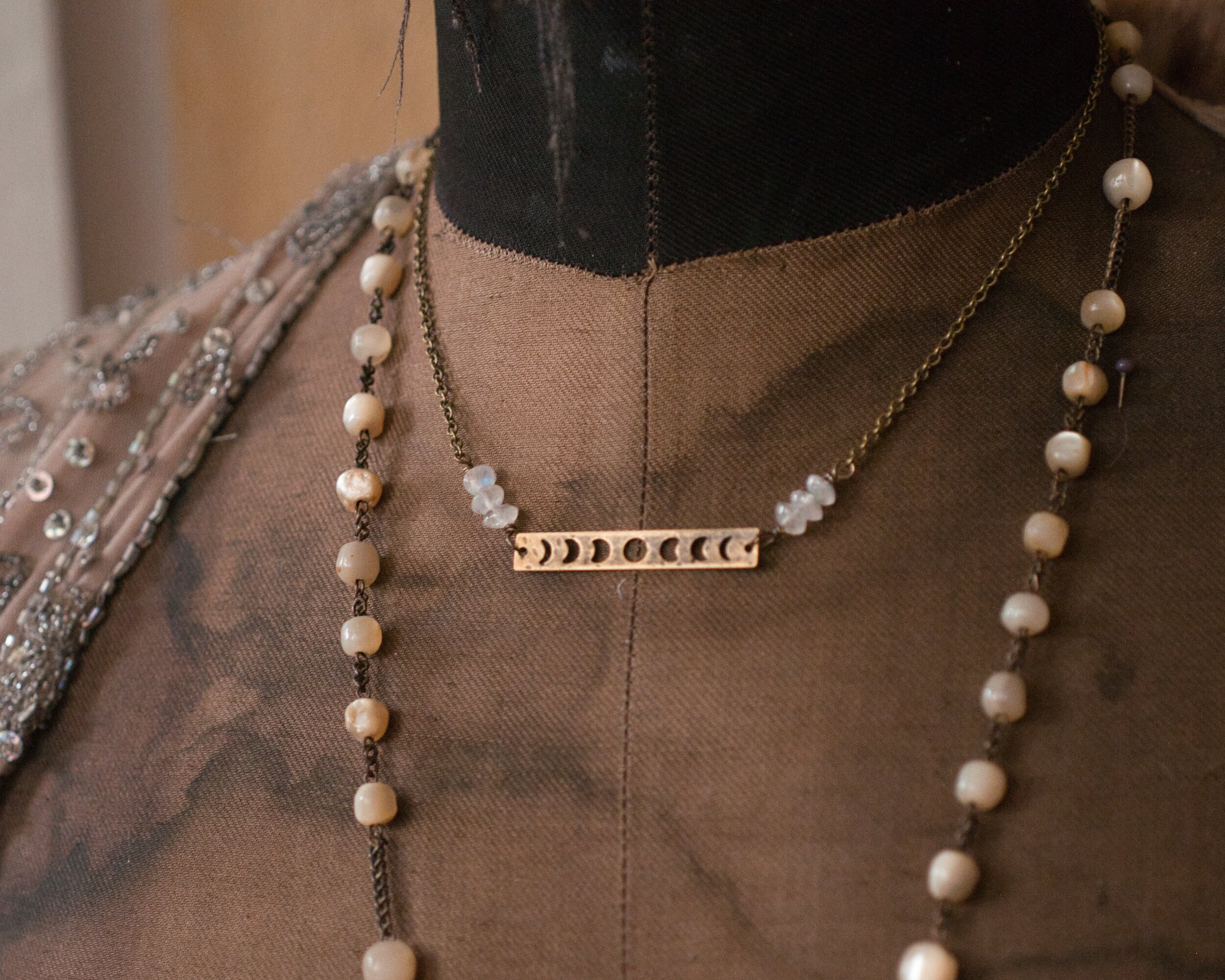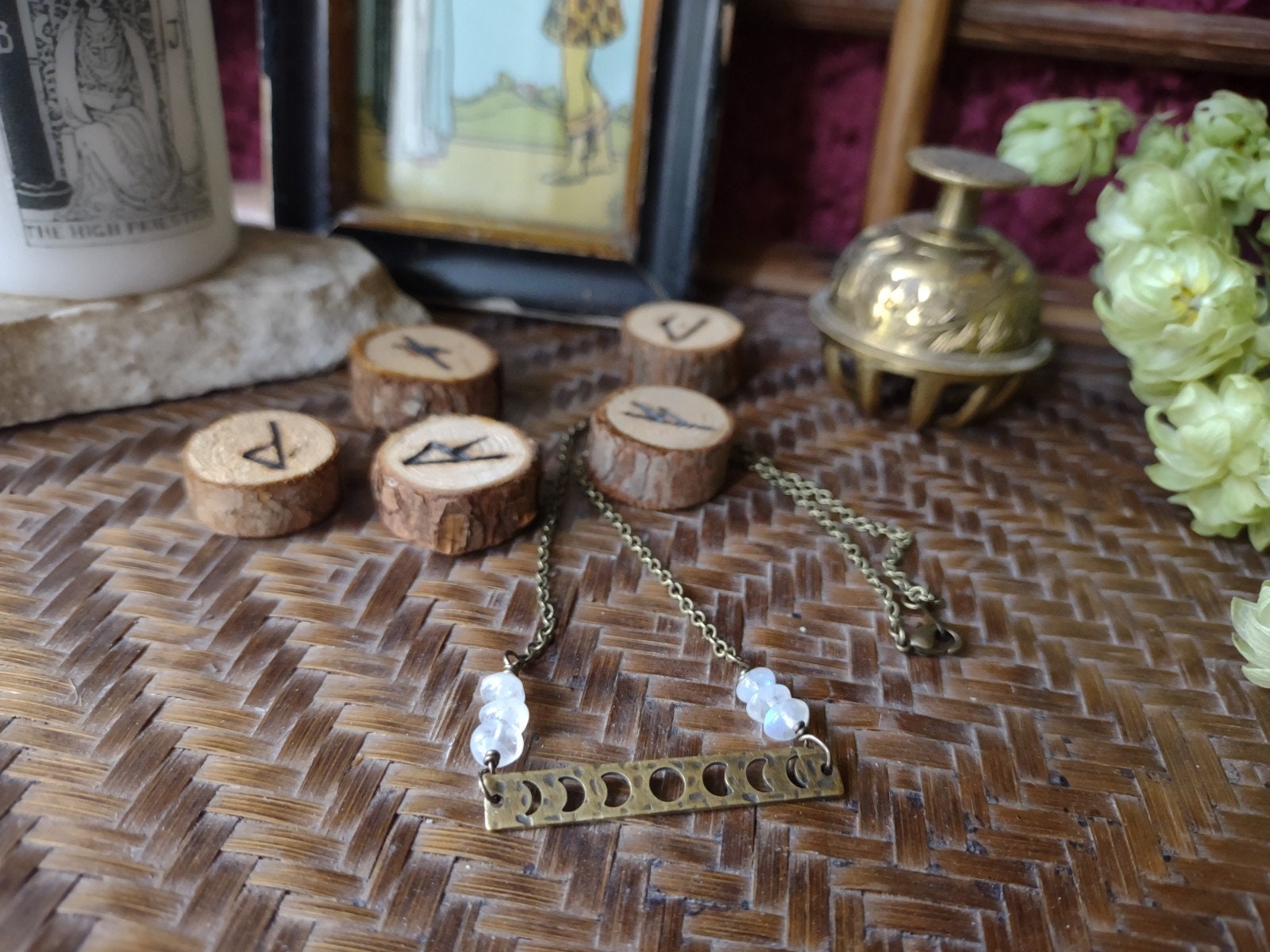 Seven phases of the moon are represented in this moon phase necklace, pierced in sheet brass that is gently hammered and oxidised for an antique finish. The lunar phase pendant is joined to an antique bronze colour brass cable chain by wire wrapped rainbow moonstone Rondells beads. The necklace is 16" and closes with a lobster clasp at the rear.