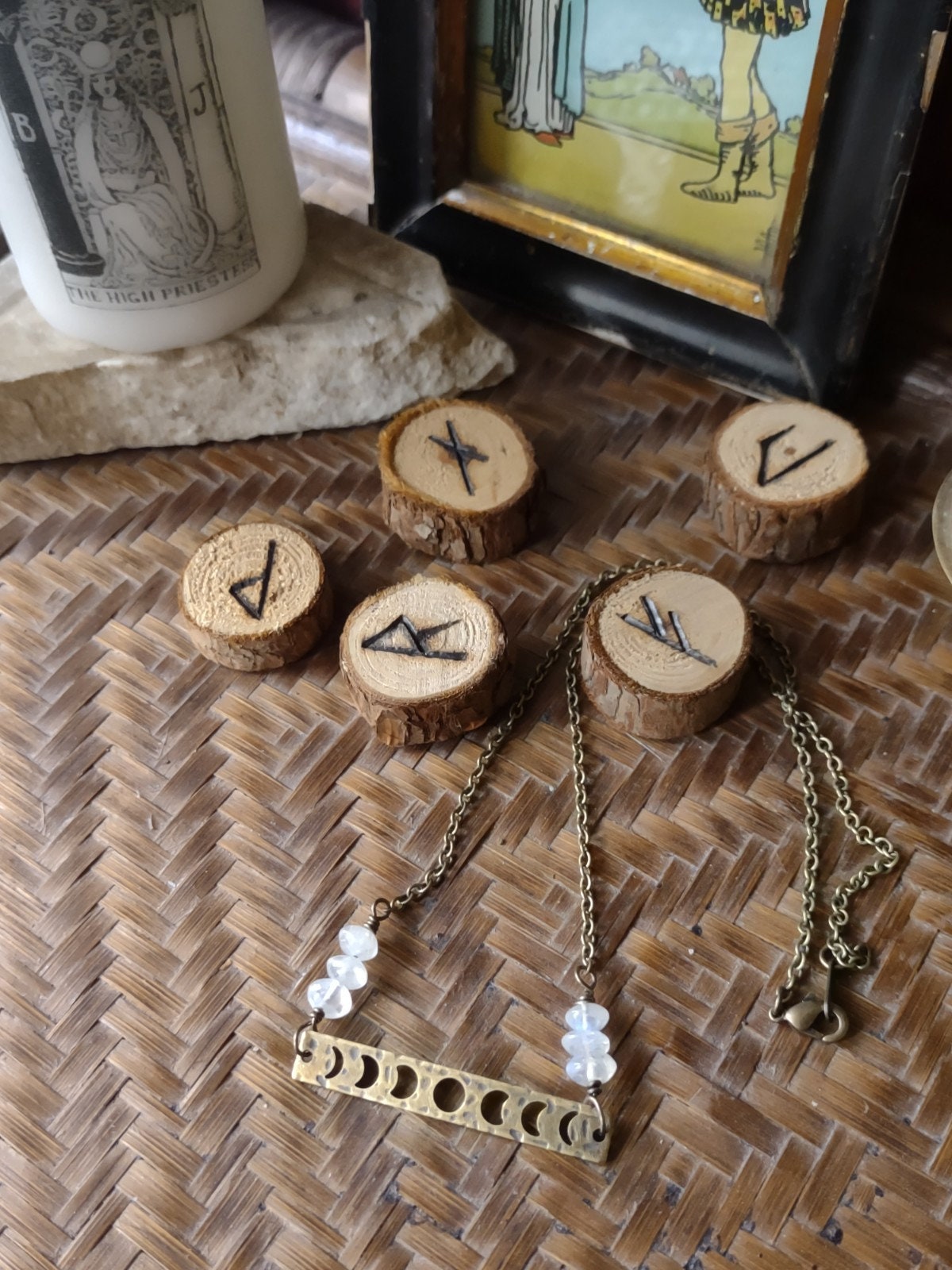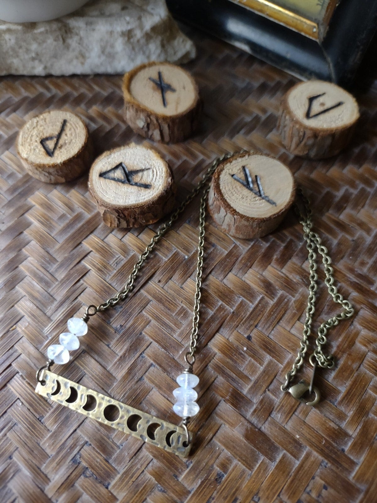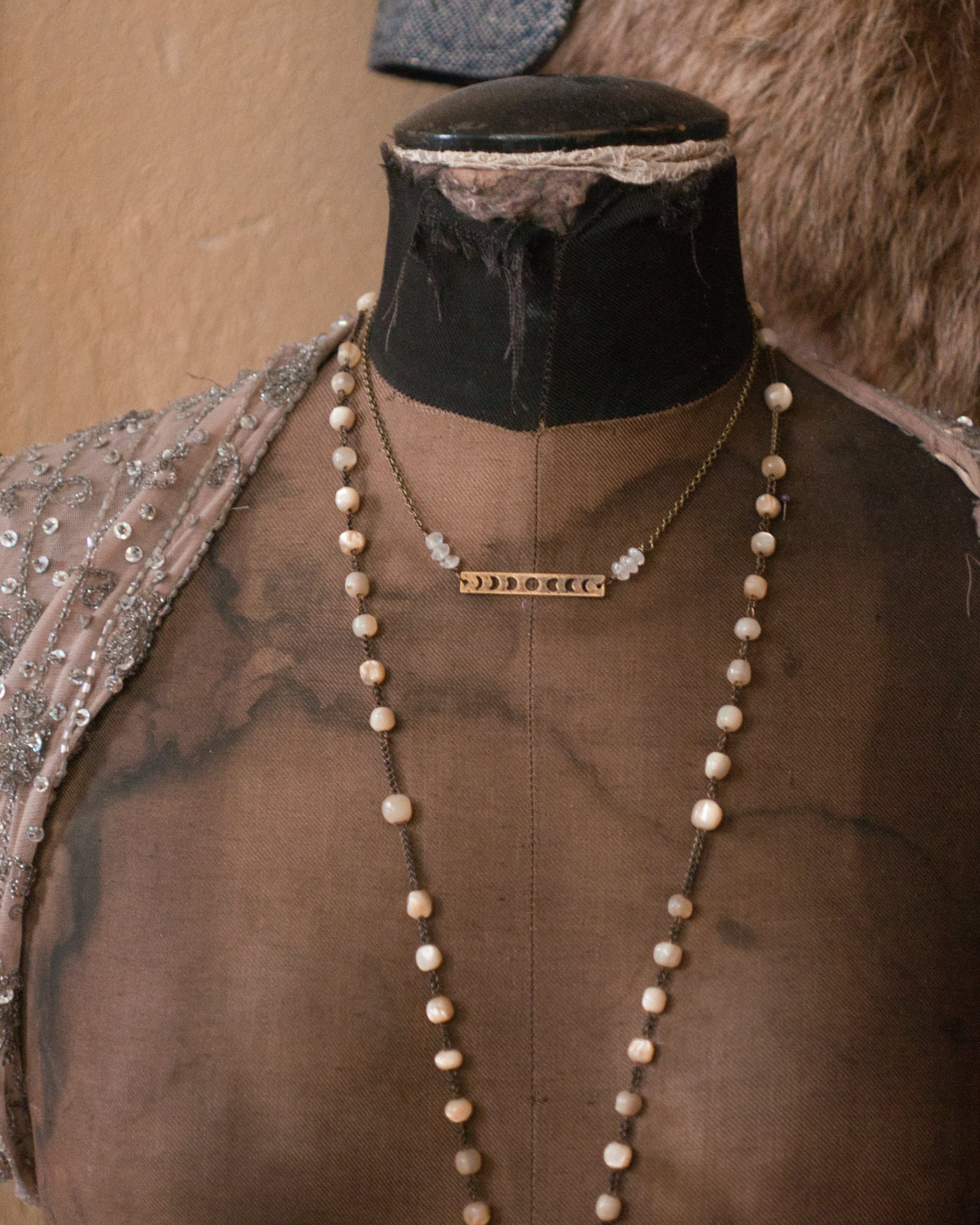 Seven phases of the moon are represented in this moon phase necklace, pierced in sheet brass that is gently hammered and oxidised for an antique finish. The lunar phase pendant is joined to an antique bronze colour brass cable chain by wire wrapped rainbow moonstone Rondells beads. The necklace is 16" and closes with a lobster clasp at the rear.