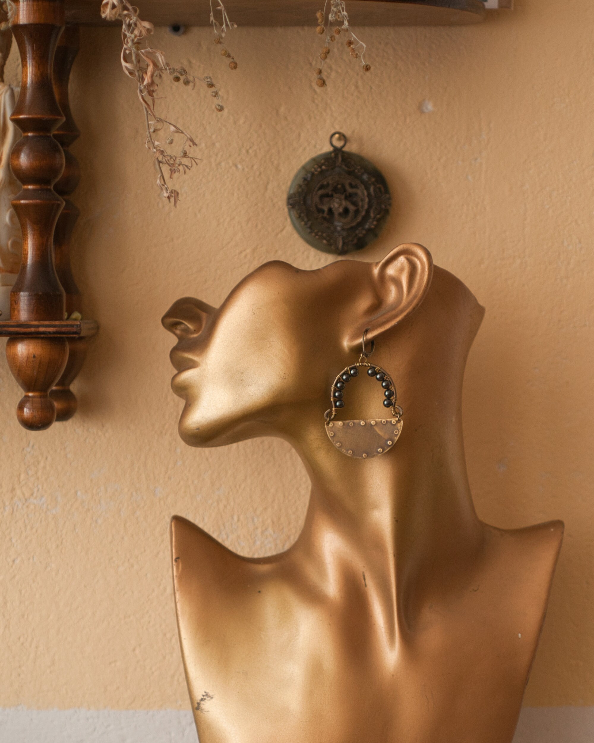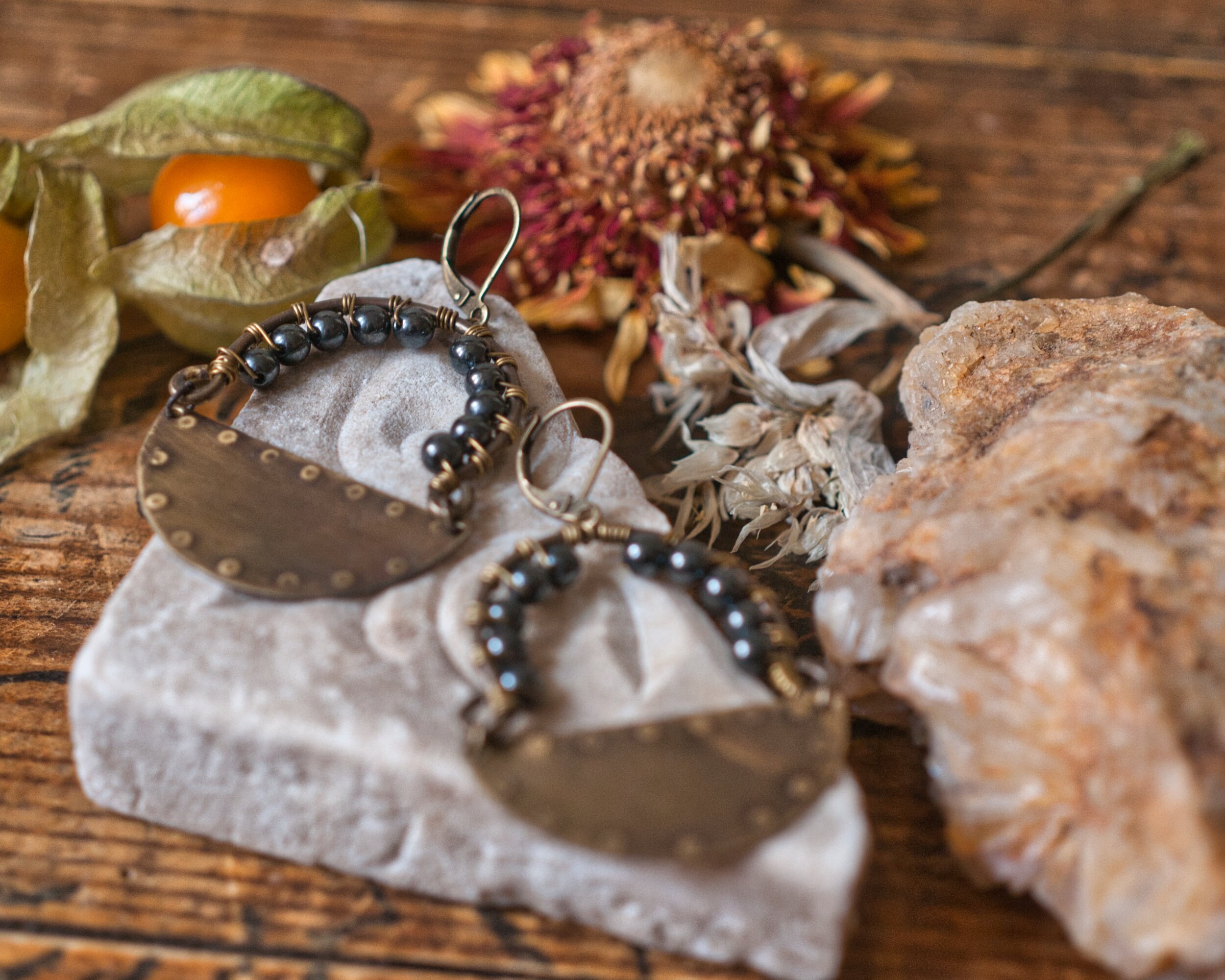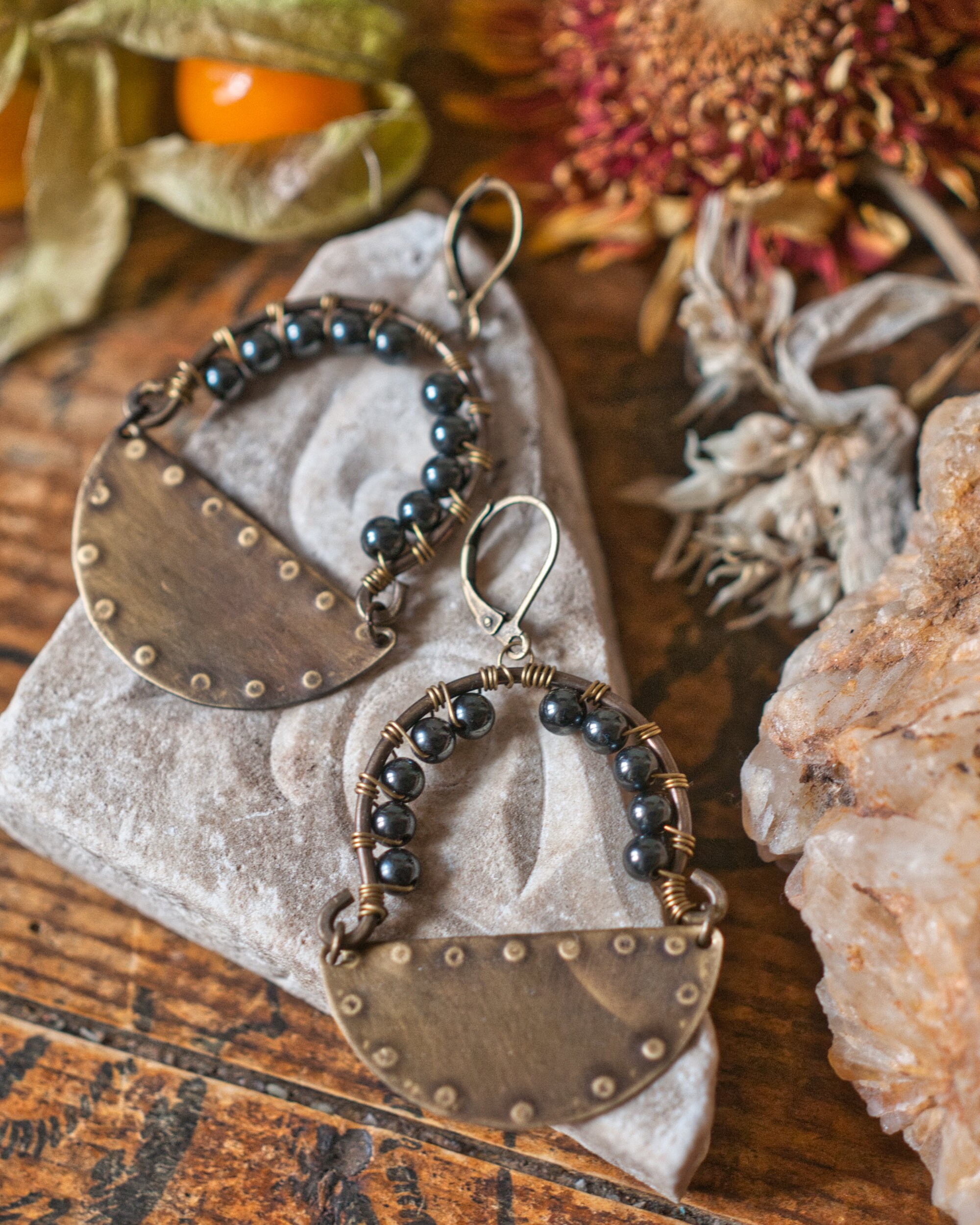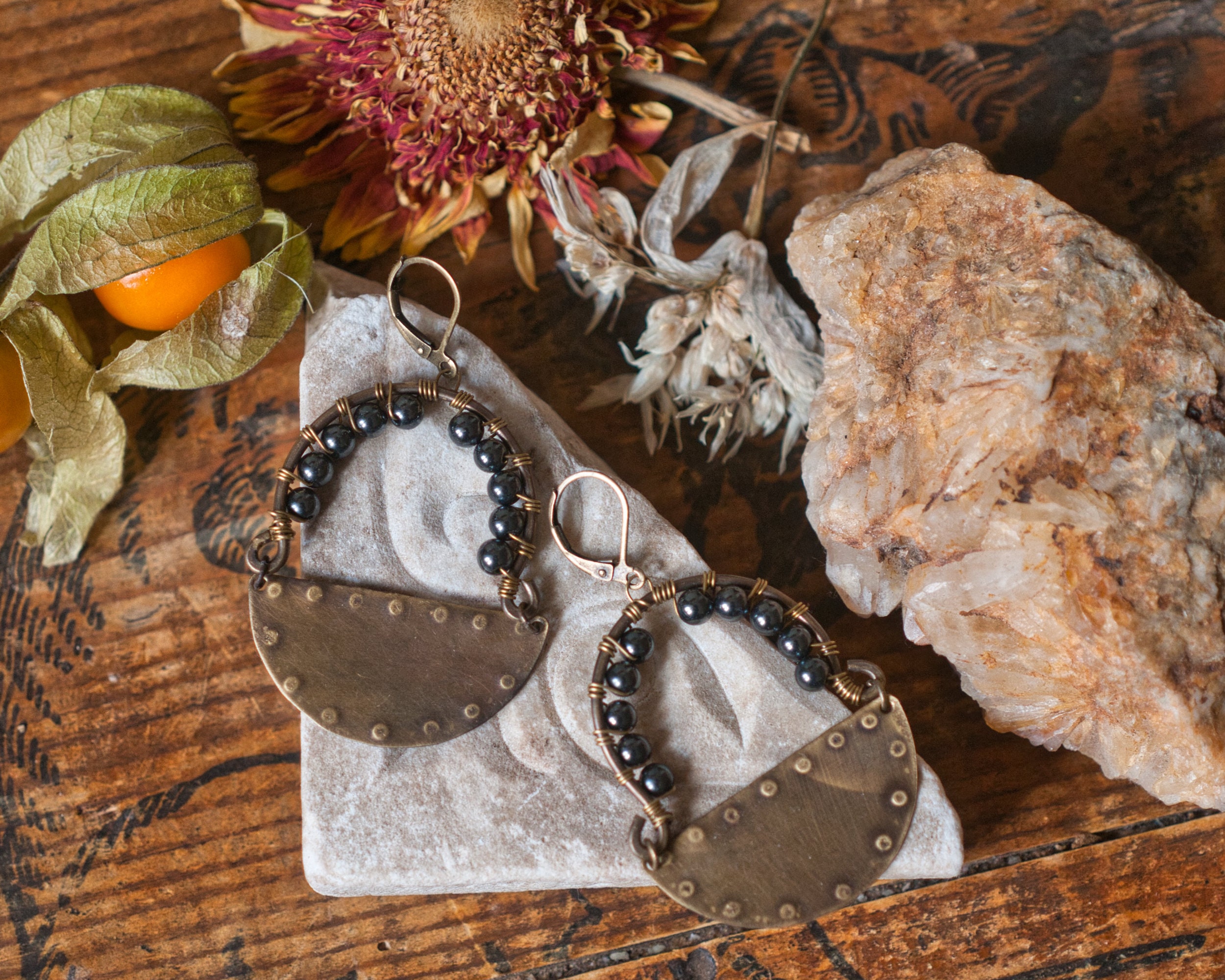 Stamped brass with wire wrapped recycled hematite beads. Hematite is considered a master protector, repelling the negative energy of those around you. It boost courage and encourages self confidence and will power.