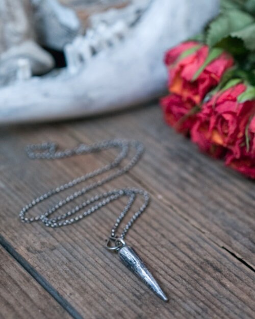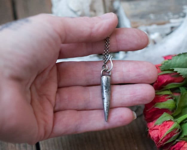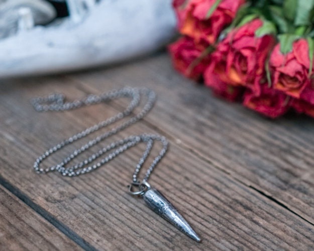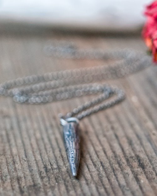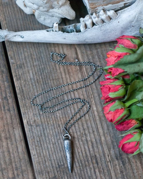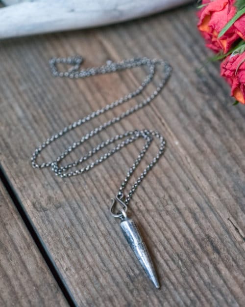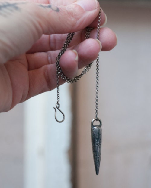 This solid .925 silver pendulum has been cast from a hand carved spike and sand cast for a rustic and primitive finish. The front closure in the chain via a hook and eye clasp also allows you to transform the pendulum into a necklace. Each unique pendulum pendant has been cast from a single wax carved model, the whole necklace is oxidised with a rustic finish.
