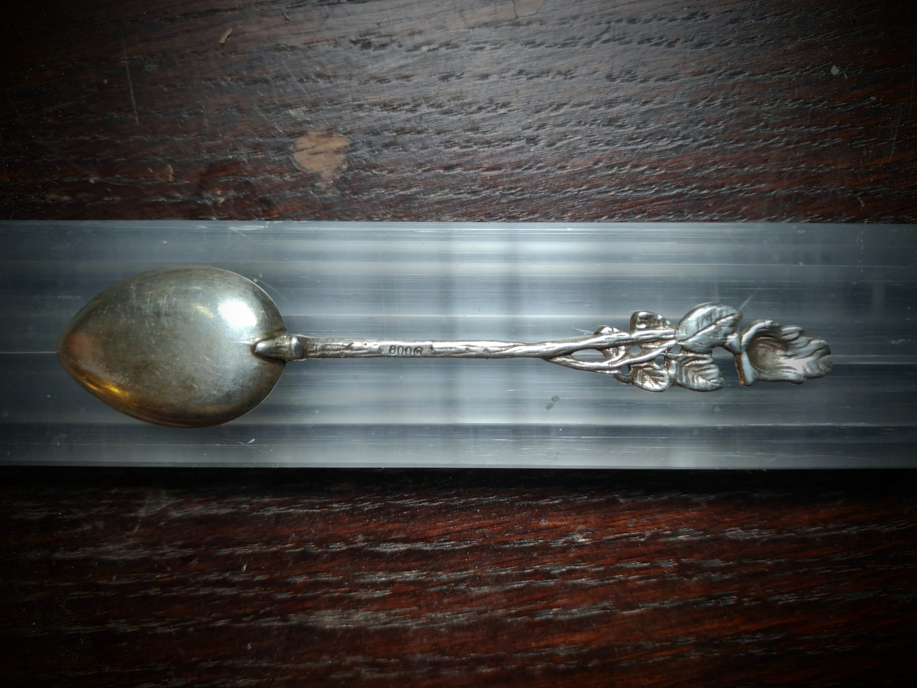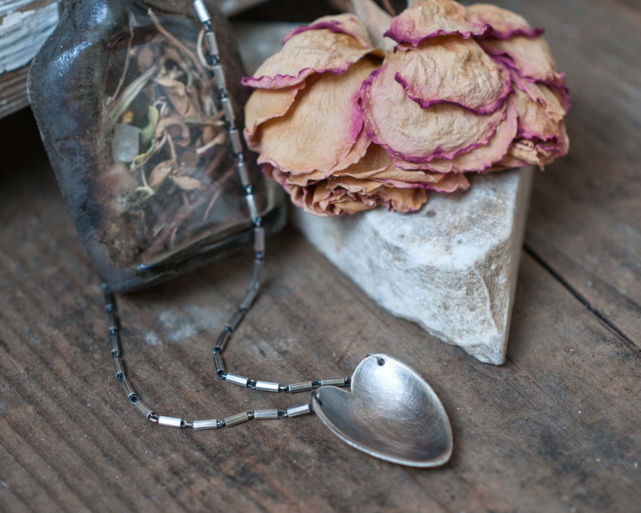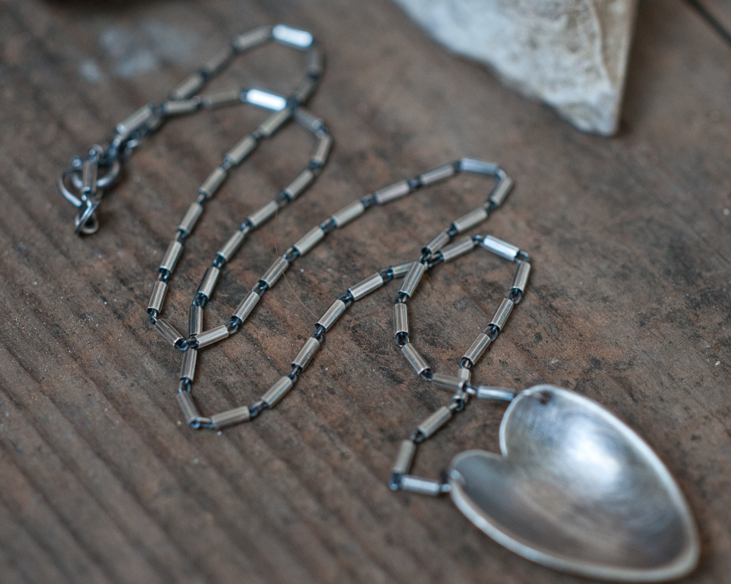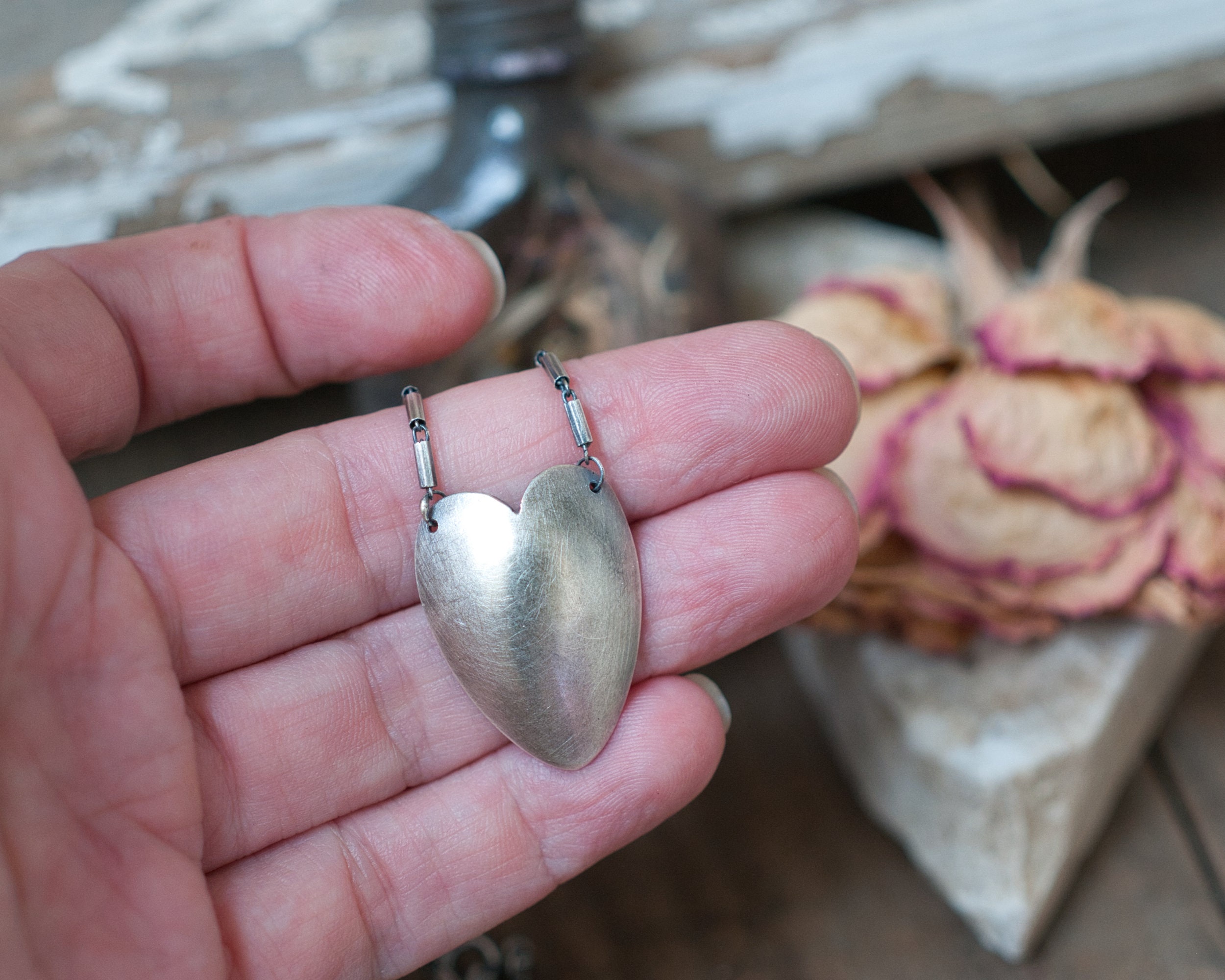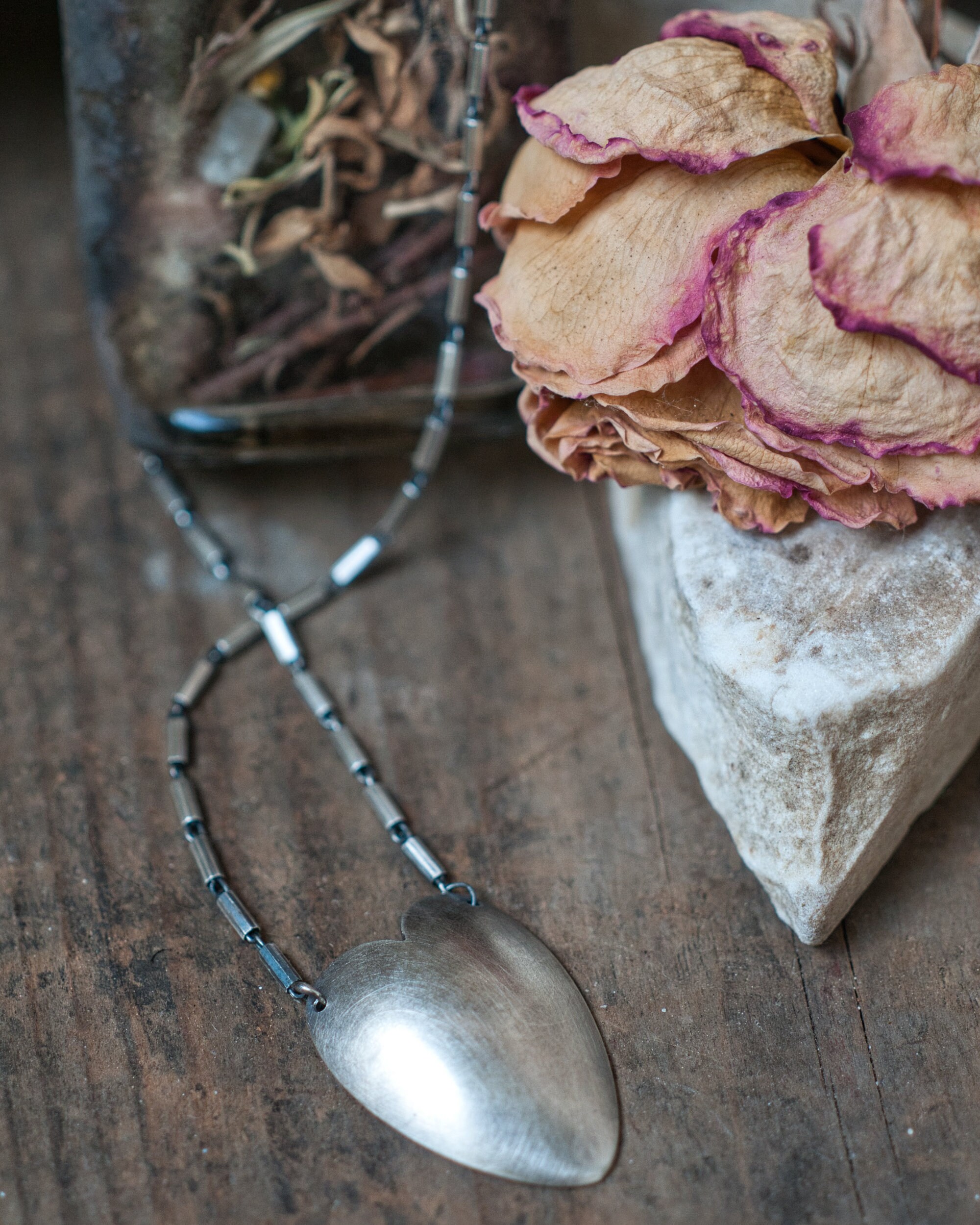 This sweetheart necklace with domed love heart pendant and tube link chain was made from the bowl of an antique .800 silver Hildesheim Rose spoon.