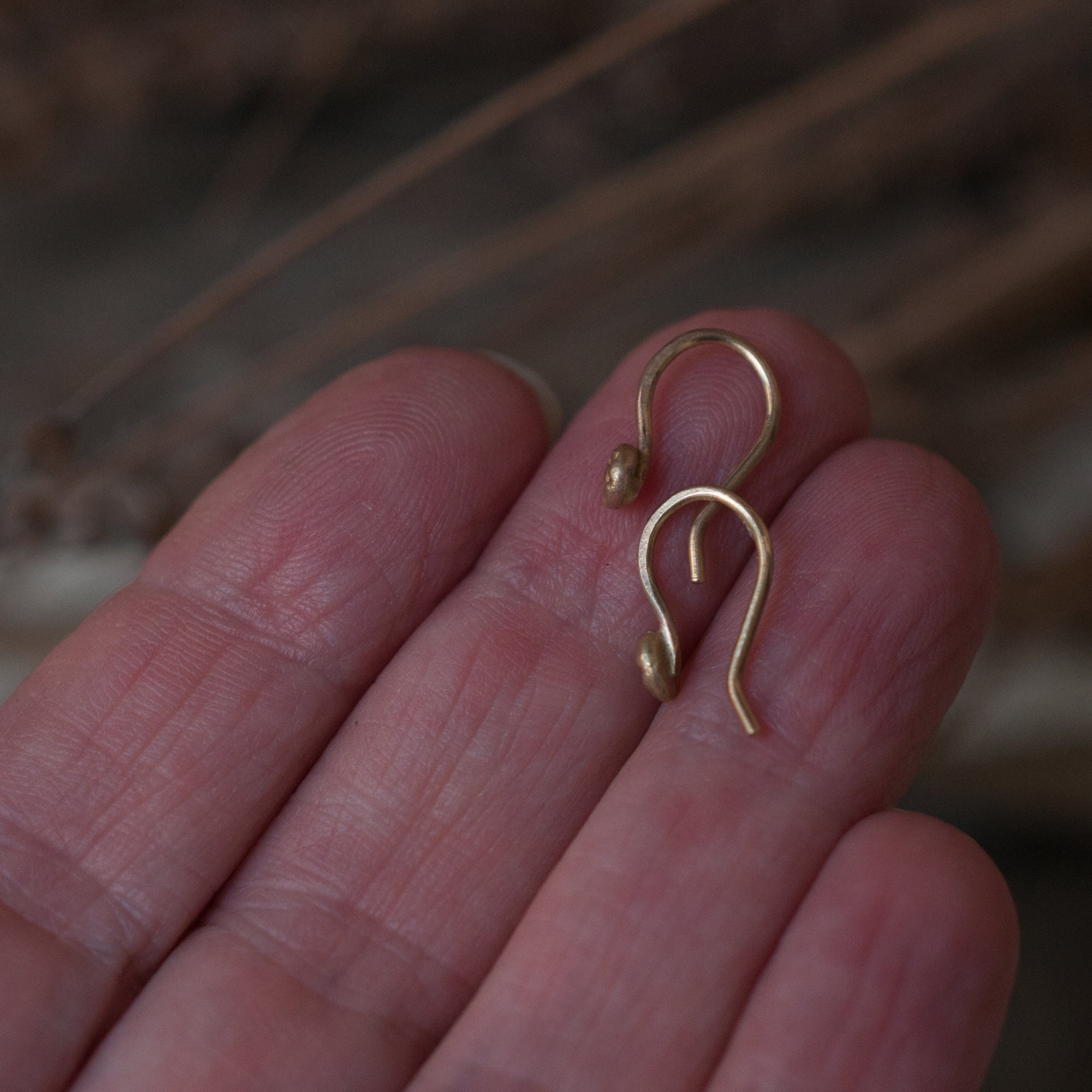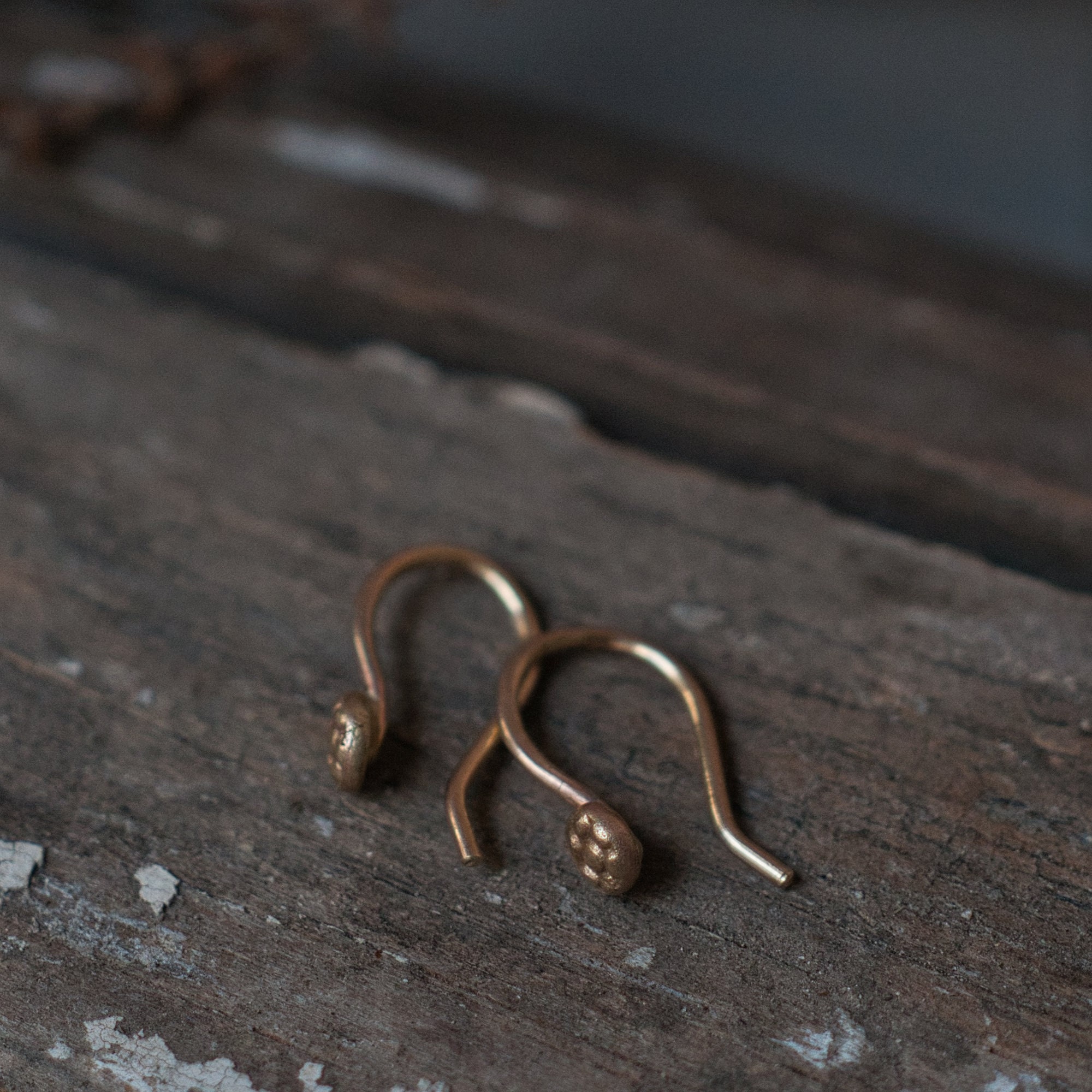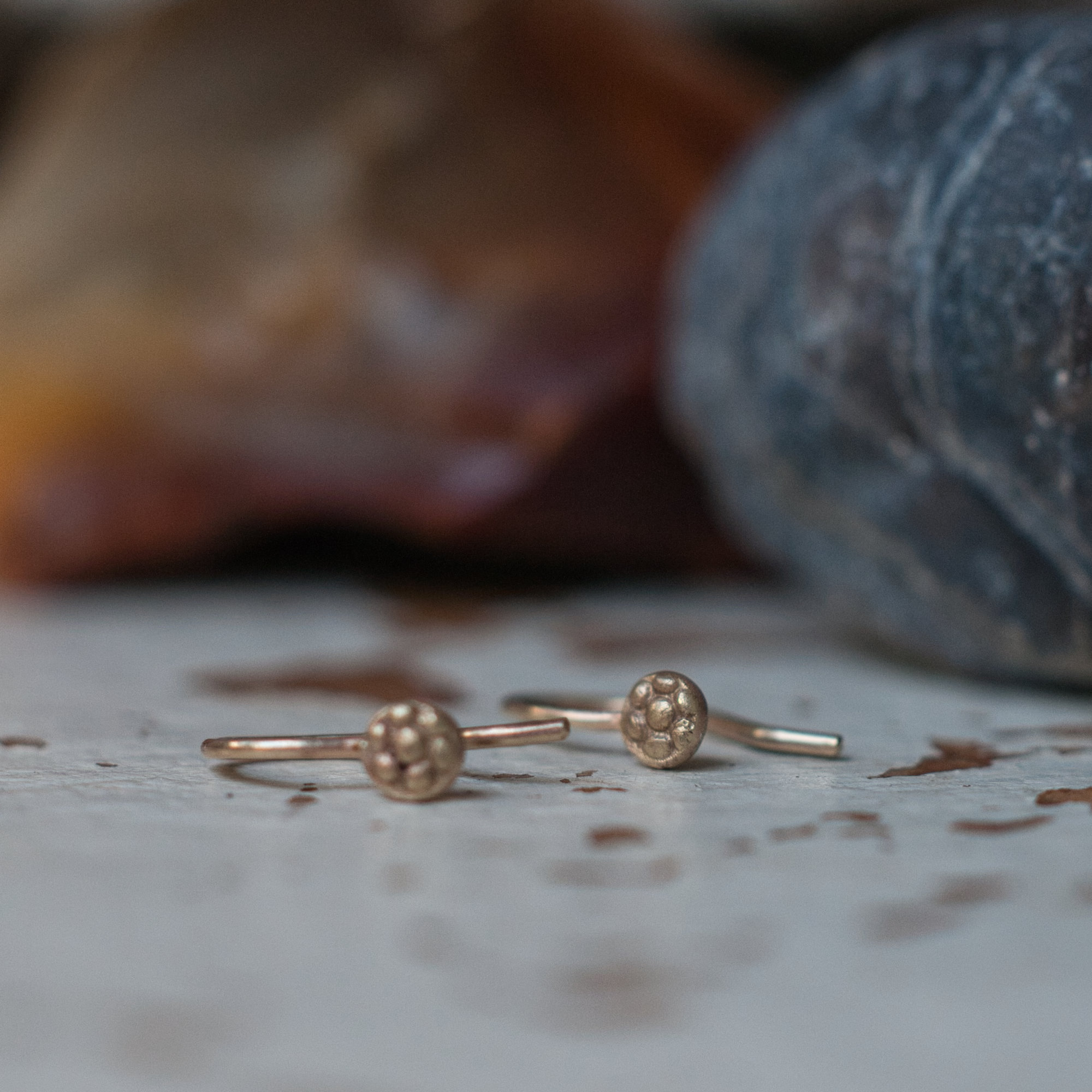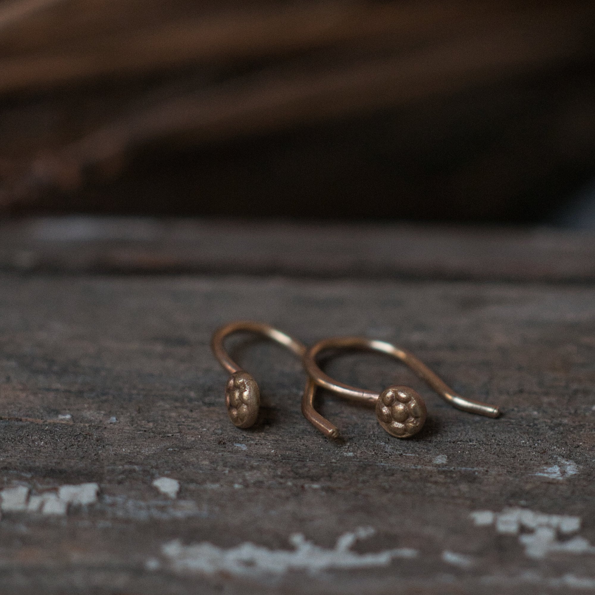 Tiny little yellow gold hook earrings with flower design reminiscent of apotropaic hex signs... protection symbols carved into buildings that often take the form of geometric flowers.