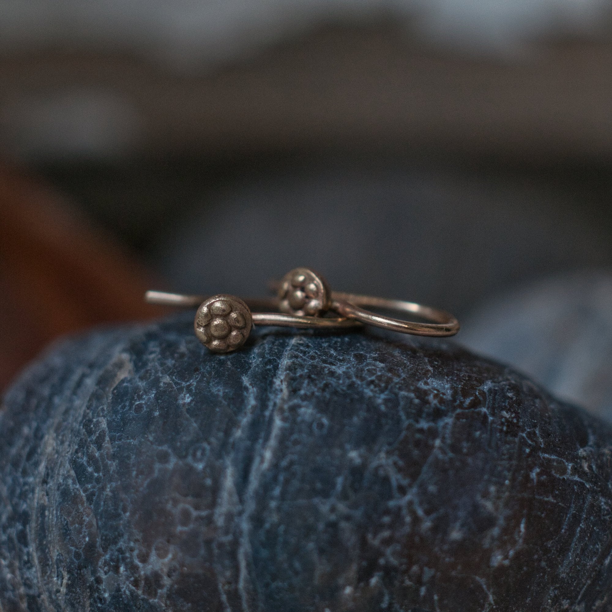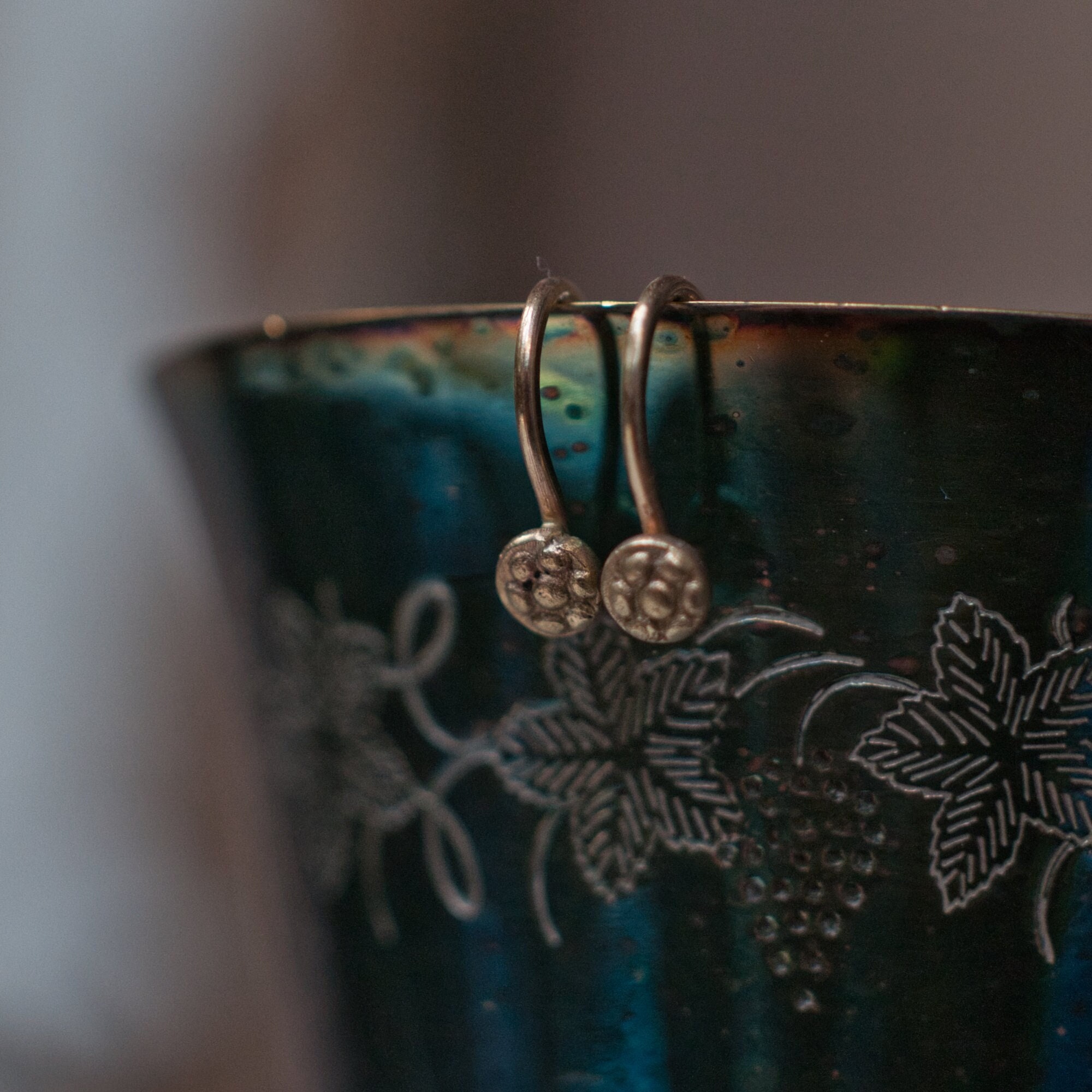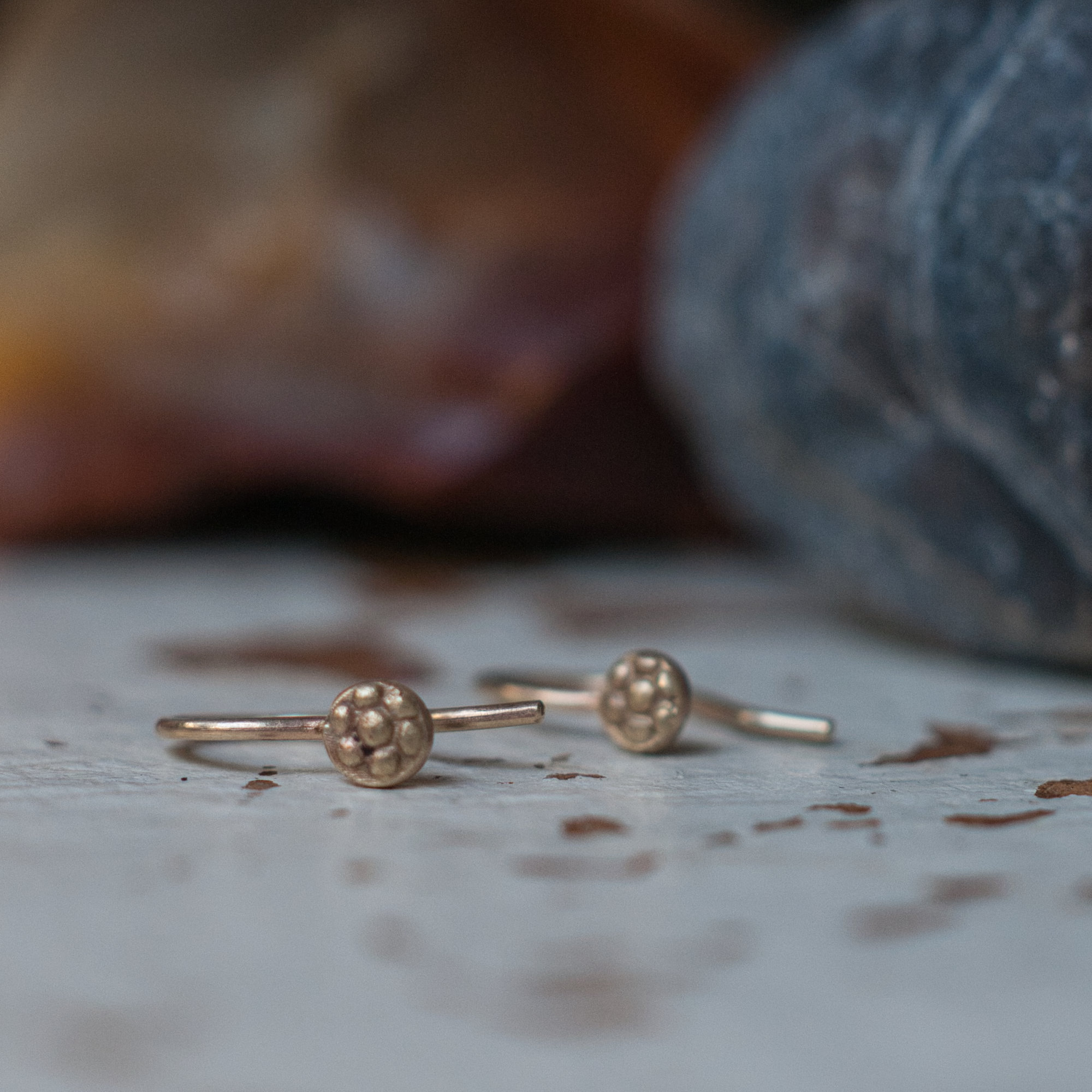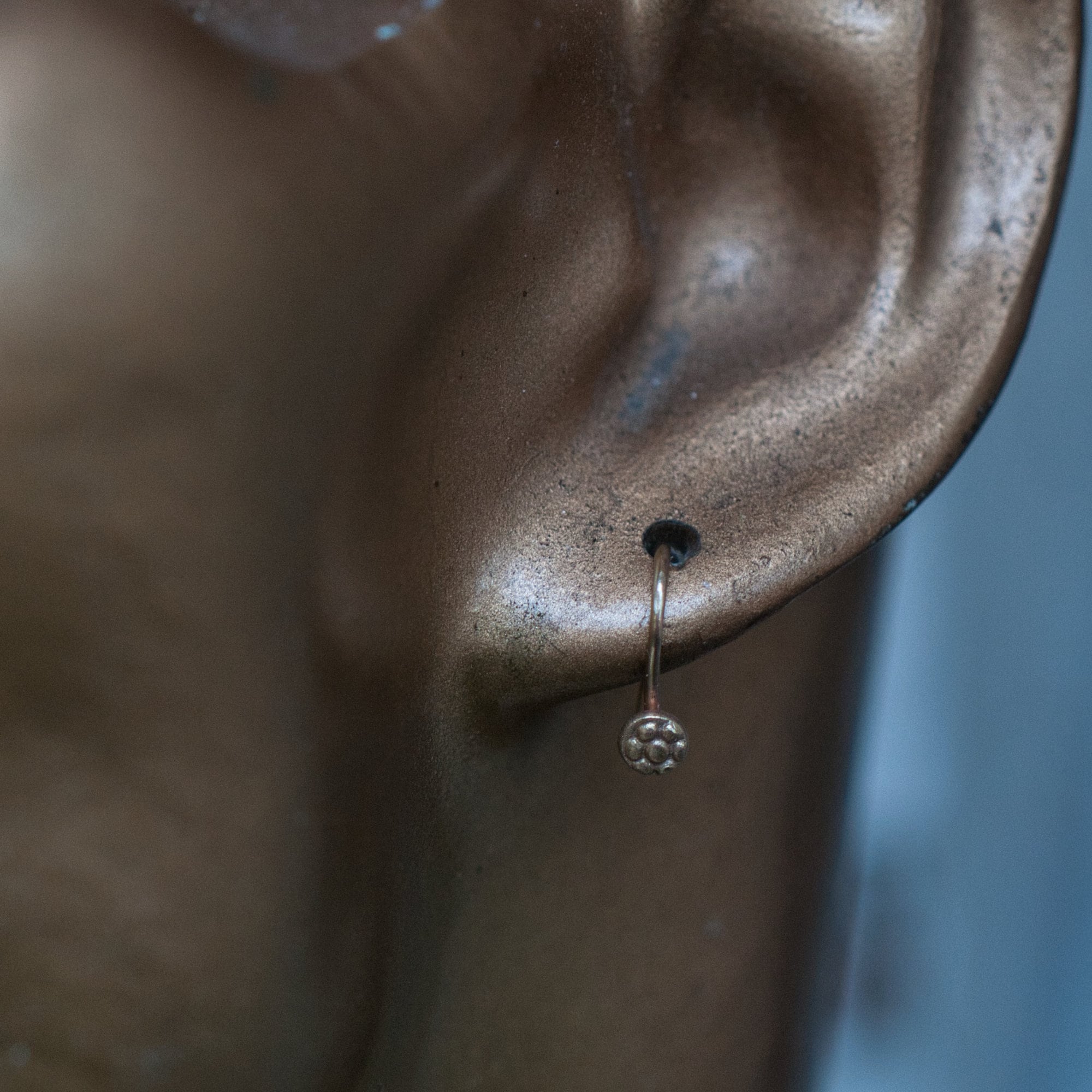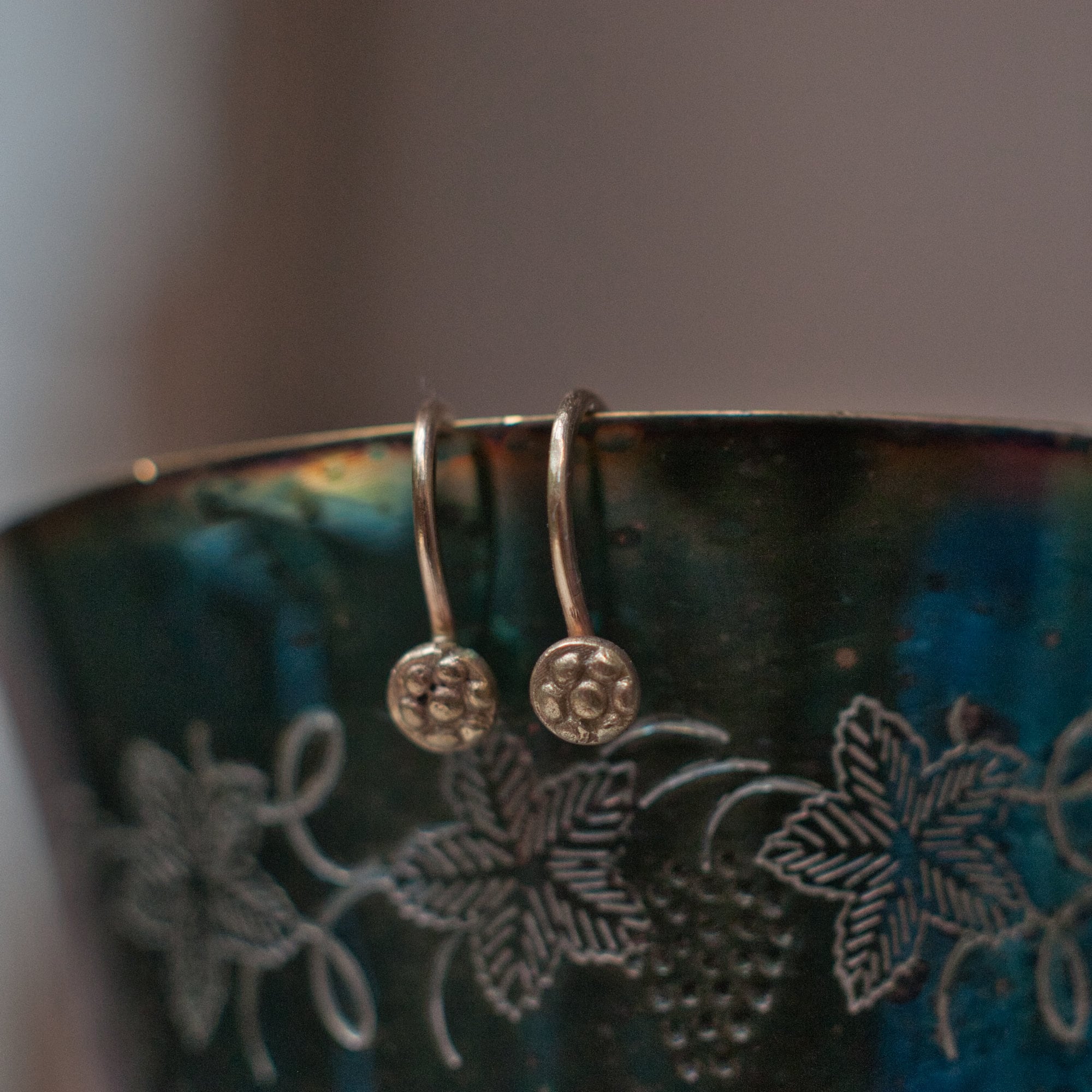 Tiny little yellow gold hook earrings with flower design reminiscent of apotropaic hex signs... protection symbols carved into buildings that often take the form of geometric flowers.