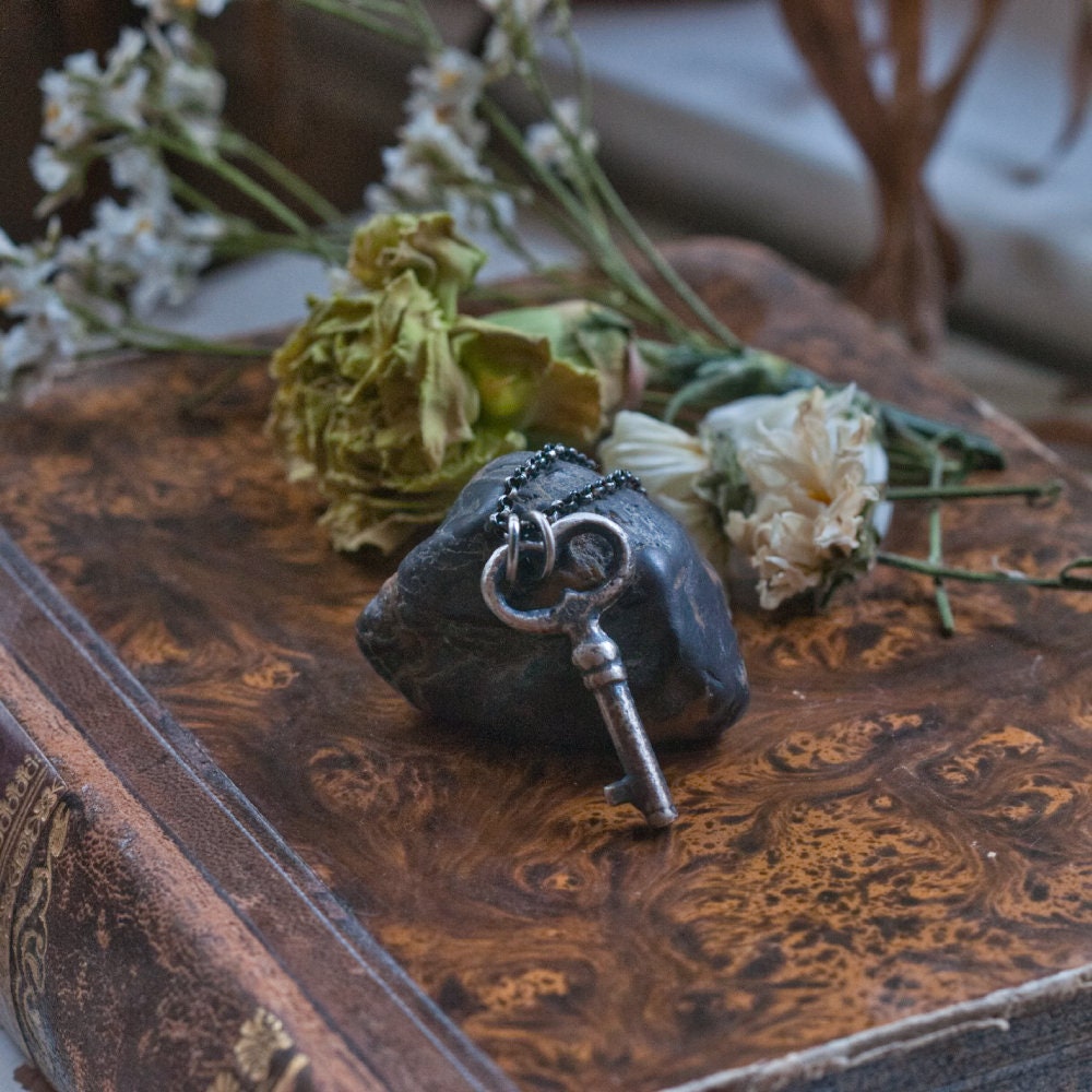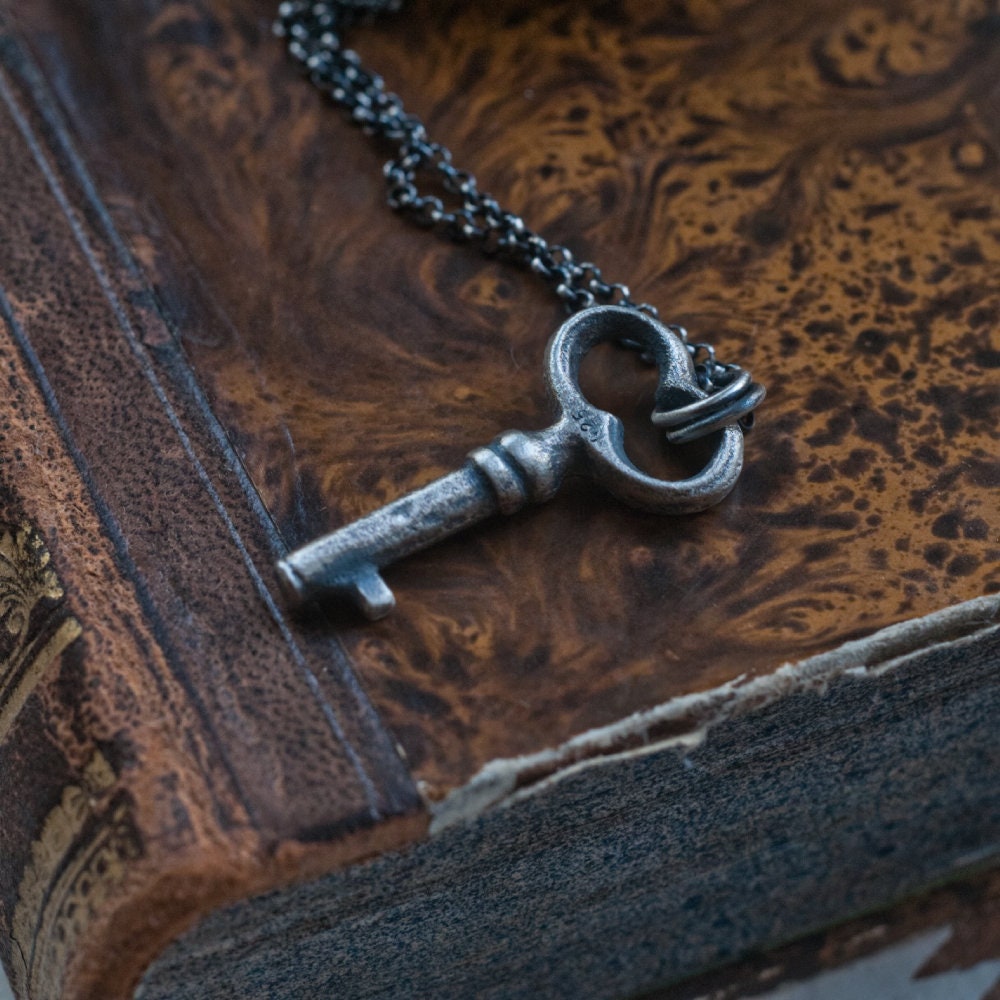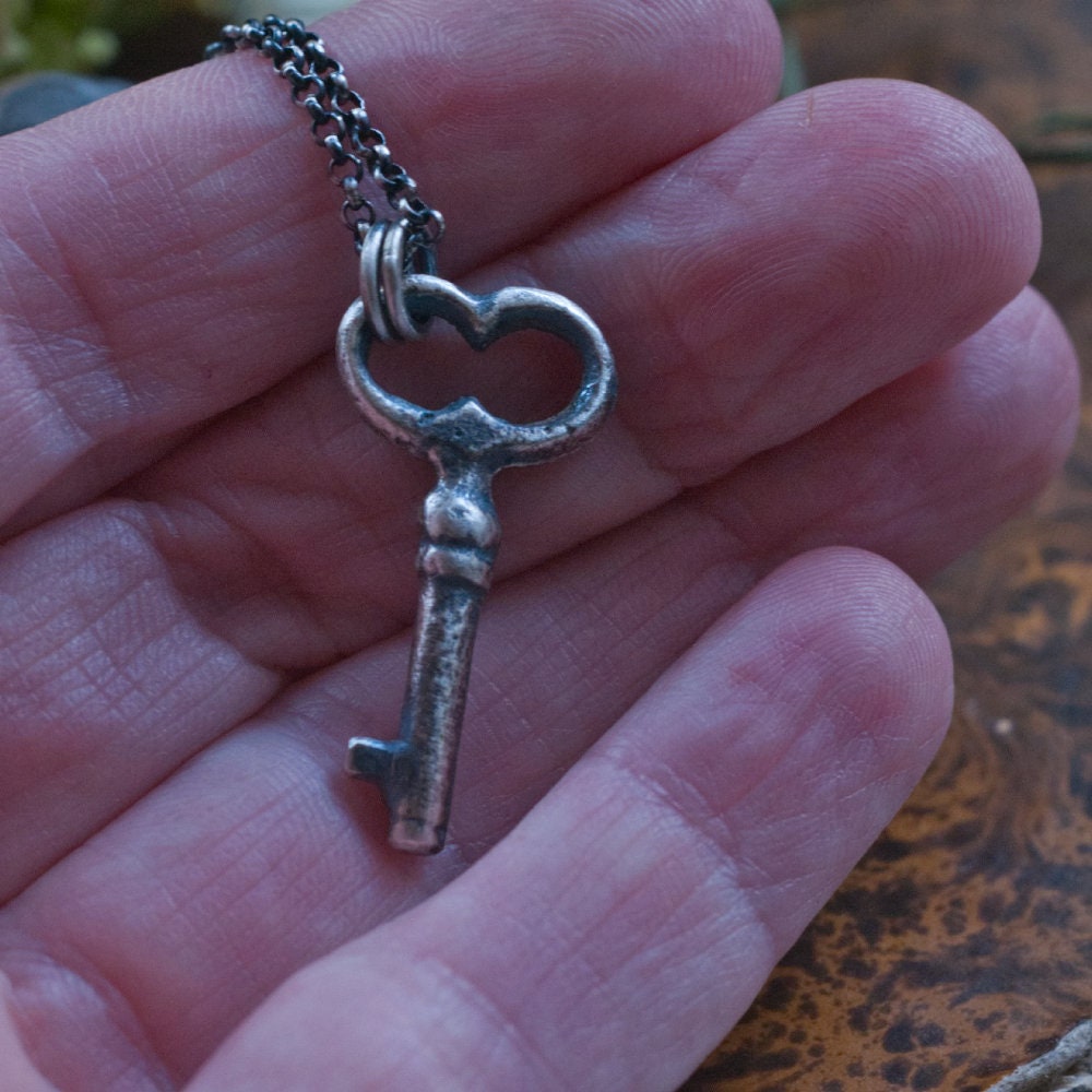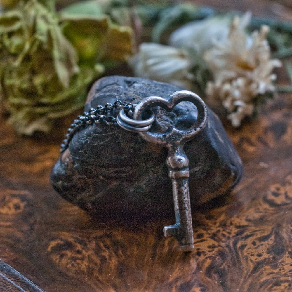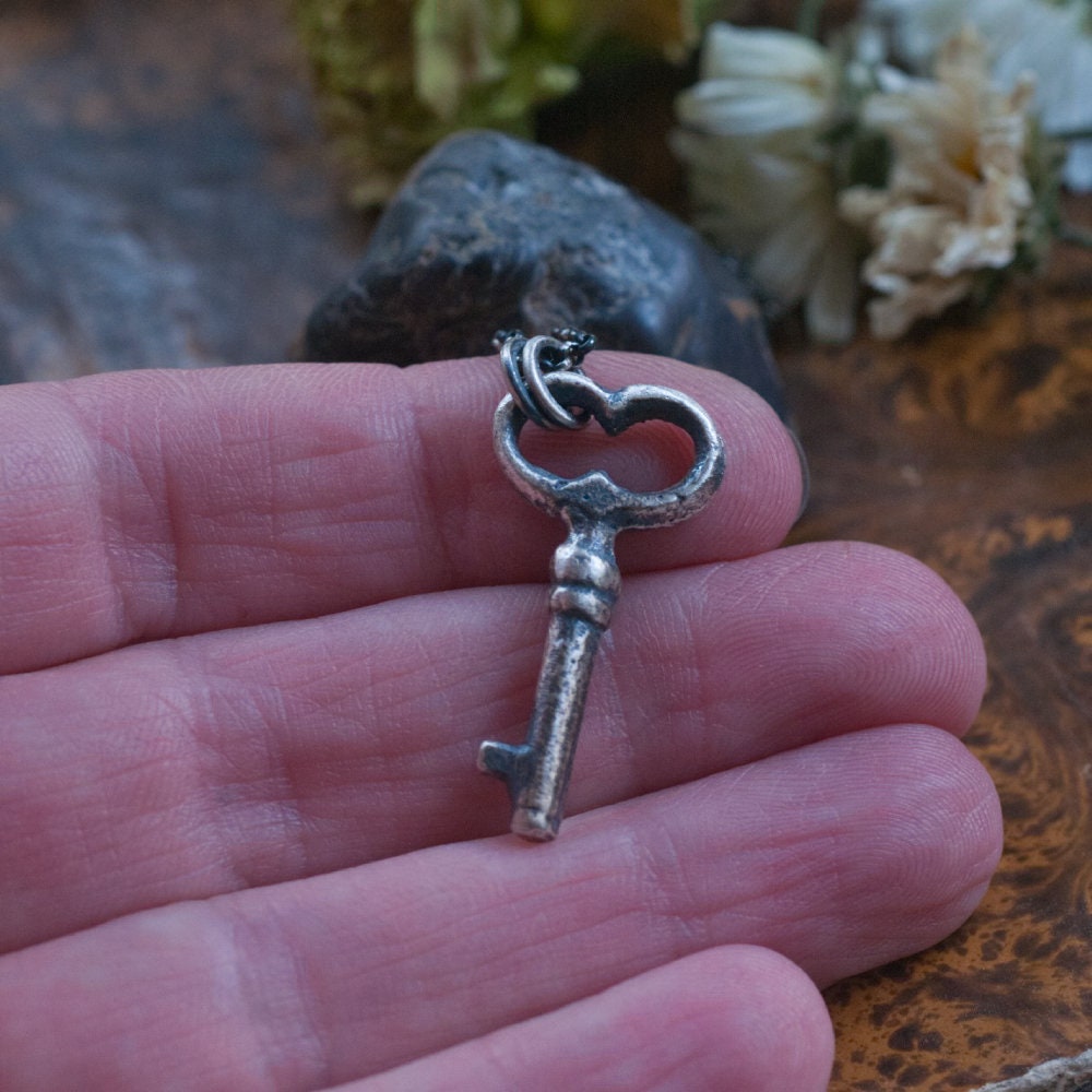 Sterling silver key charm, Hekate amulet, good luck talisman cast from an antique key, oxidised finish, miniature amulet. witch necklace