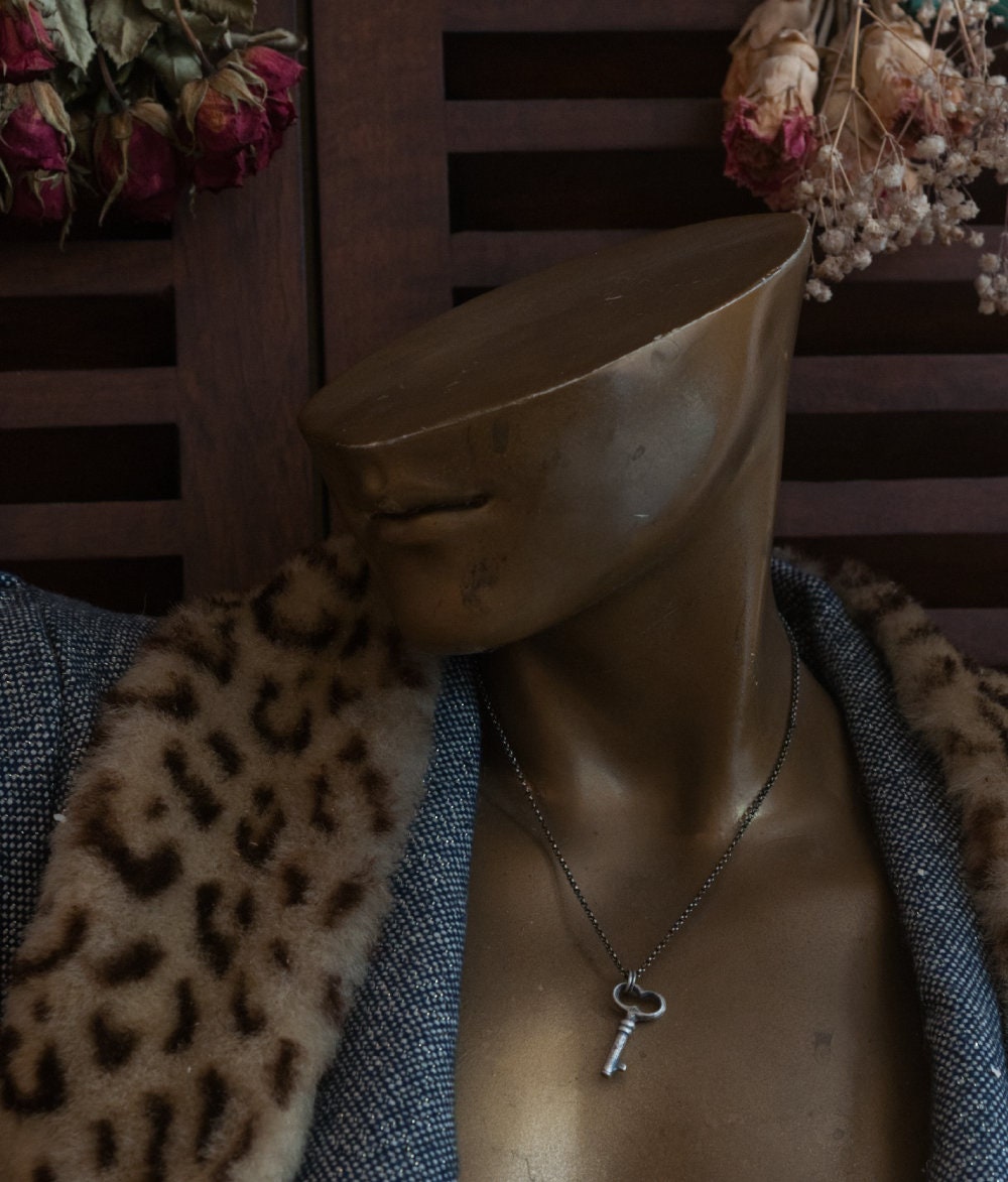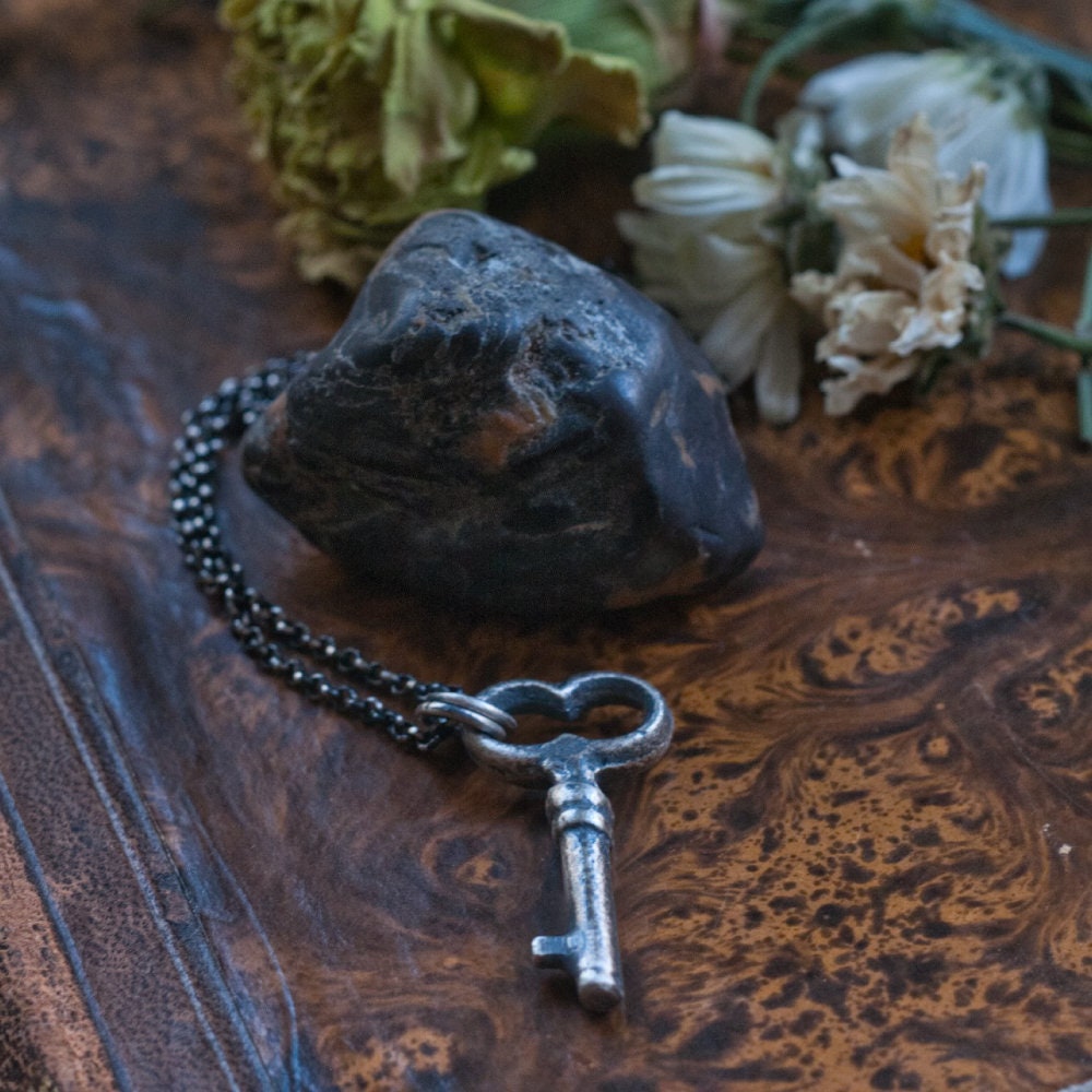 A tiny key, cast in sterling silver from a genuine antique key, rustic and oxidised just like the original and hung from an 16" (41cm) mini rolo chain that closes with a spring ring clasp.