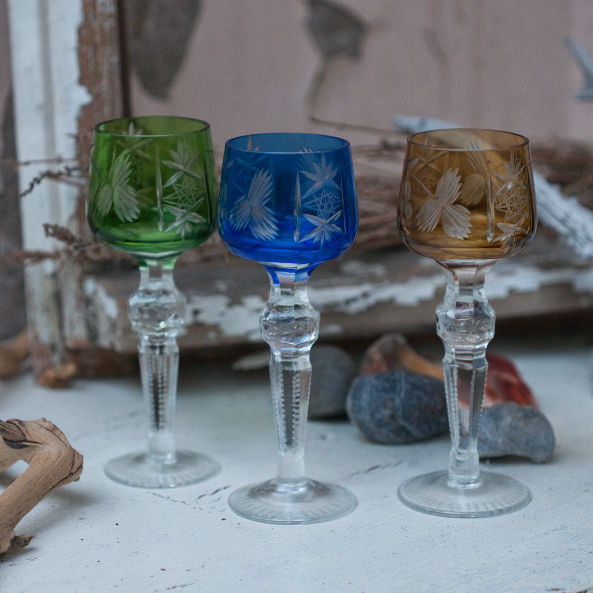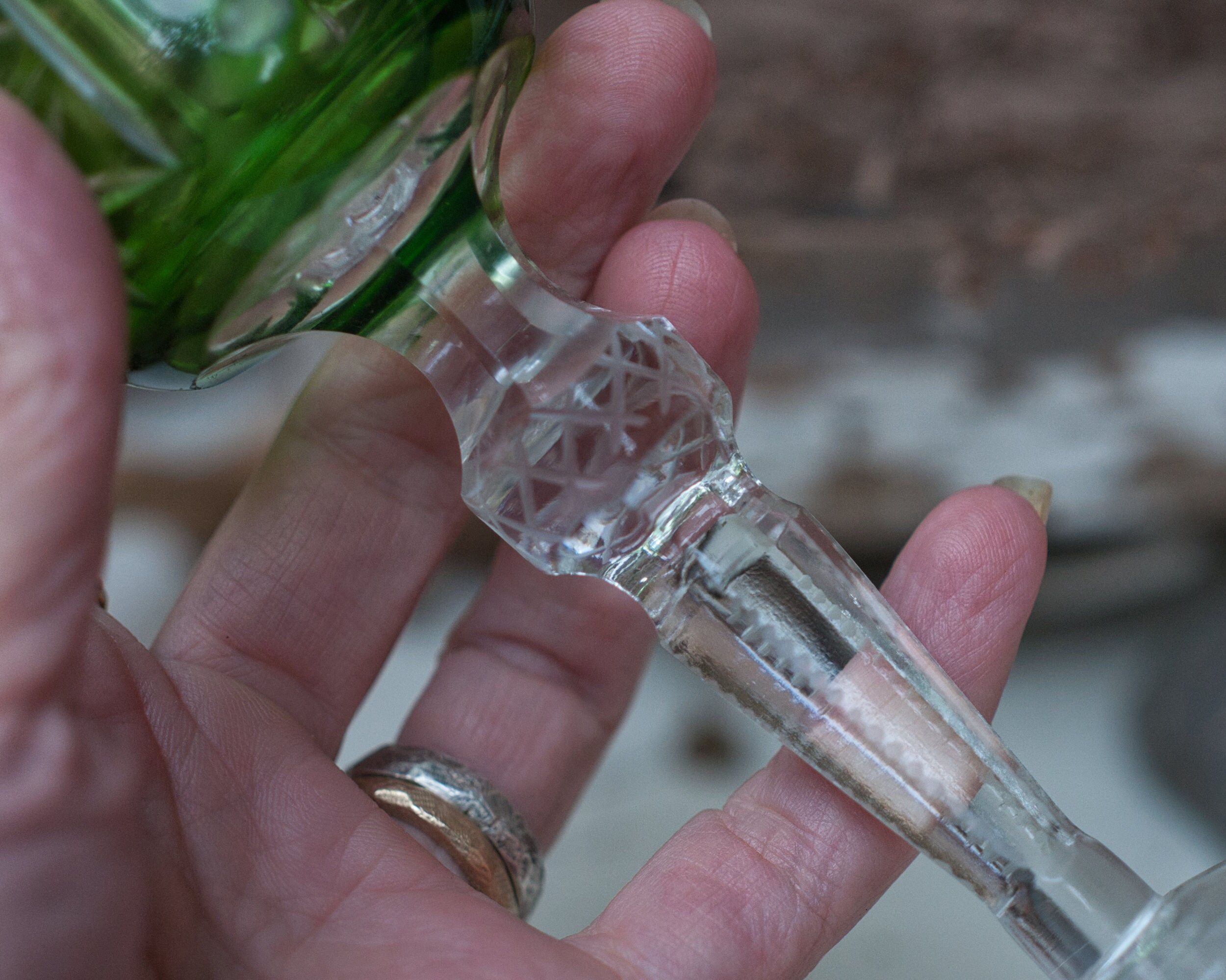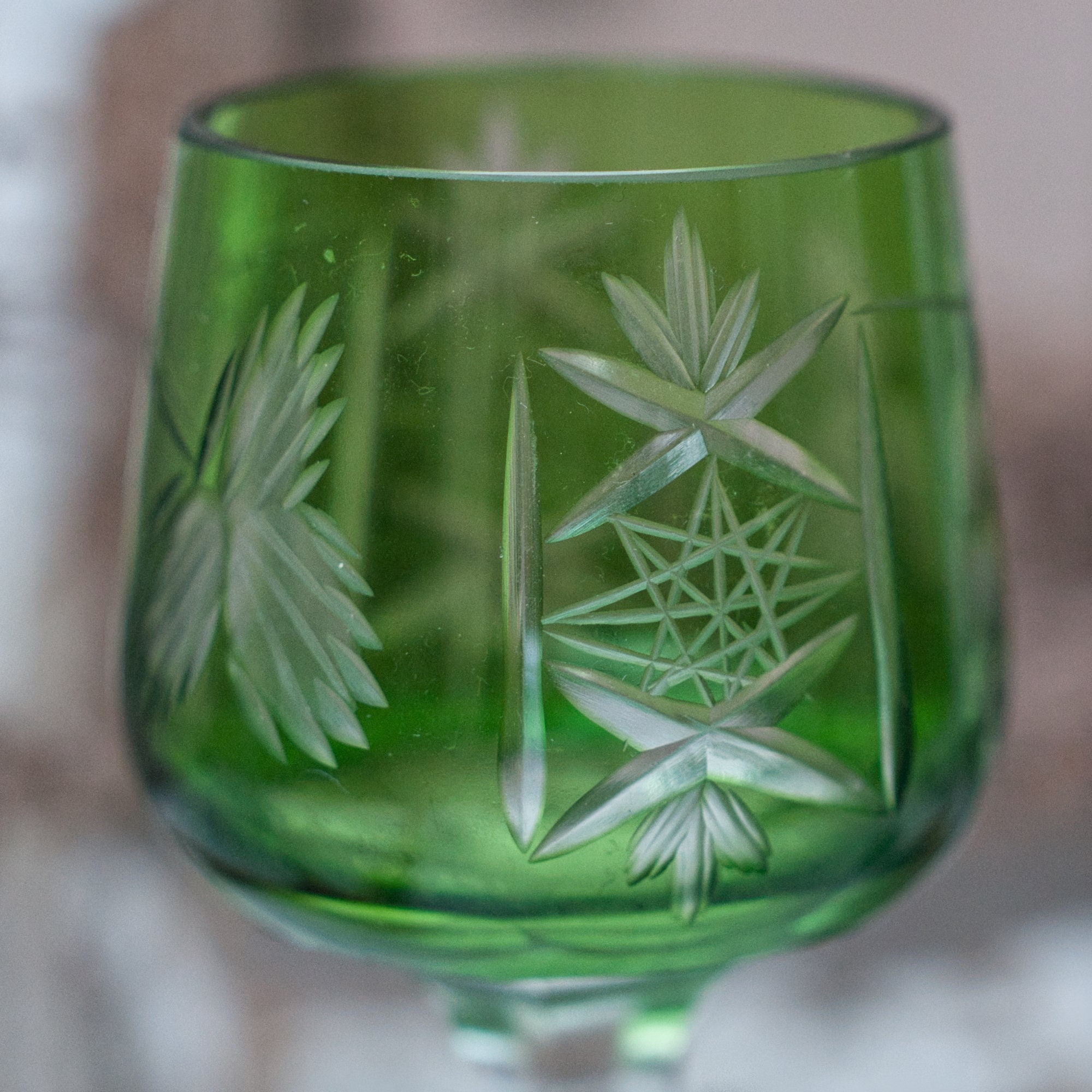This apple green glass goblet is in the Bohemian style popular in Germany all through the 19th and 20th centuries. The quality is excellent with no chips or damage and the starburst, vine leaves and grape decoration is cleanly cut. At 13.5cm high (bowl diameter is 5cm and the base 4.5cm) it's a great size for even small altars and the bright, verdant green coloured glass is a fitting vessel for any magical libation or offering.