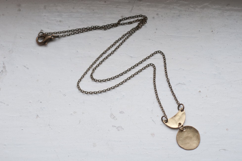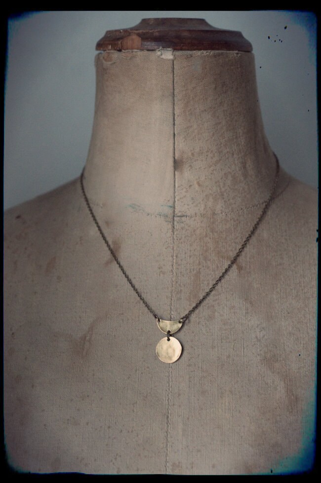 The amulet has been cut from sheet brass or sterling silver and hammered for texture and strength making this is very durable but lightweight necklace... the chain is either aged brass, 16 inches in length with a lobster clasp or for the sterling silver version, a mini belcher with spring ring clasp