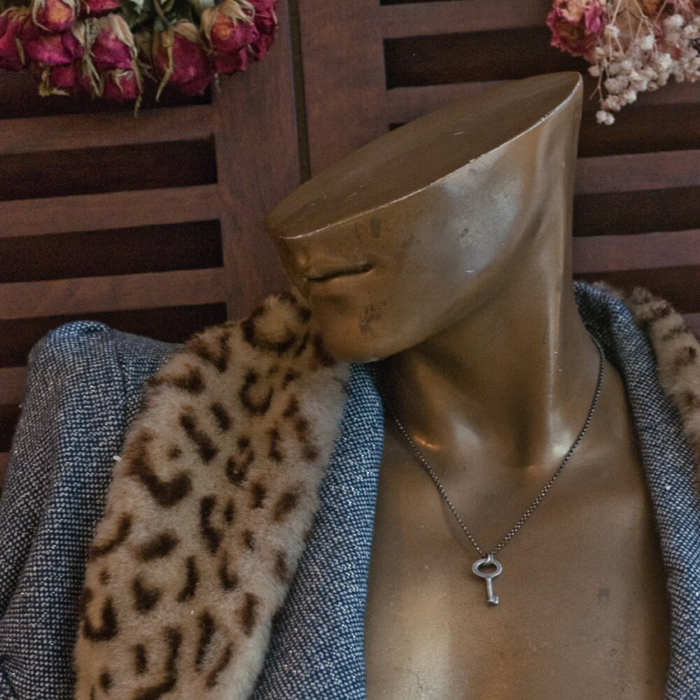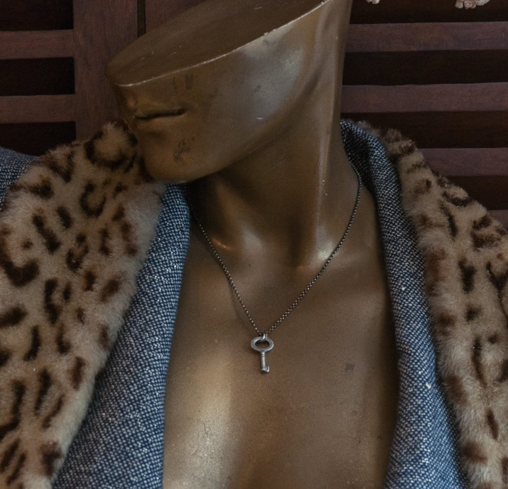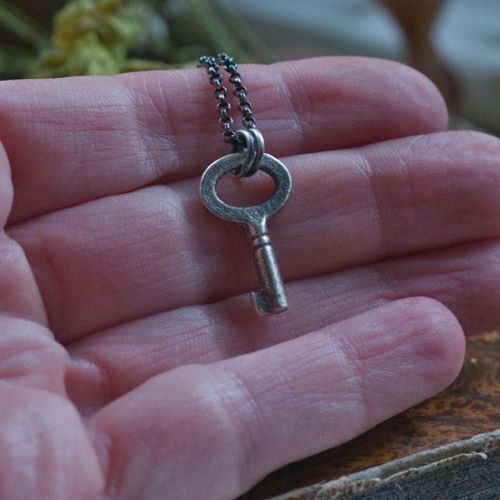 A tiny key, cast in sterling silver from a genuine antique key, rustic and oxidised just like the original and hung from an 16" (41cm) mini rolo chain that closes with a spring ring clasp.