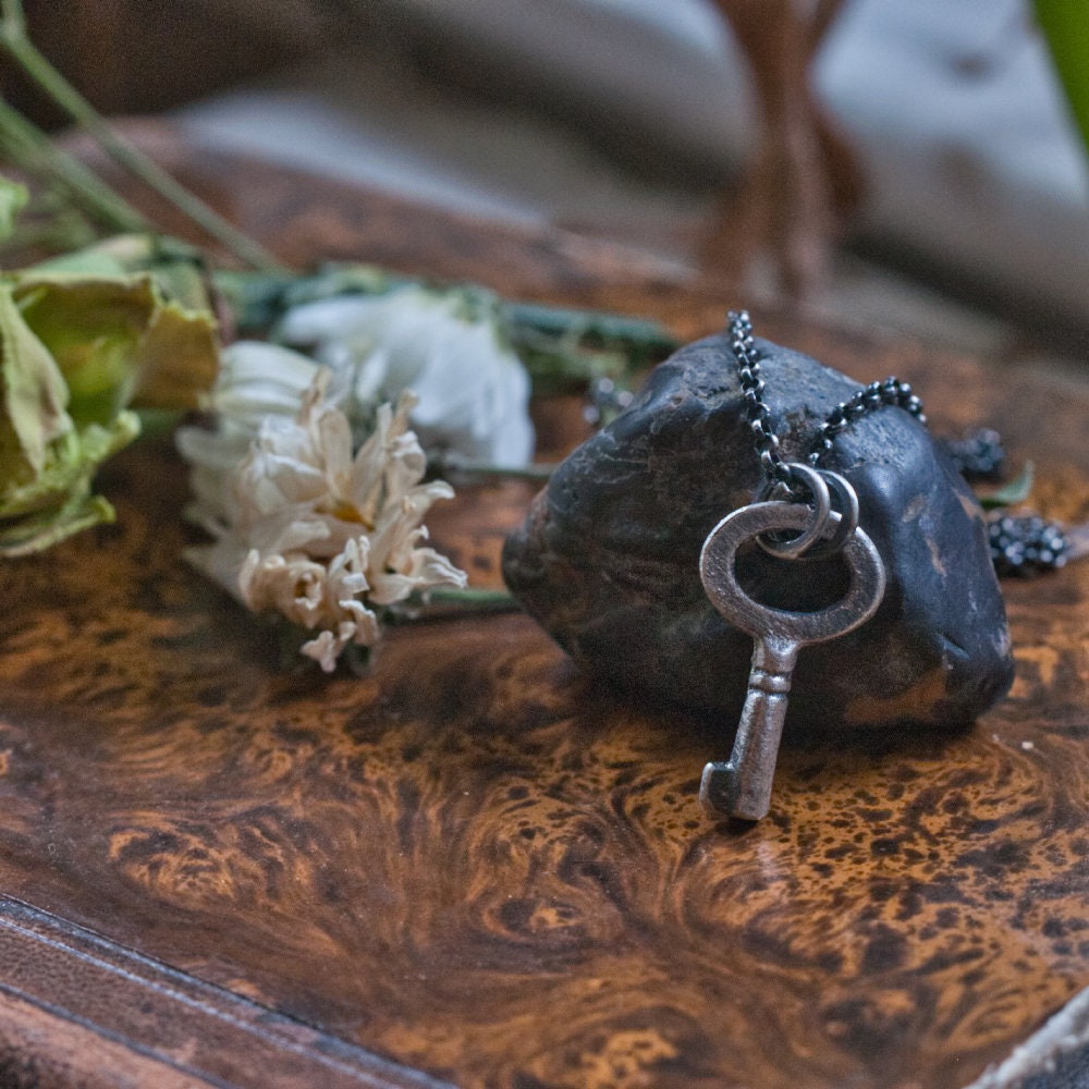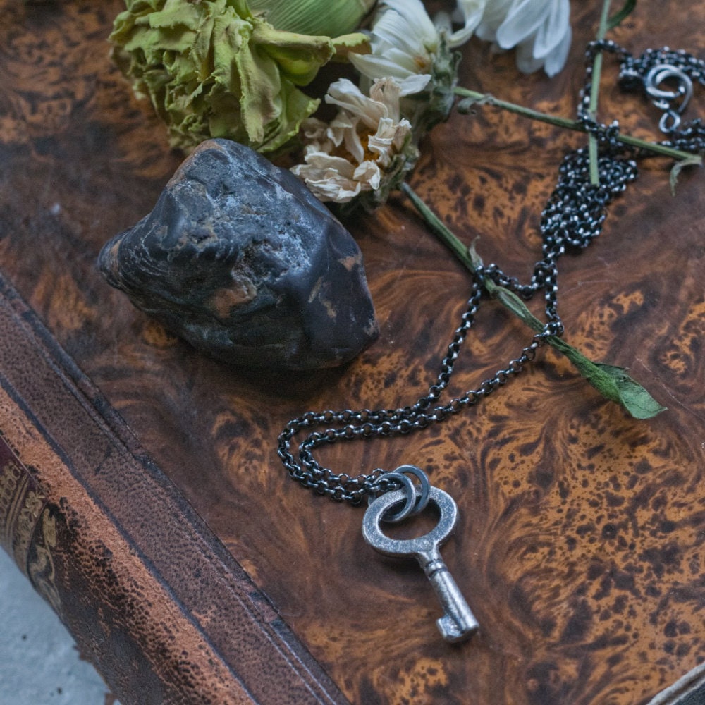 Sterling silver key charm, Hekate amulet, good luck talisman cast from an antique key, oxidised finish, miniature amulet. witch necklace