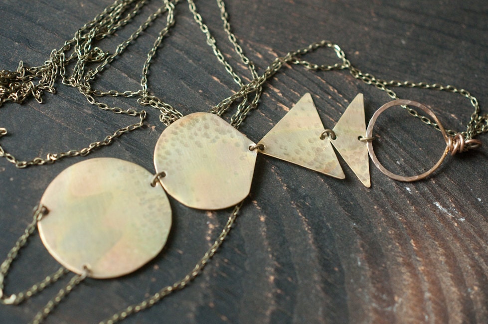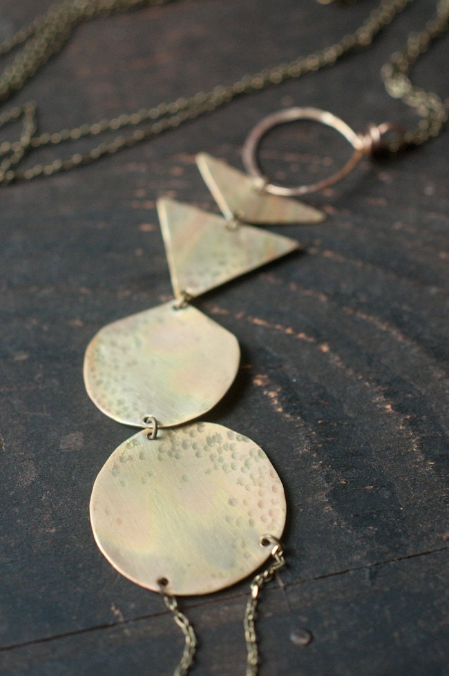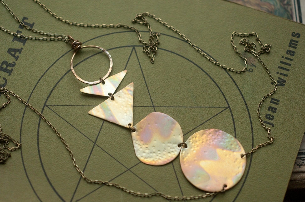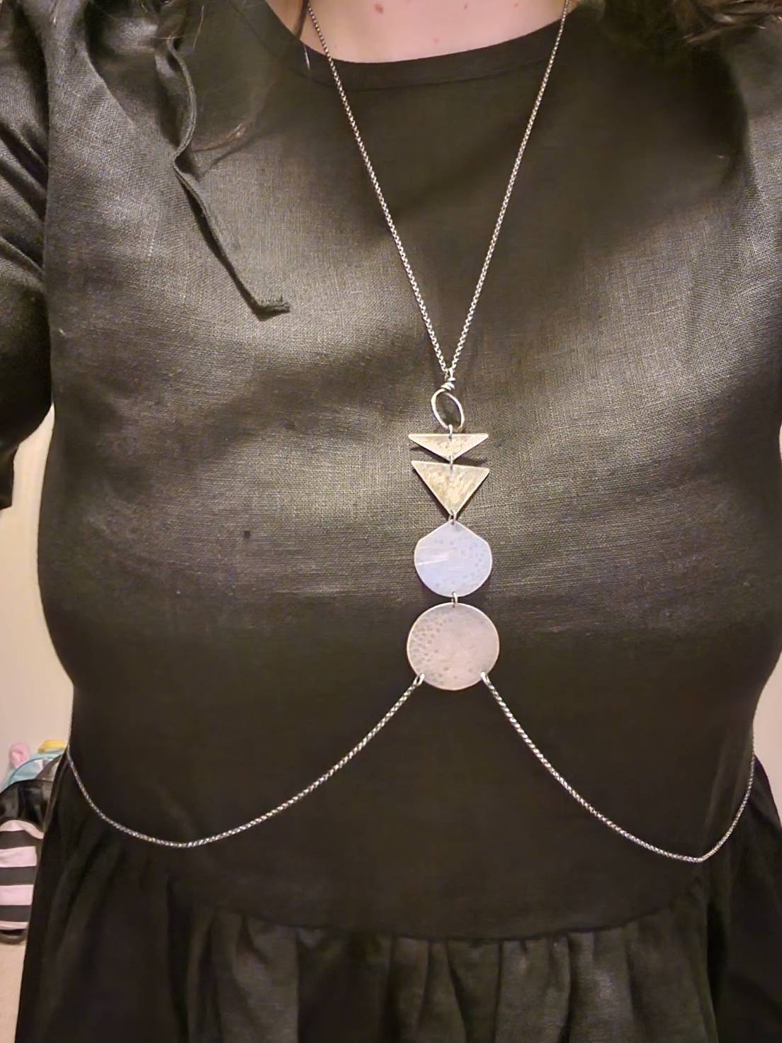 Moon phase, lunar cycle, geometric design body chain, body harness, in hammered brass, fire oxidised for a rainbow patina. Sterling silver option available.