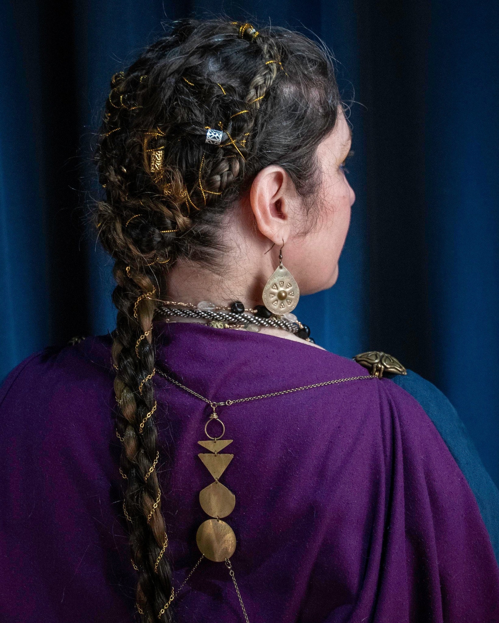 Taking inspiration from the lunar cycle this body chain uses geometric stylised designs to represent the new, crescent, half, gibbous and full moons. Each moon uses hand cut and hammered 0.5 mm sheet brass (the new moon is fabricated from 18 gauge brass wire) that has been cleansed in fire giving it a rainbow patina.