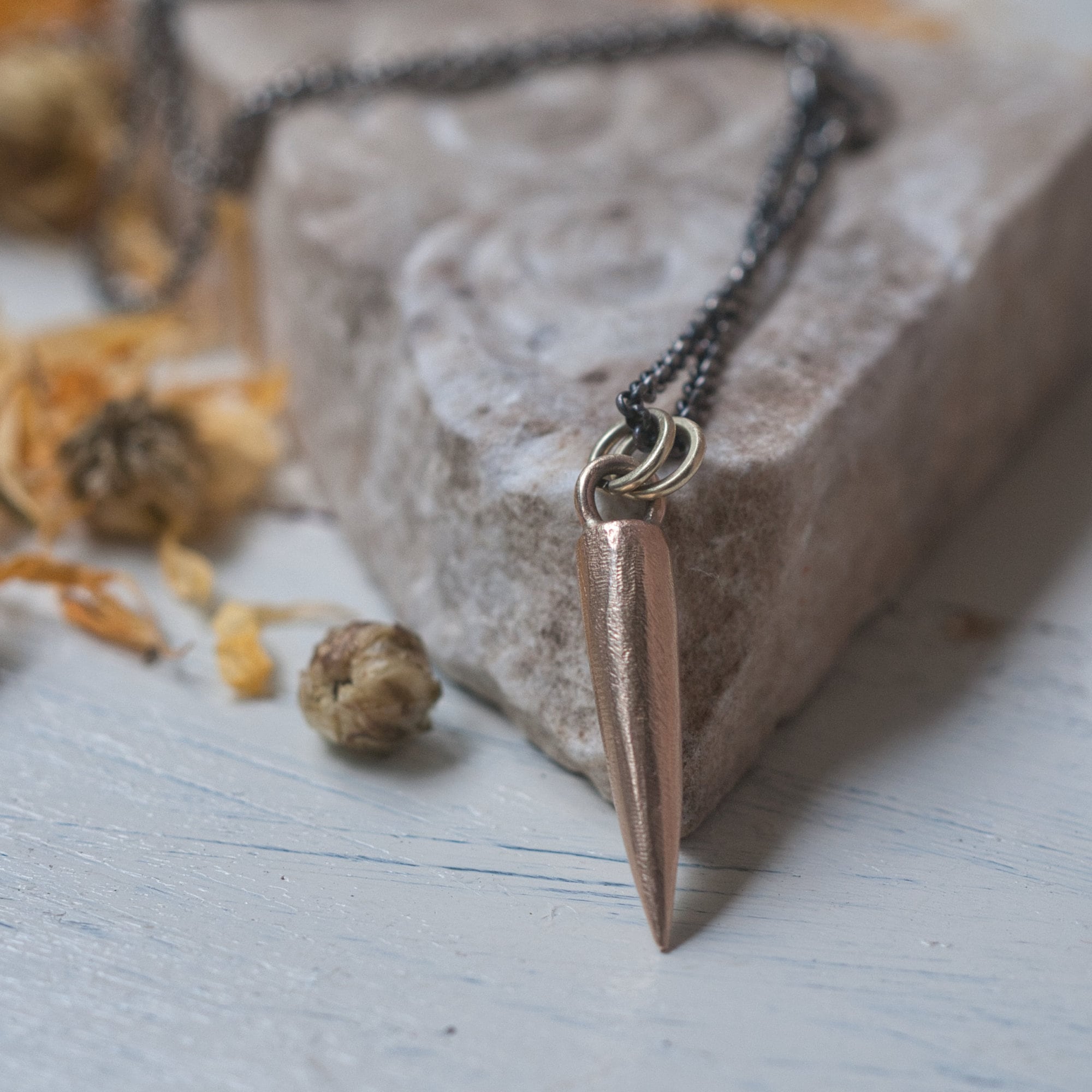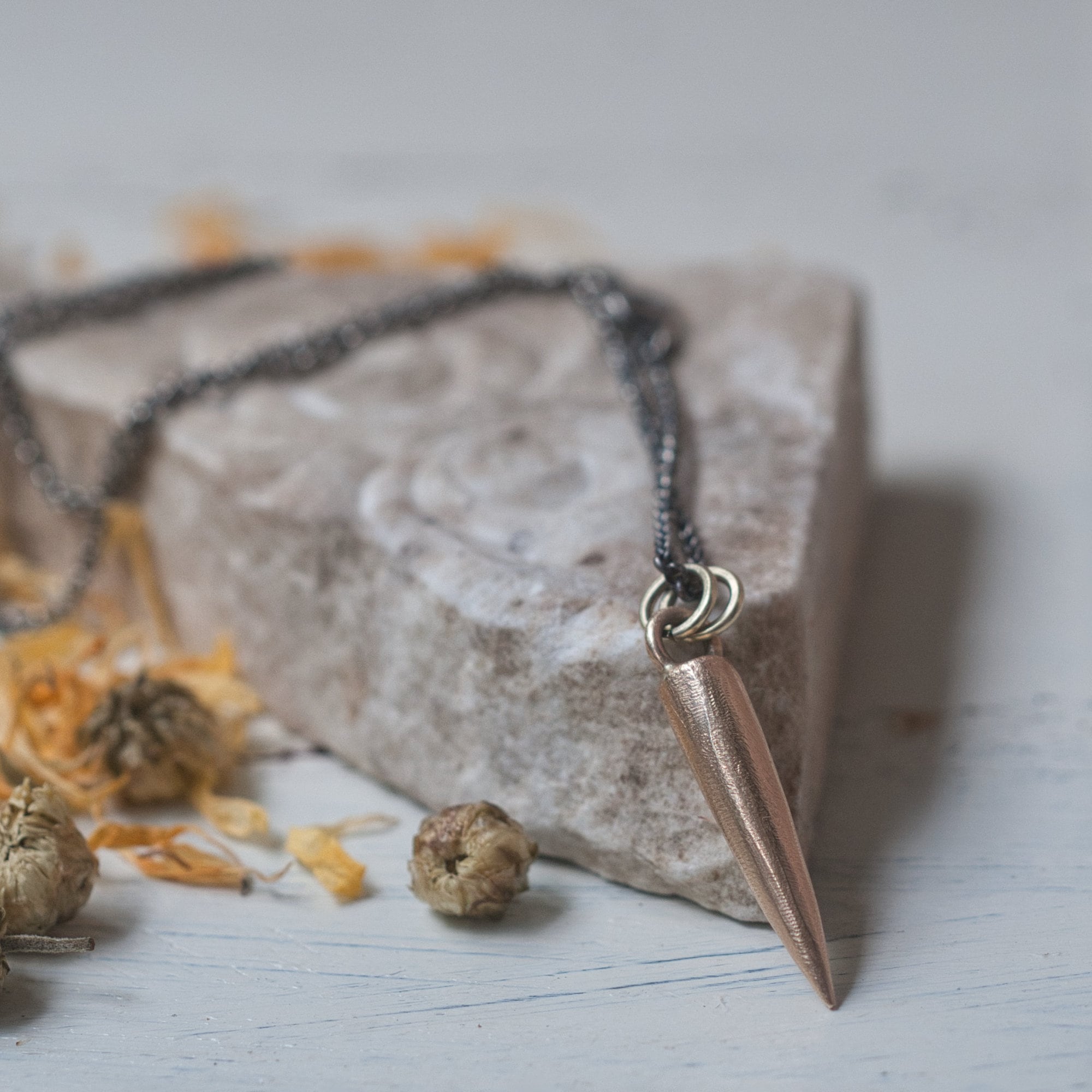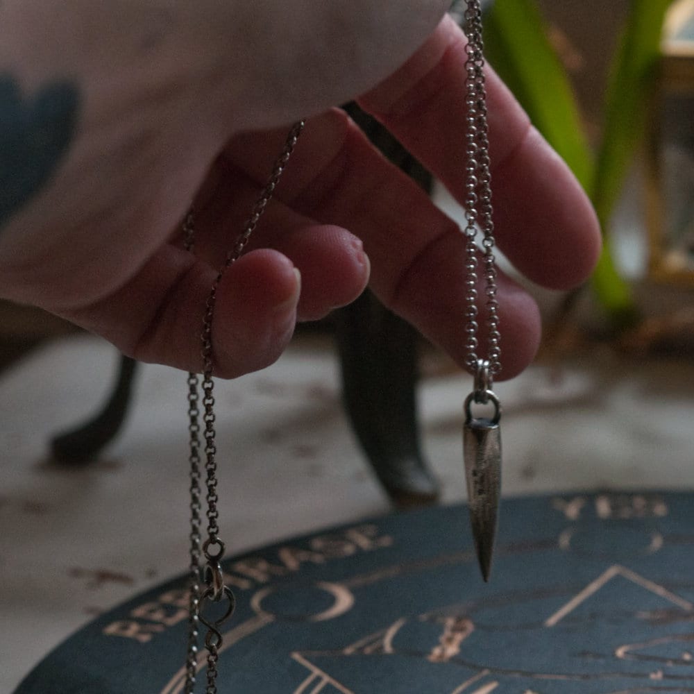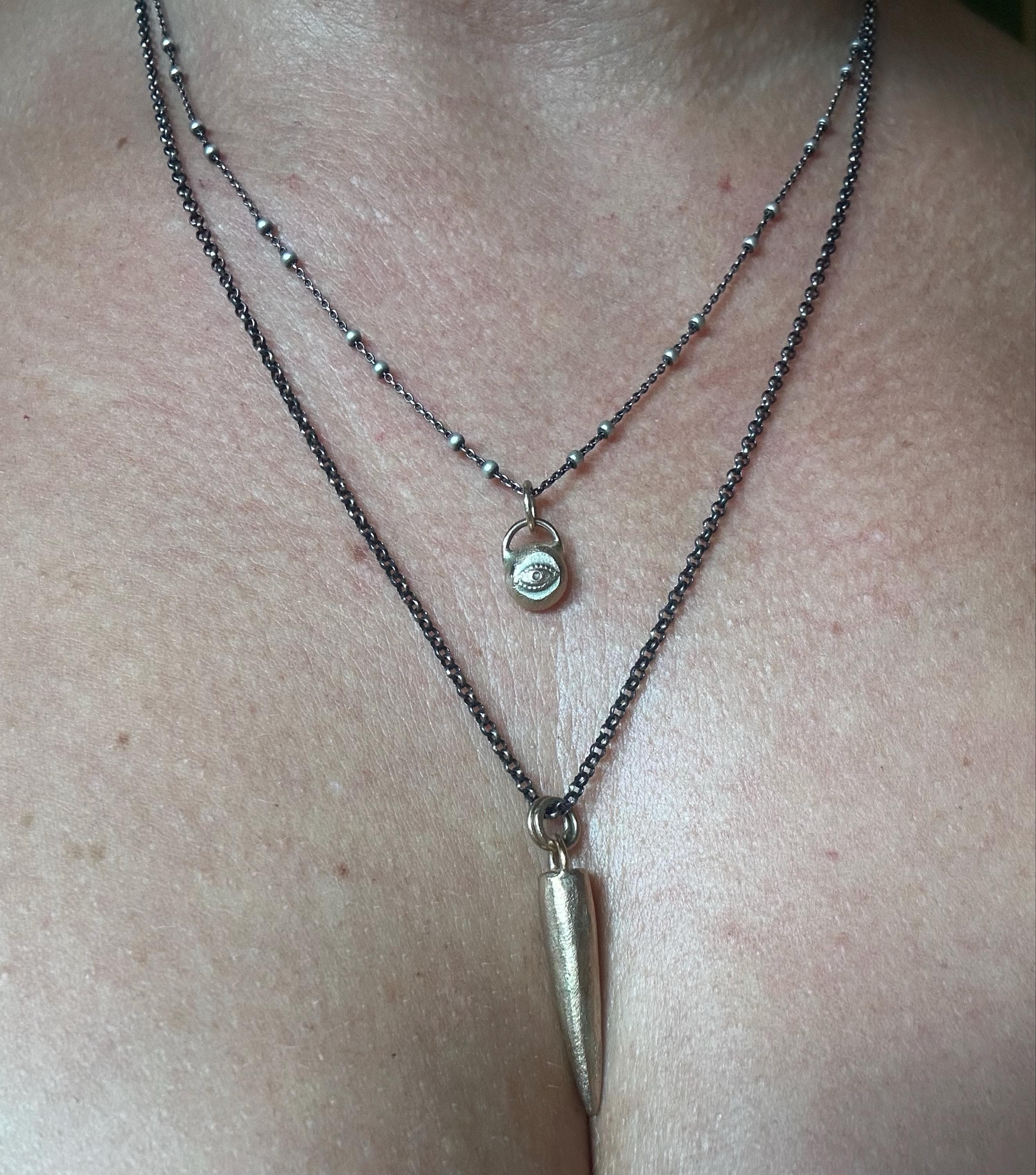 3.5cm pendant (the spike itself is 2.5cm x 0.5cm) with a 22" antiqued sterling silver chain.