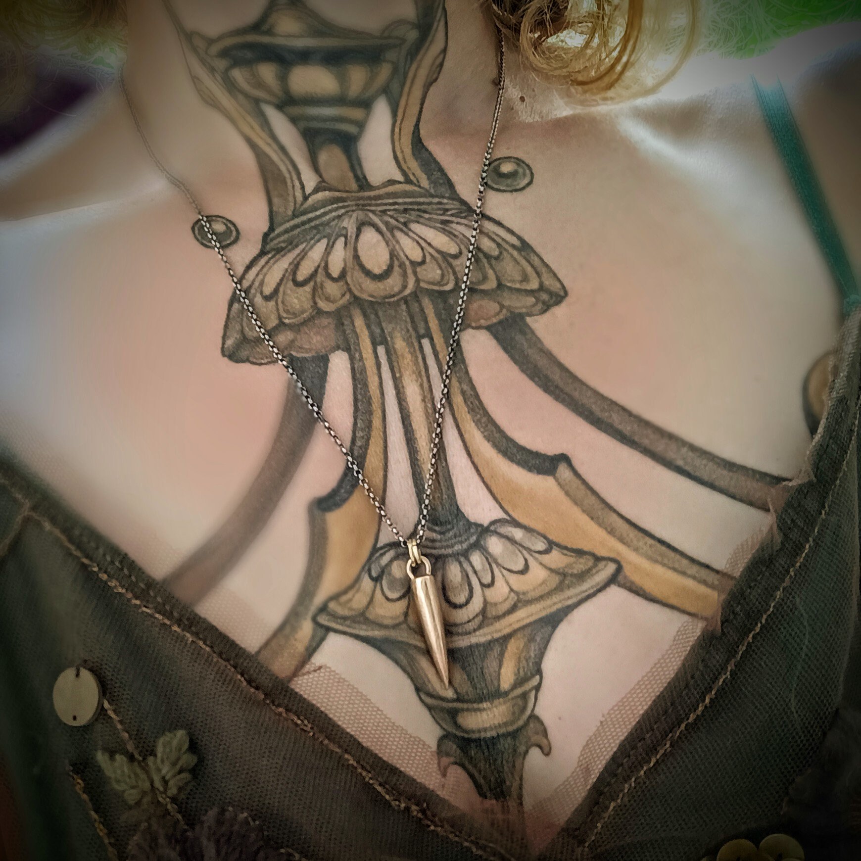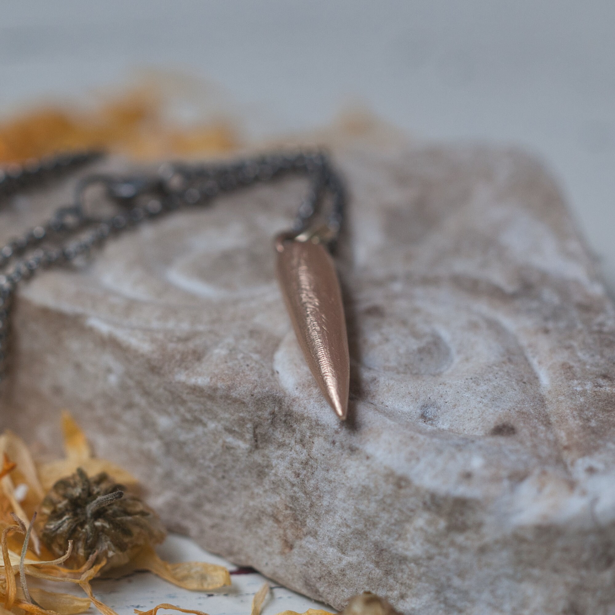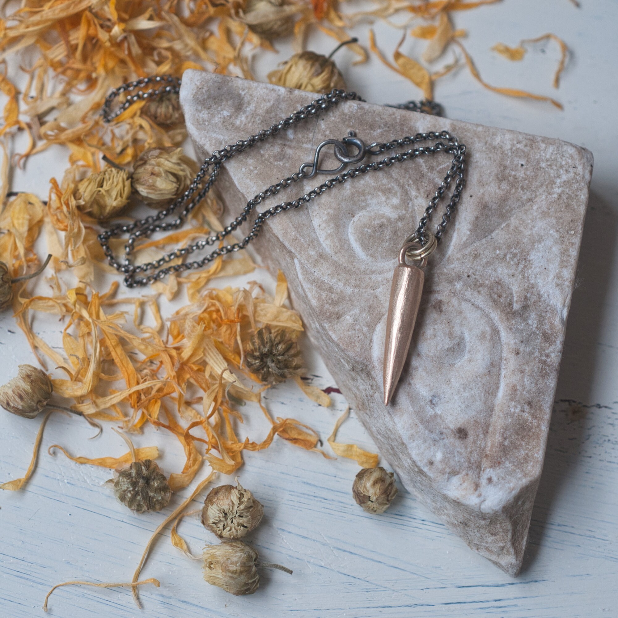 3.5cm pendant (the spike itself is 2.5cm x 0.5cm) with a 22" antiqued sterling silver chain.