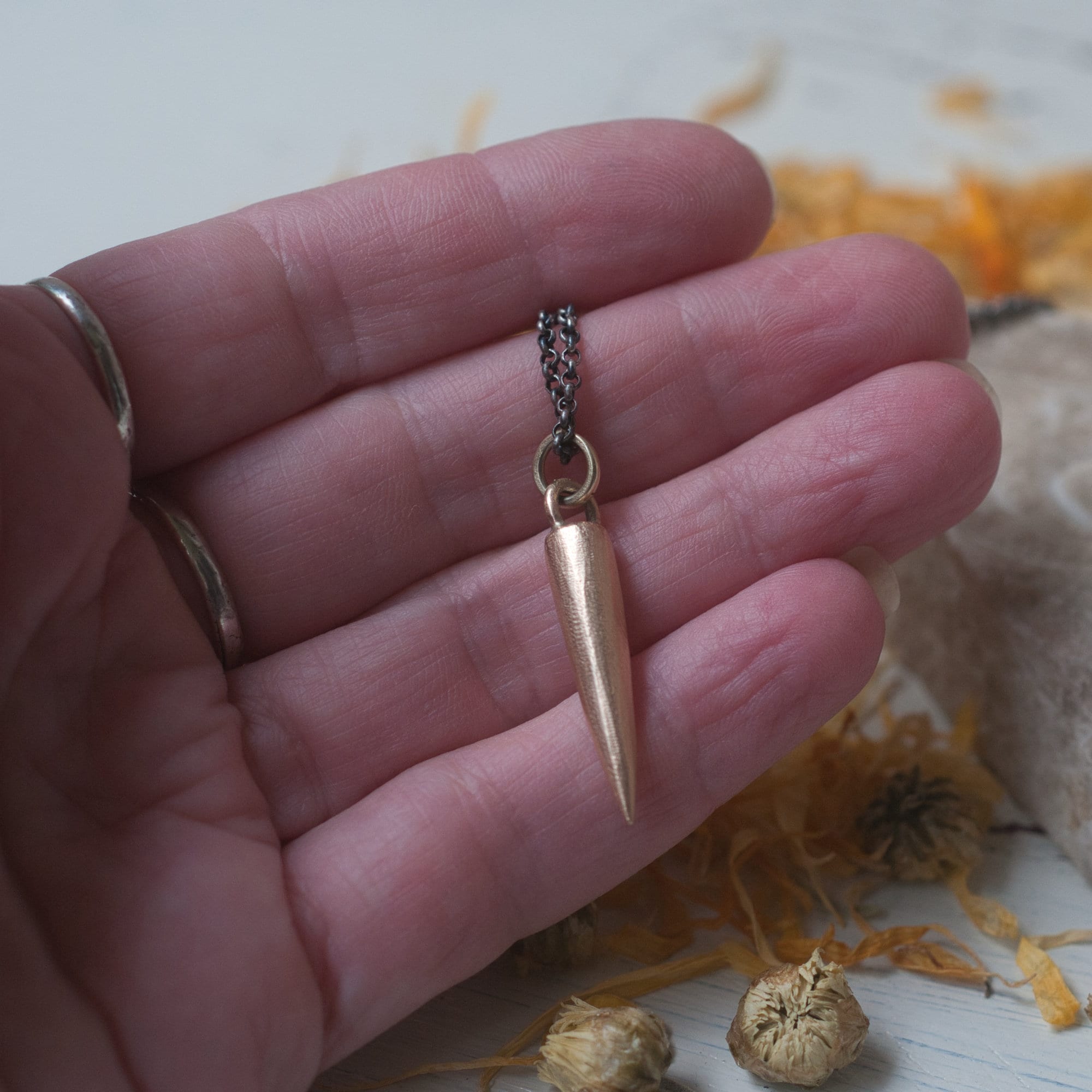 This solid .333 yellow gold pendulum has been cast from a hand carved spike and sand cast for a rustic and primitive finish.