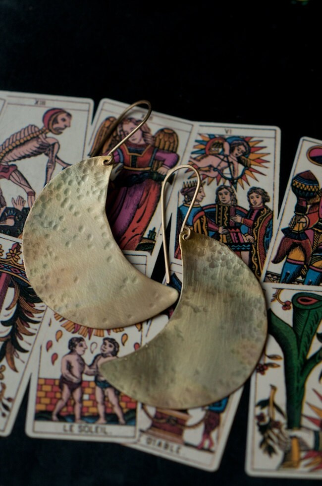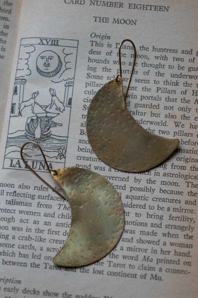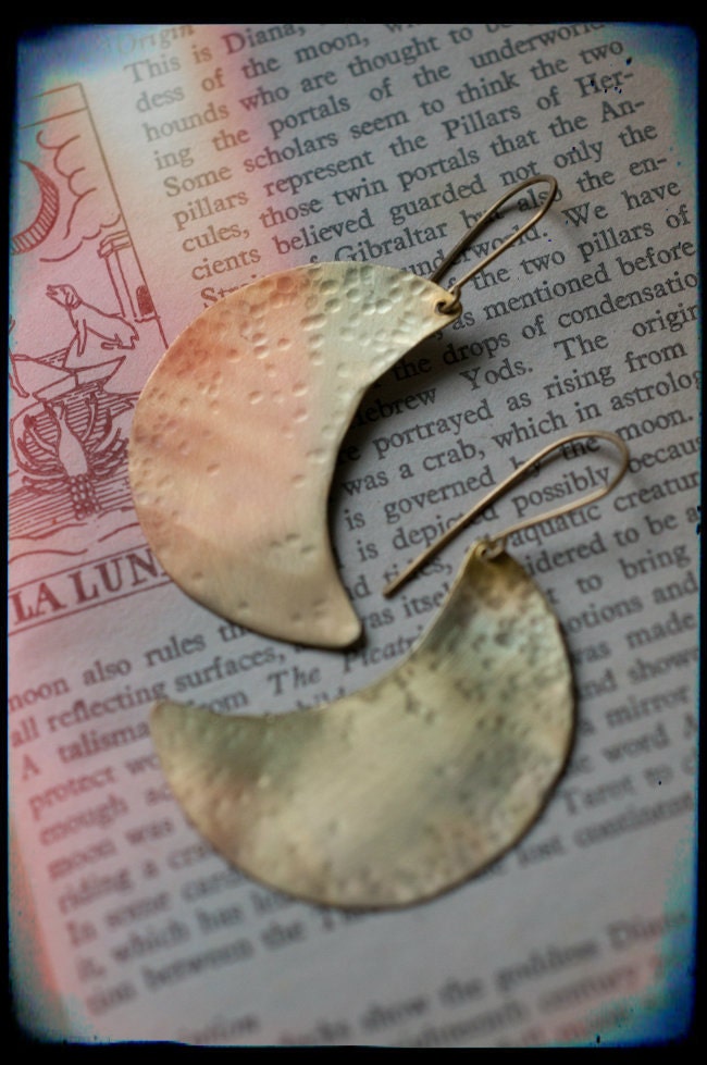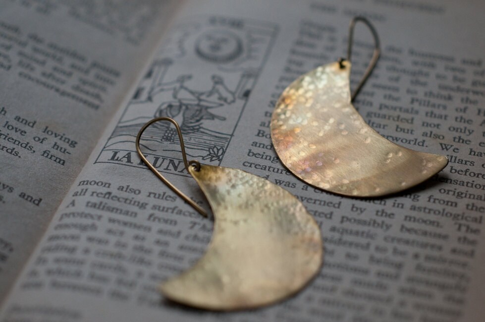A simple but dynamic design of a crescent moon, hand cut from 0.5 mm sheet brass, hammered for strength and texture and then bathed in fire for a subtle rainbow patina. The perfect accompaniment to a number of my moon inspired necklaces.