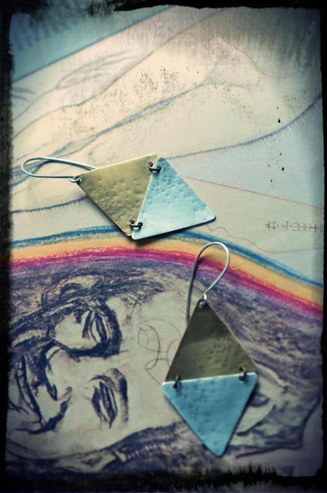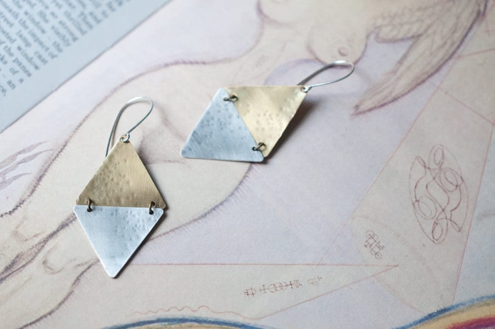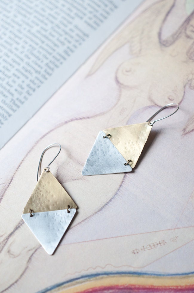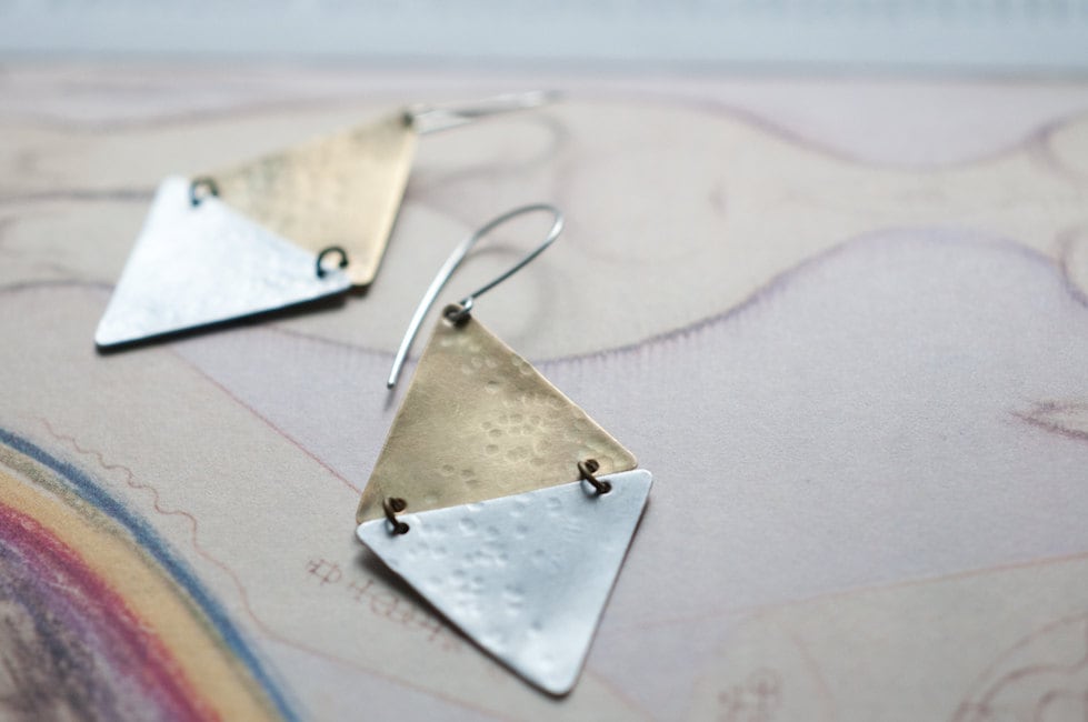 Fire and water, masculine and feminine, geometric earrings, triangle earrings, mixed metal, brass and .935 silver, sterling silver ear hooks.
