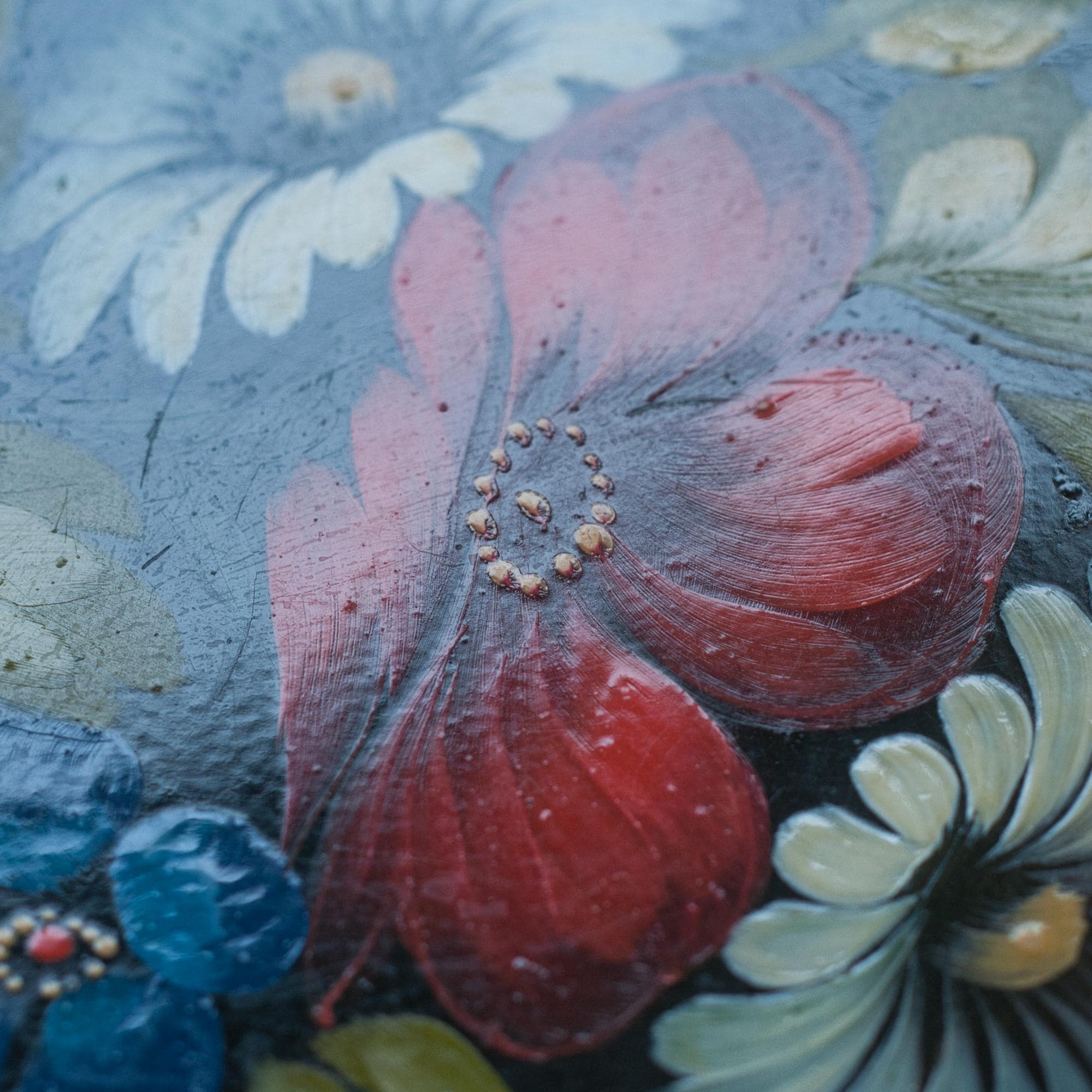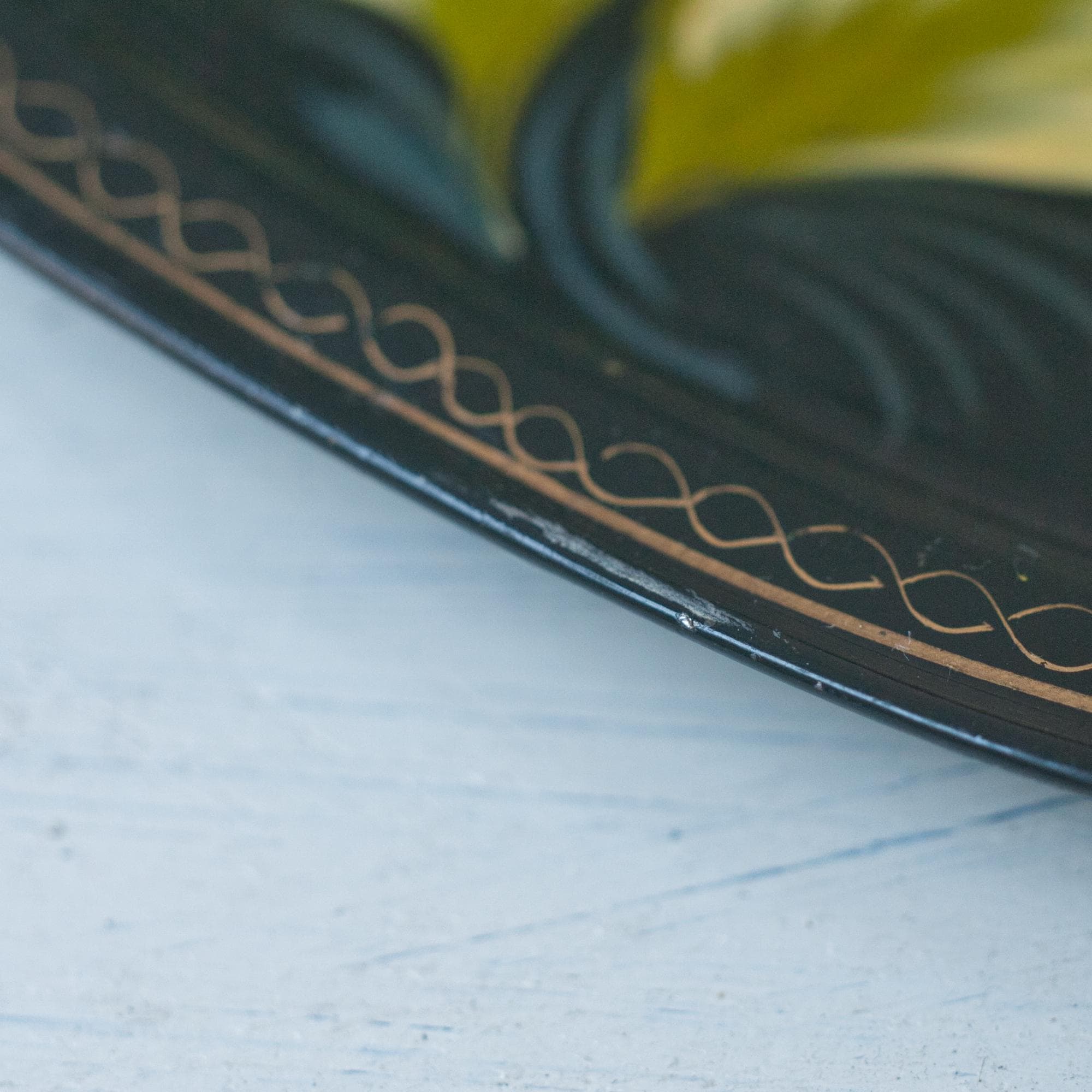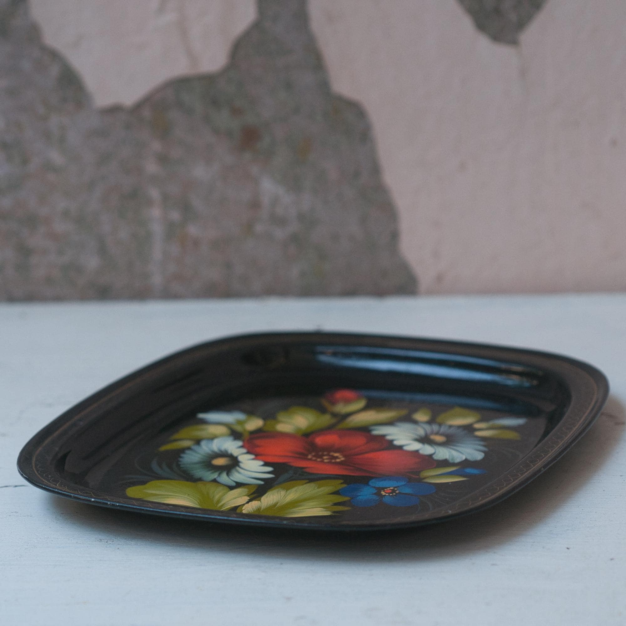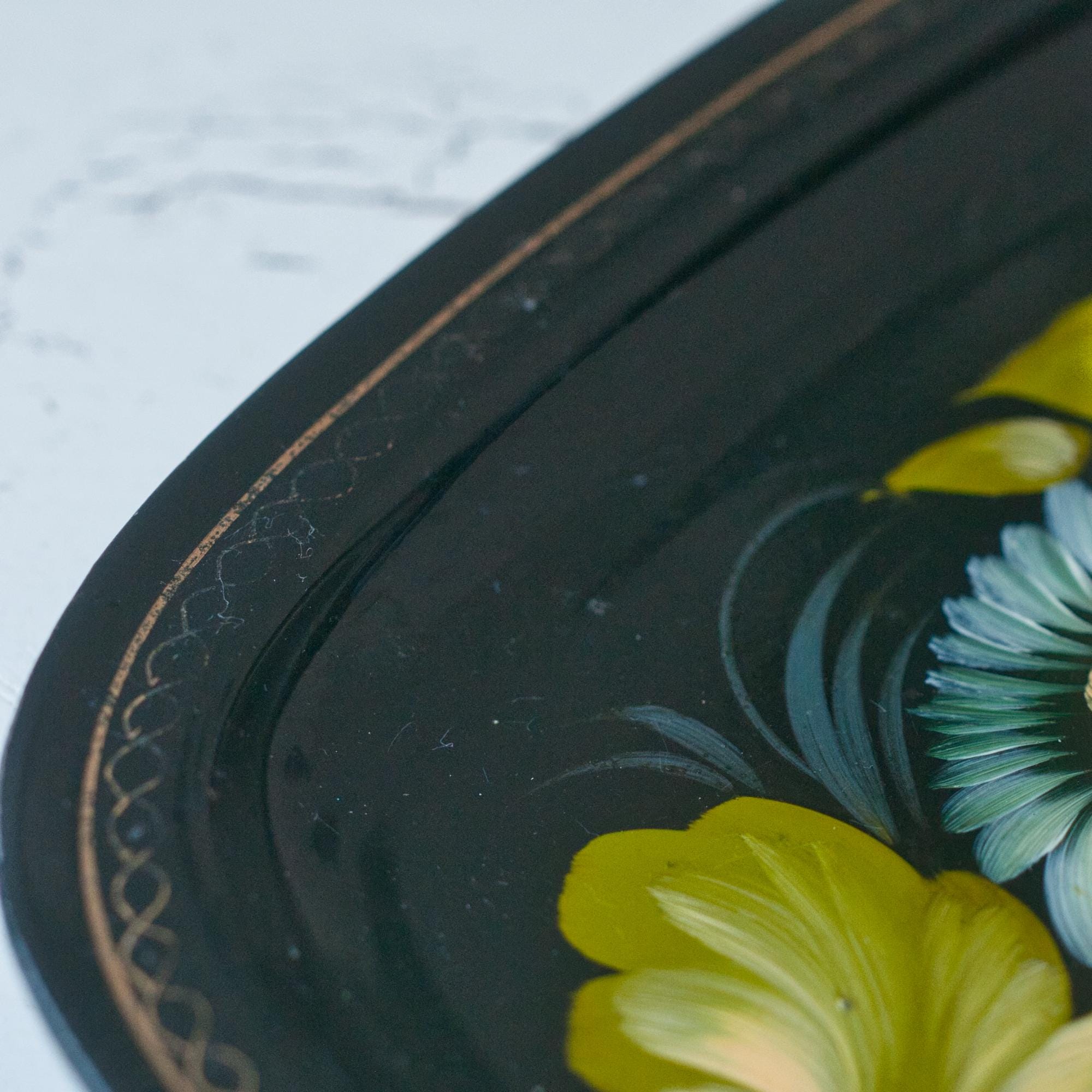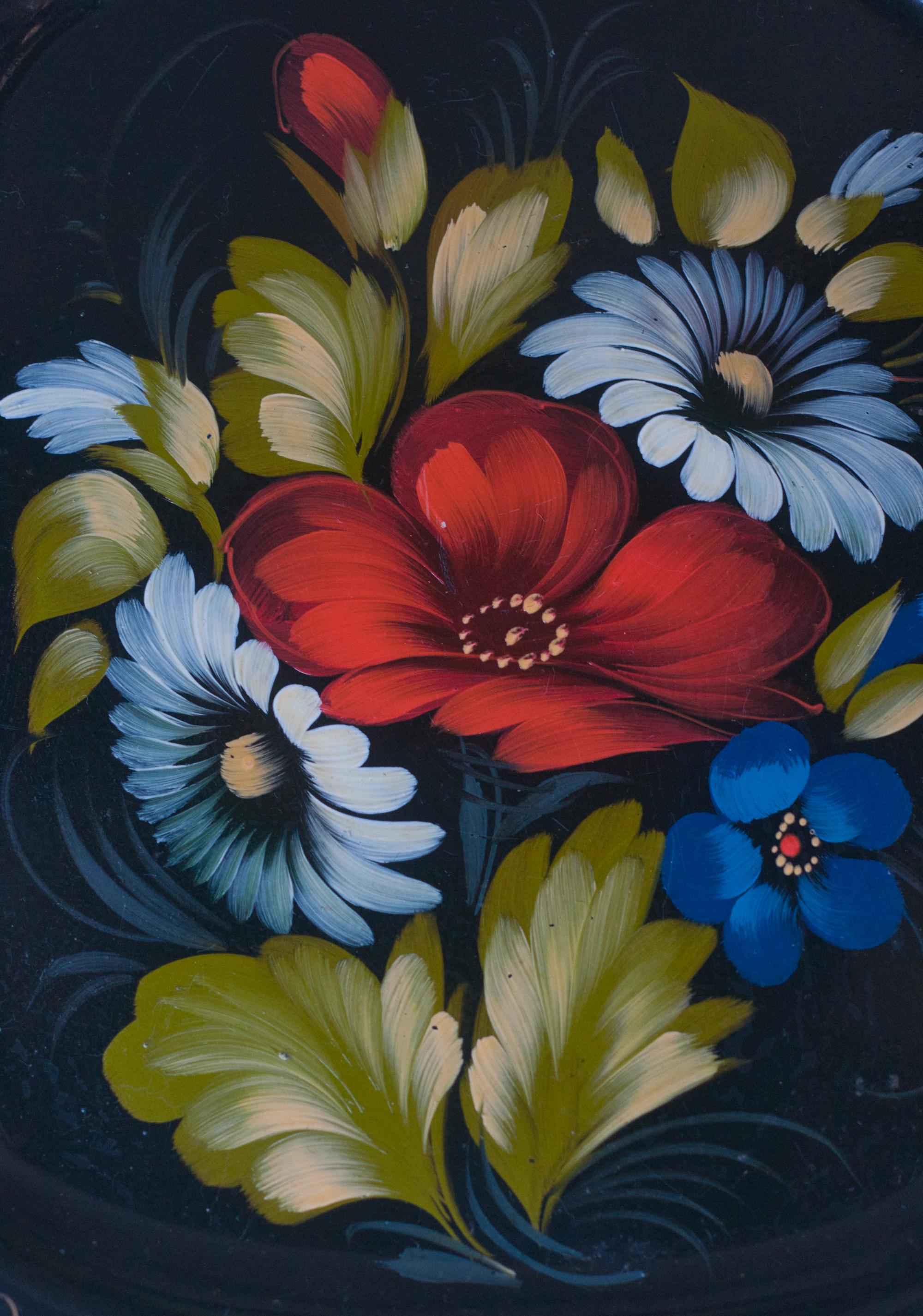 Zhostiva is a Russian folk handicraft that originated in the Zhostova region of the Moscow Oblast in the early 19th century. The traditional papier-mâché bowls, plates and trays became extremely popular with some artists reaching great renown. In the 20th century the technique started to include metal trays, like this one, lacquered in black varnish with floral motifs painted in diluted oil paints. The edges are decorated with a light golden "uborka" pattern. They are as durable as they are beautiful.