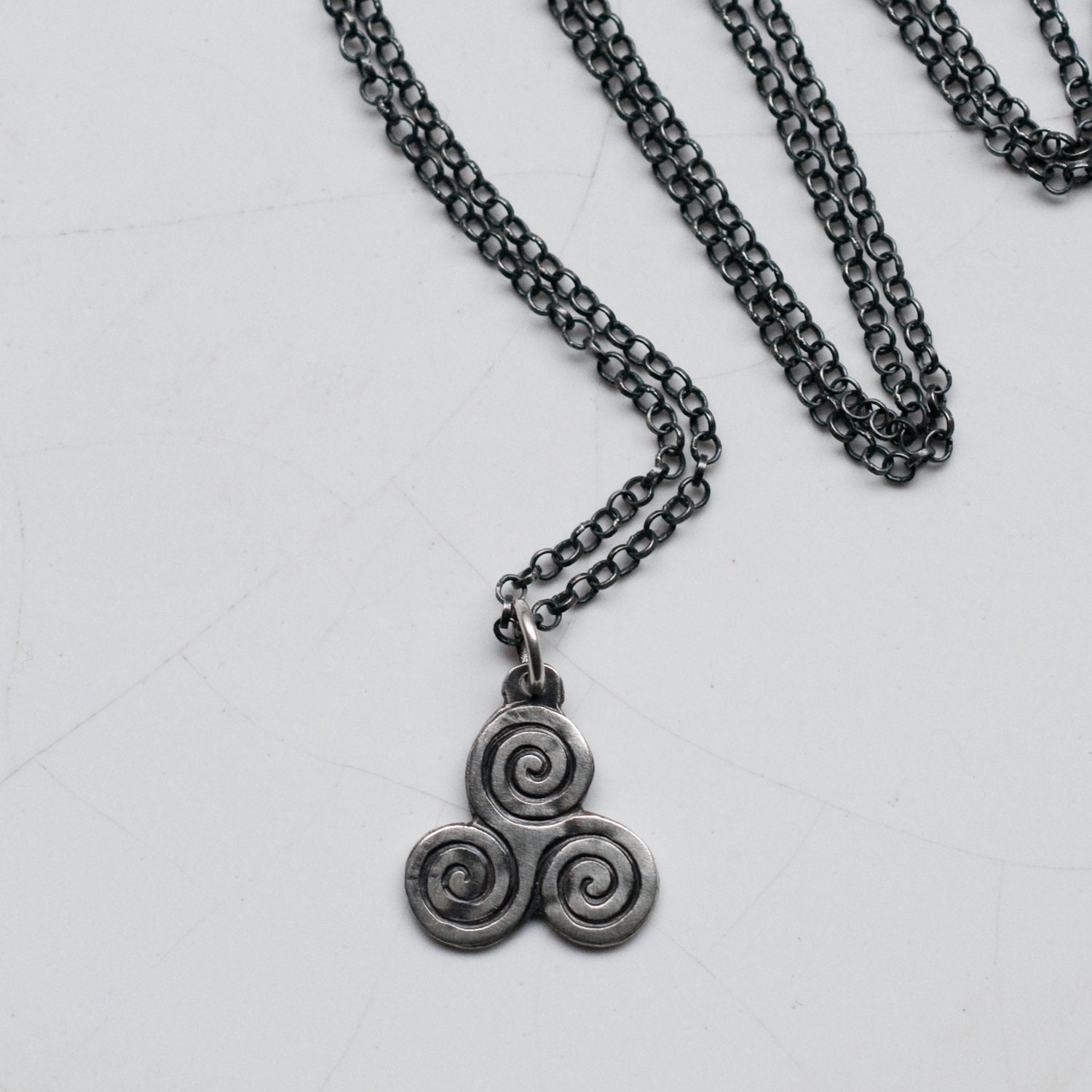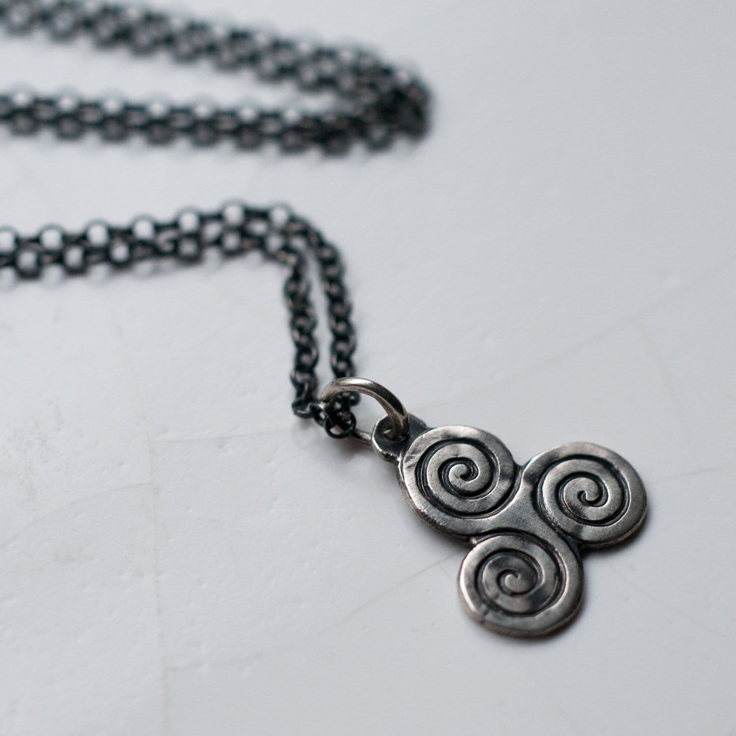 Created from sheet silver that has been forged against a steel impression die, this Triskele measures approximately 1.5cm in length and hangs from a 18" chain, all silver has been richly oxidised.