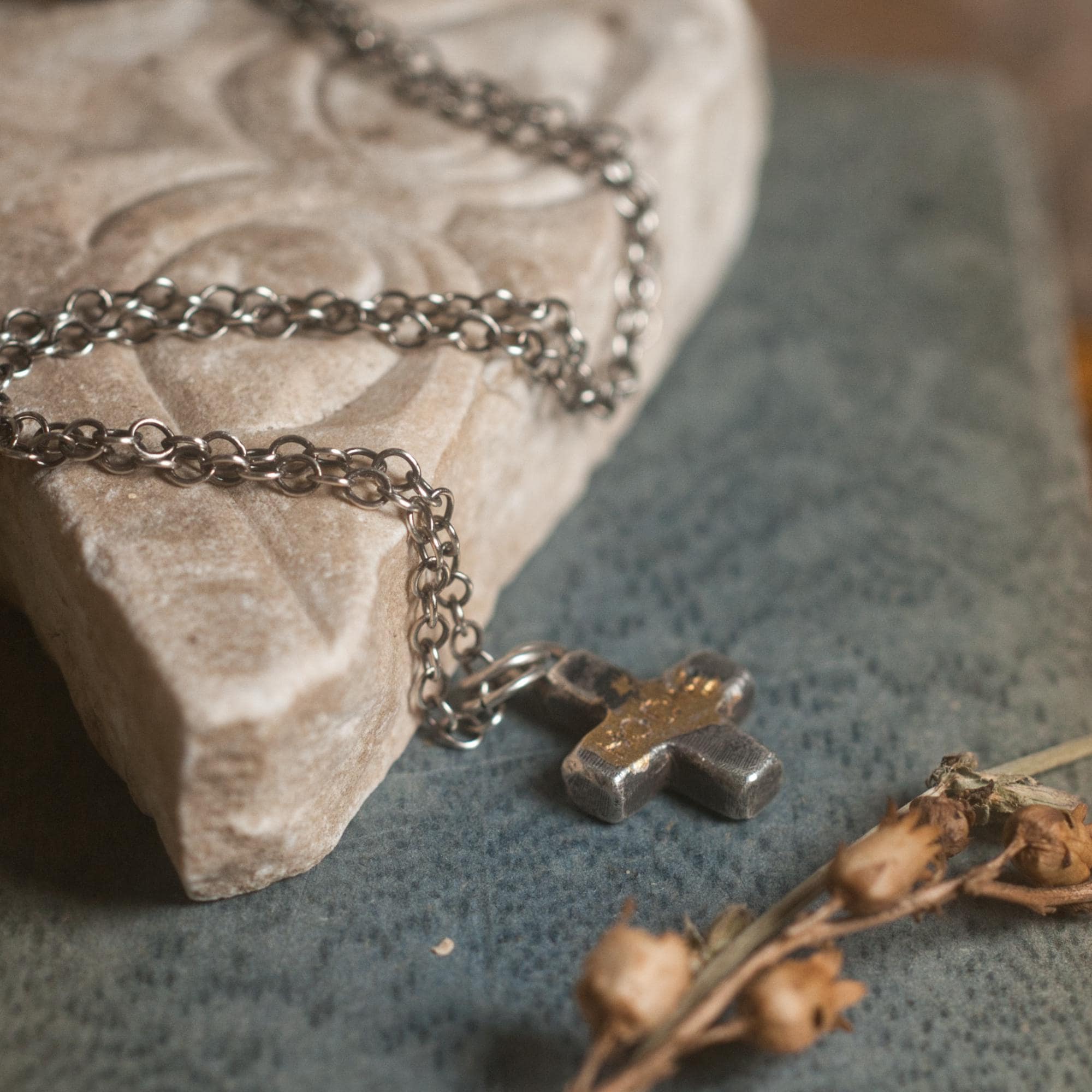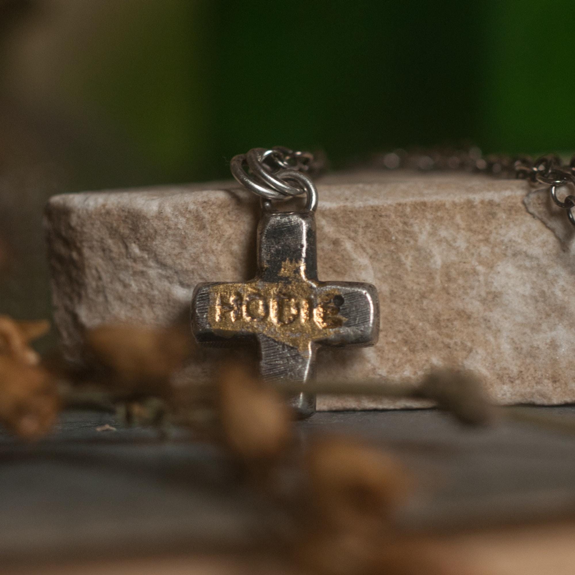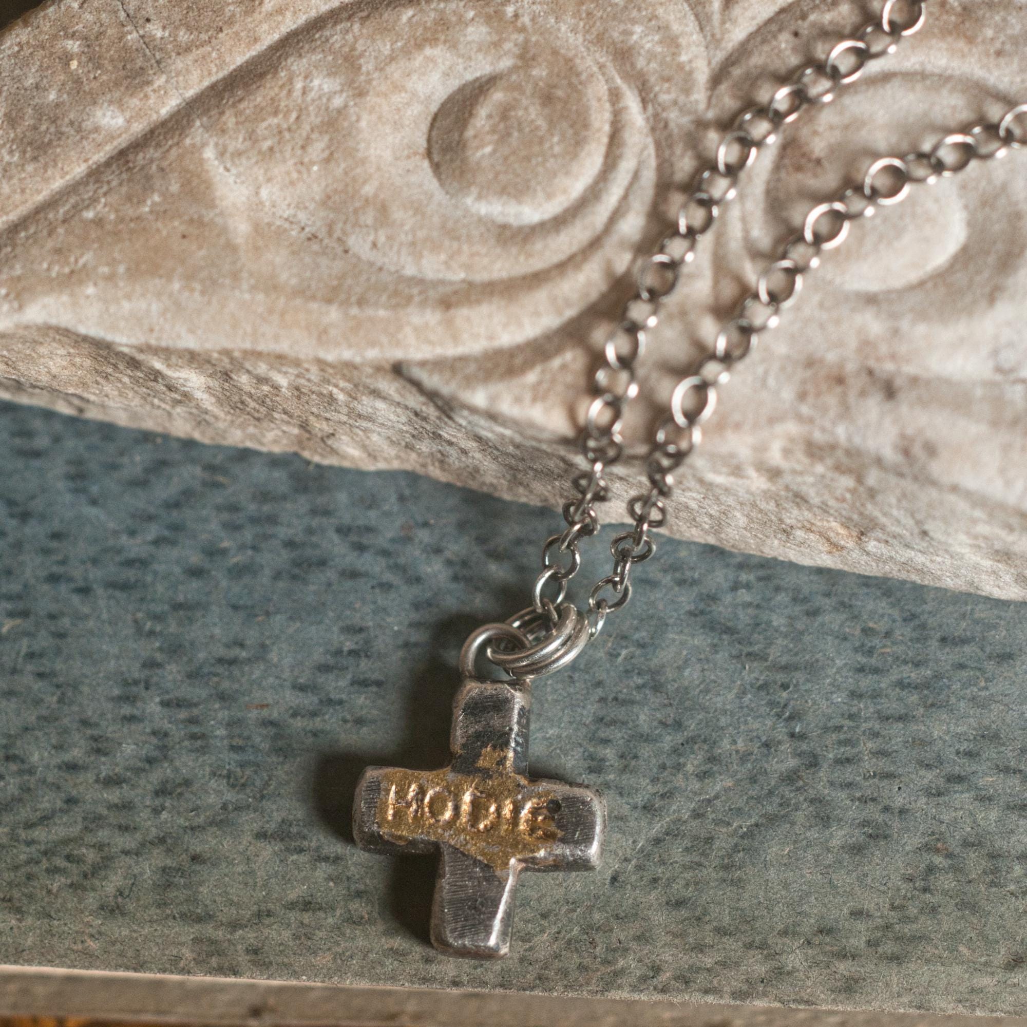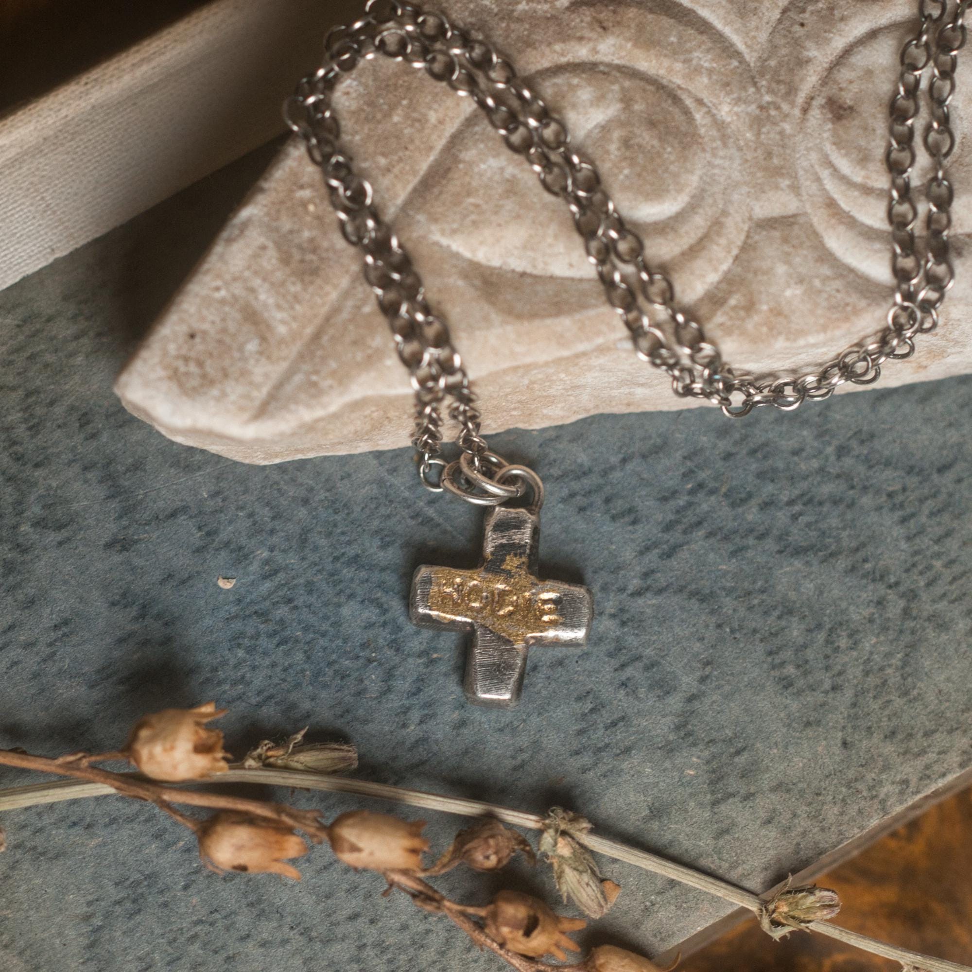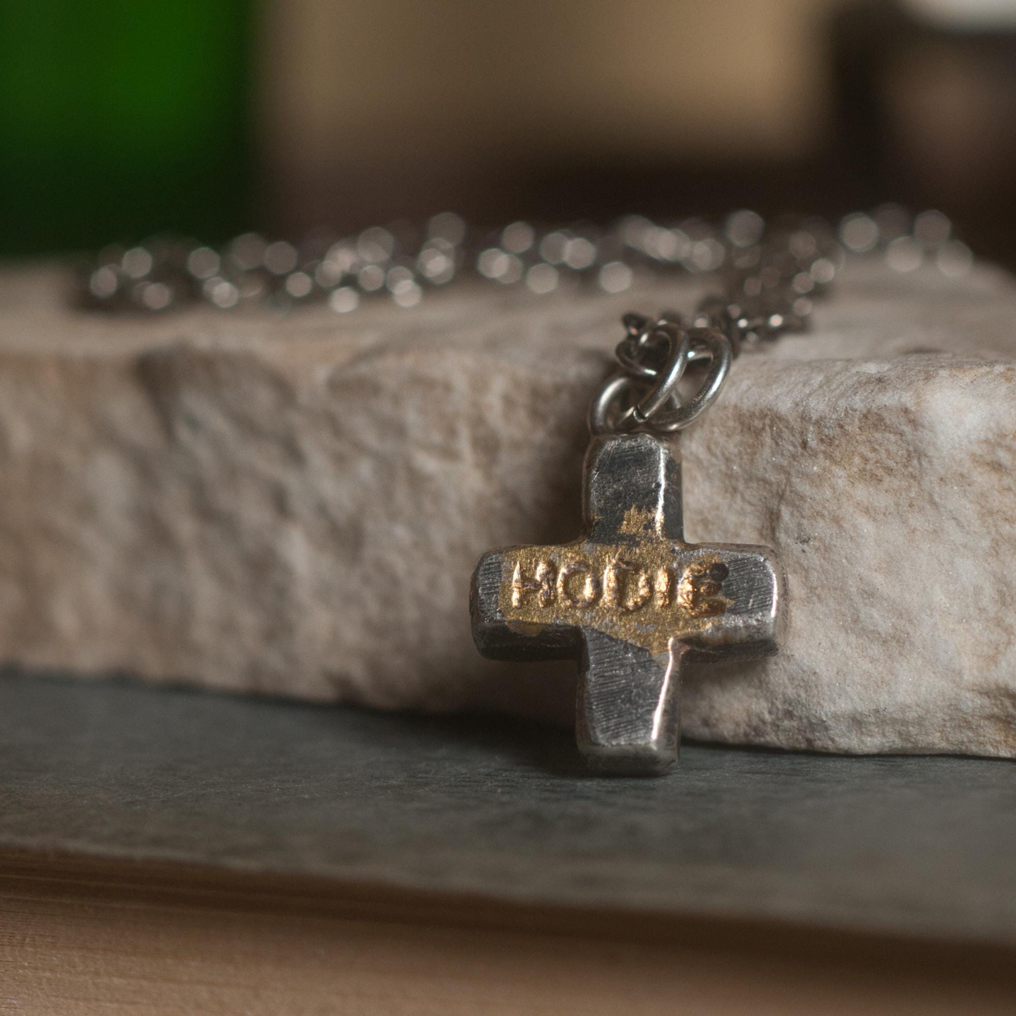 This gender neutral amulet has been specifically created to honour his name and publicly acknowledge his help, the cross has been primitively carved from a wax model with the word HODIE, meaning "Today". A sterling silver cast is then made from the wax model and the front of the pendant accented with 24k gold using the ancient art of Keum Boo. The chain is also sterling silver, the standard length is 46cm/18", and the closure Is a spring ring clasp. The silver has been deeply oxidised to bring out the texture of the metal and contrast with the richly glowing gold.