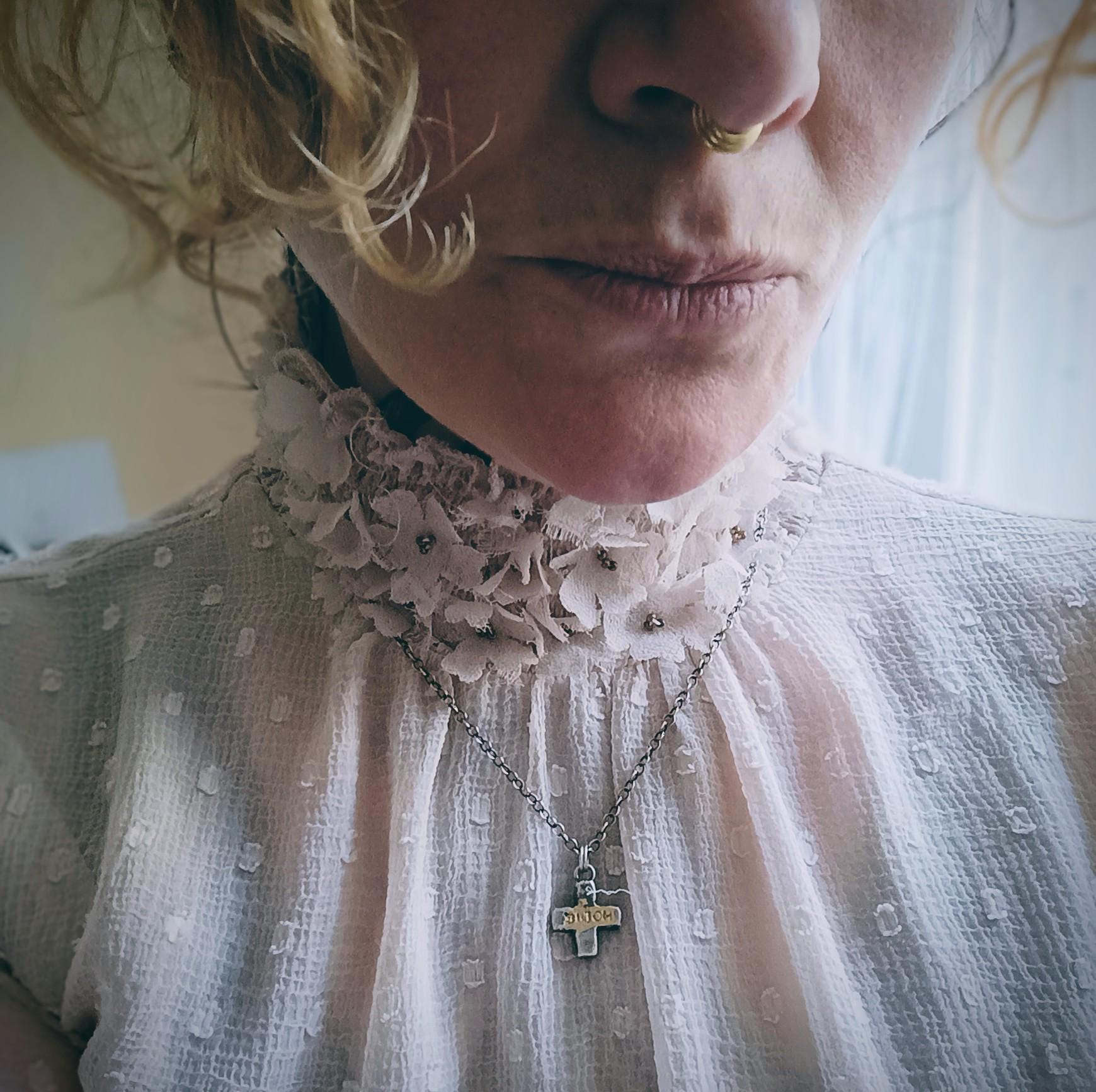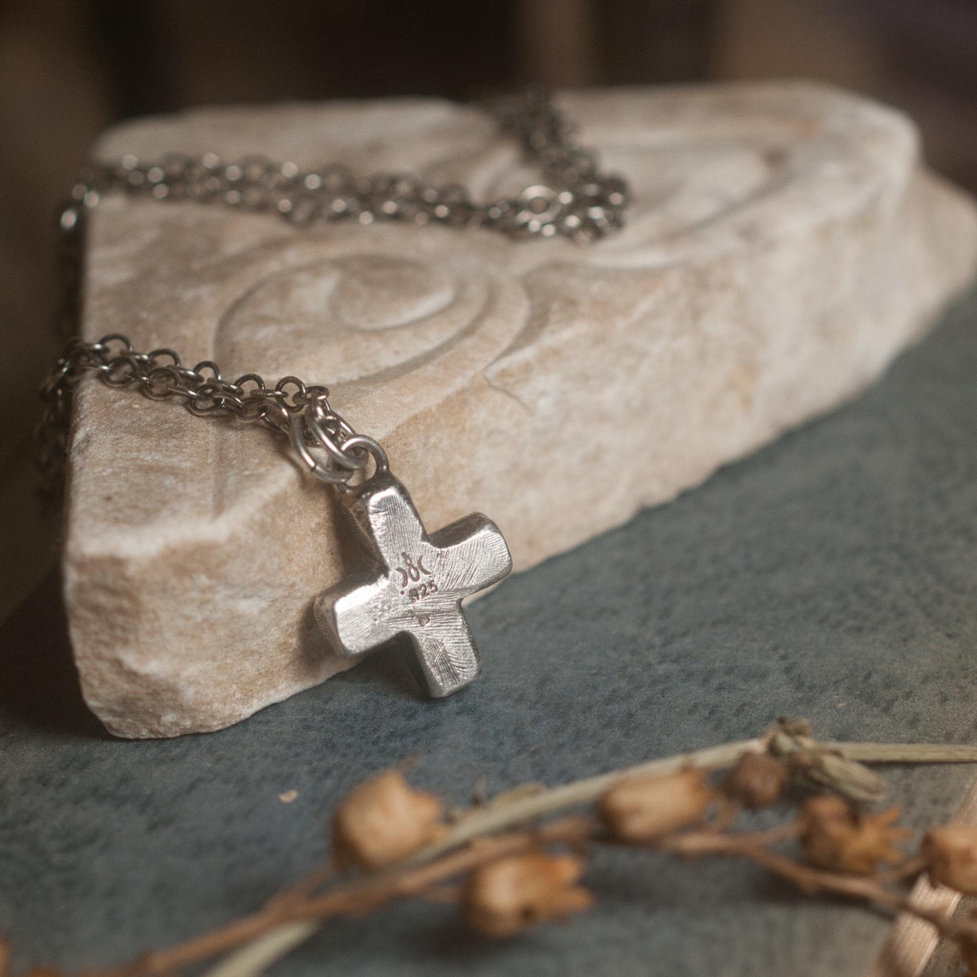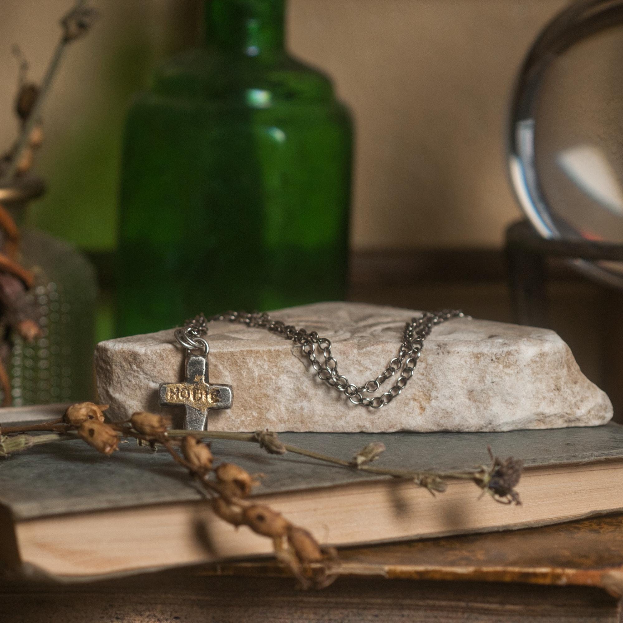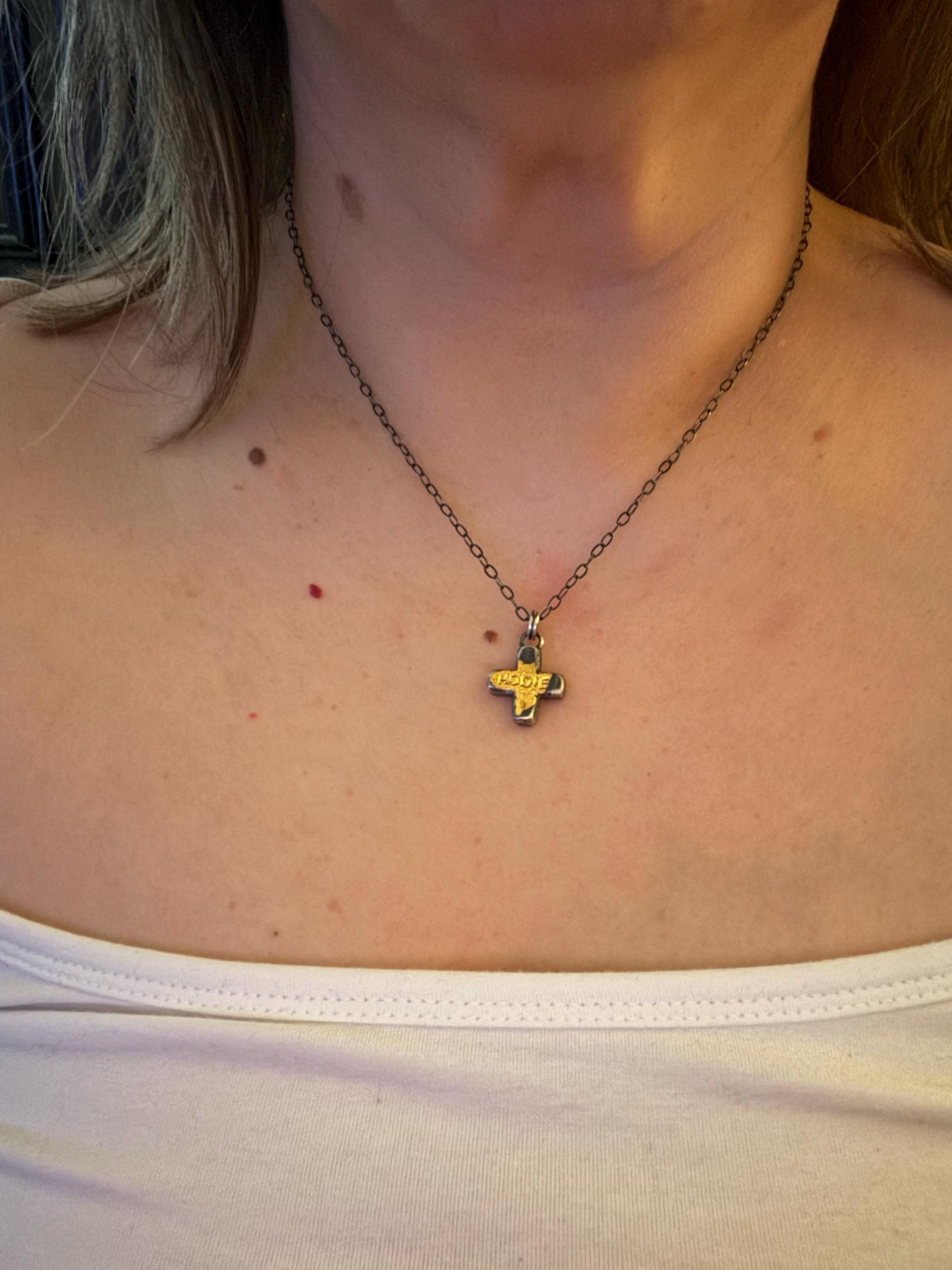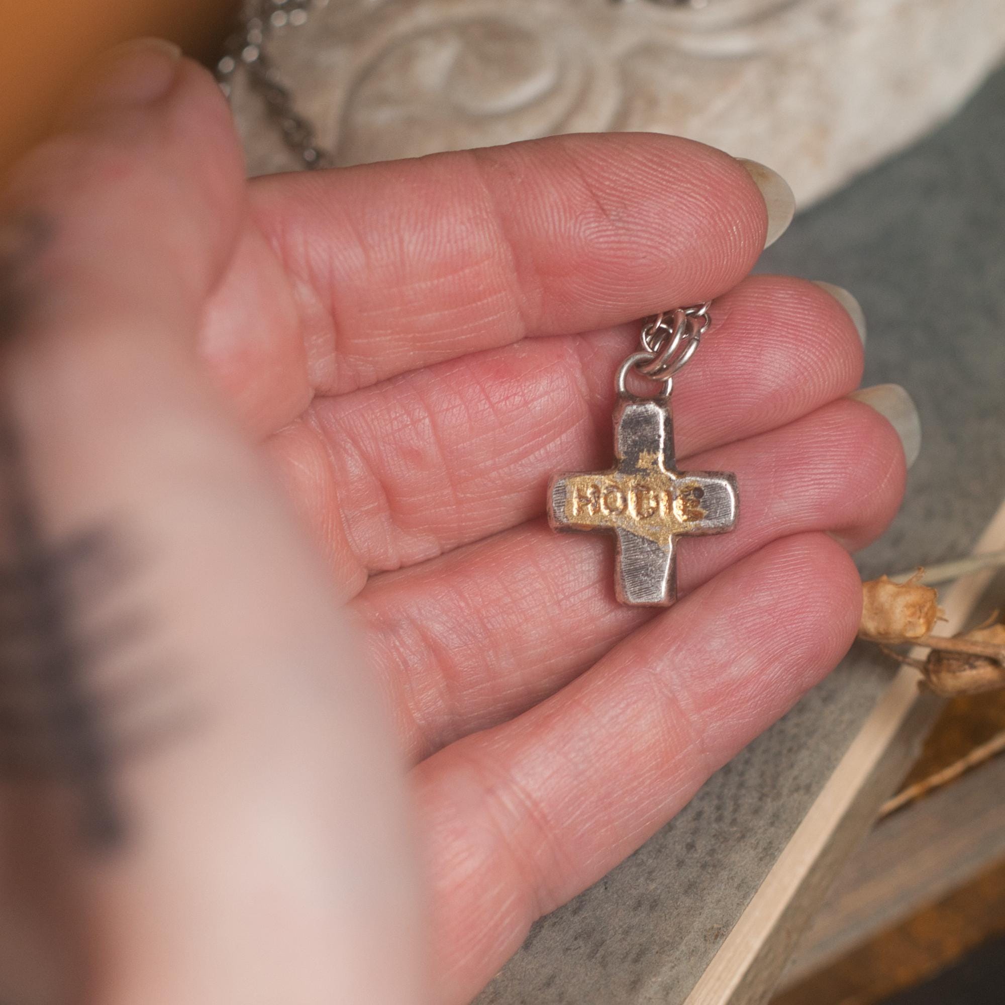 This gender neutral amulet has been specifically created to honour his name and publicly acknowledge his help, the cross has been primitively carved from a wax model with the word HODIE, meaning "Today". A sterling silver cast is then made from the wax model and the front of the pendant accented with 24k gold using the ancient art of Keum Boo. The chain is also sterling silver, the standard length is 46cm/18", and the closure Is a spring ring clasp. The silver has been deeply oxidised to bring out the texture of the metal and contrast with the richly glowing gold.