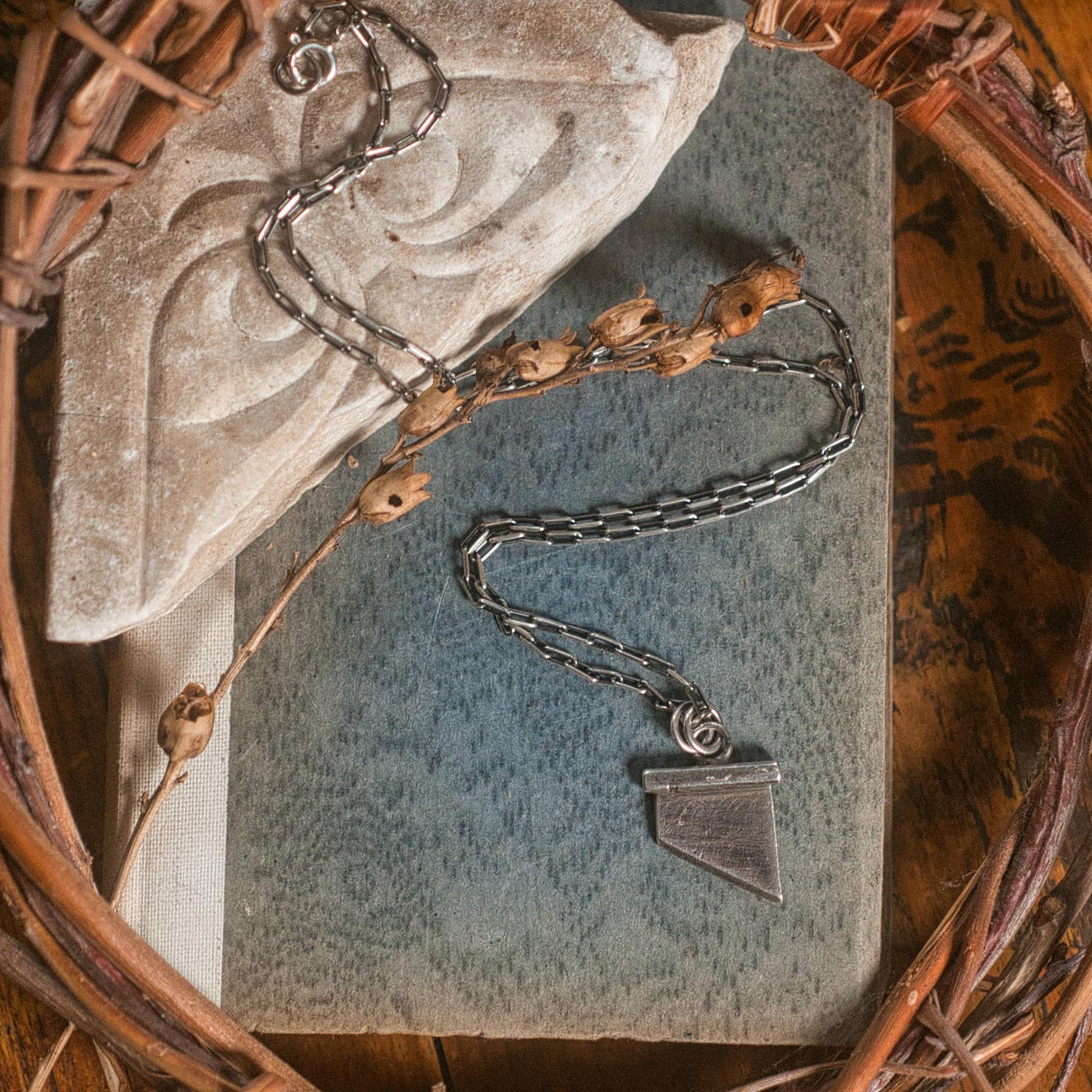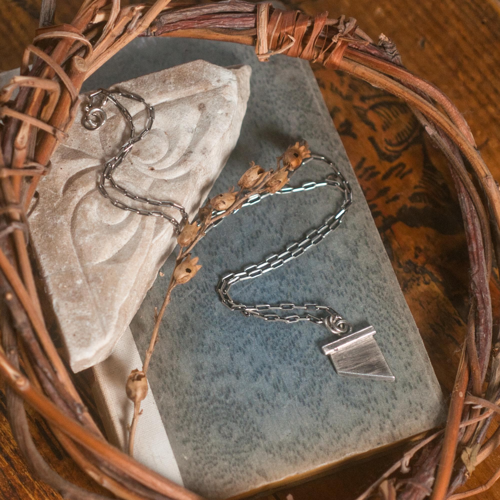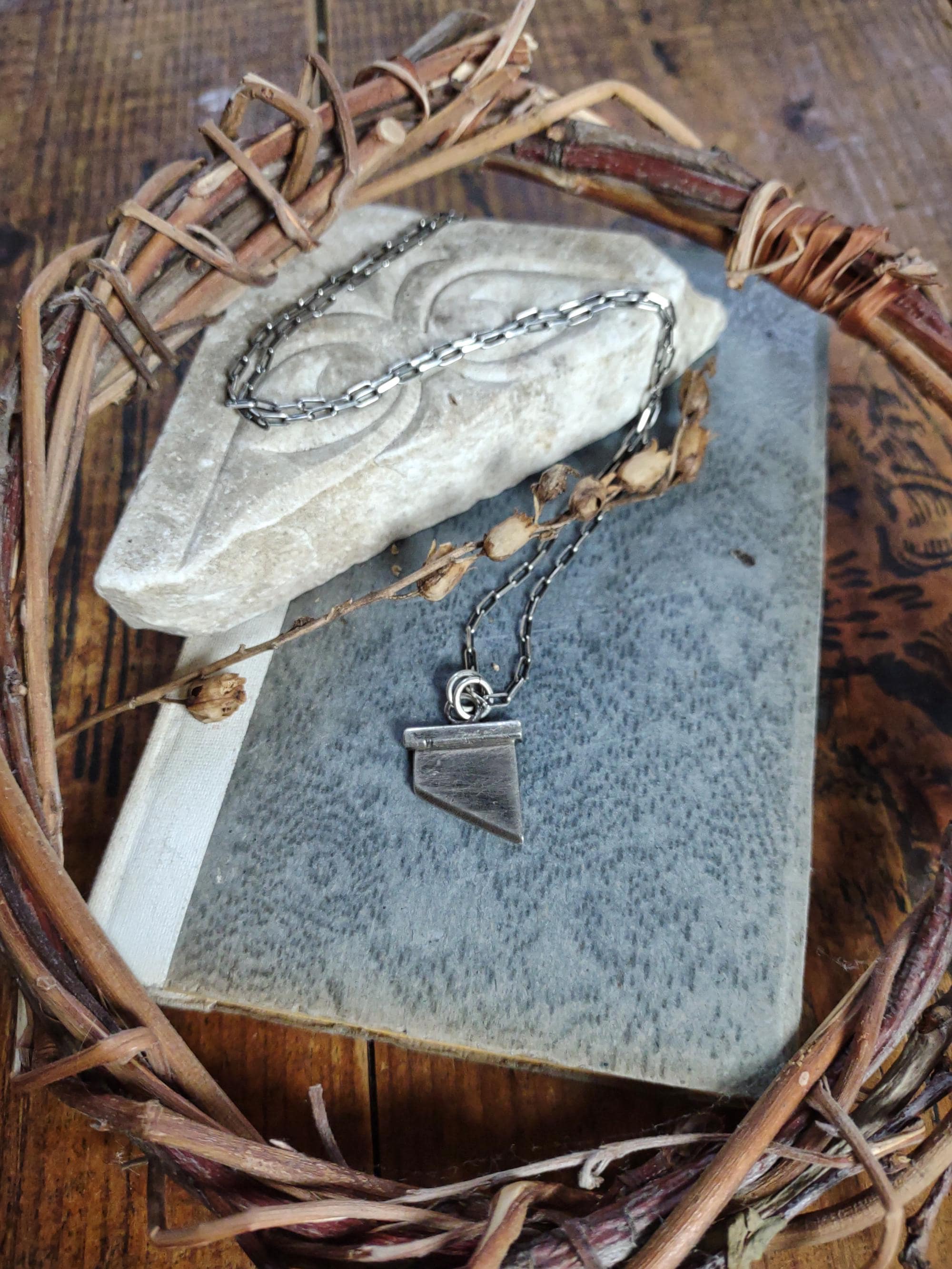 A necklace made for those of us that yearn for a little more social justice in this world... a solid silver French guillotine blade crafted from sheet and wire fabricated in my Berlin atelier... the blade has been oxidised and weathered... it is not a shiny perfect unused blade but one that has seen heads roll, practical, utilitarian... a tool not superficial bling.