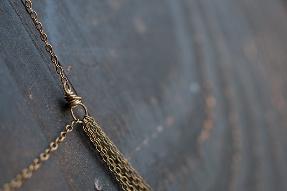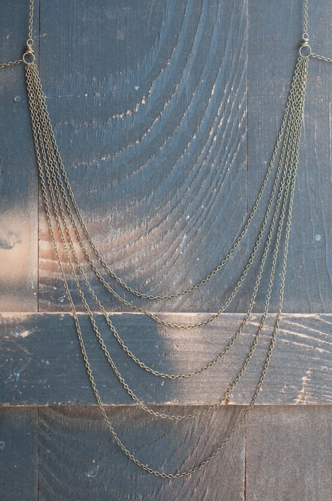 This delicate yet sturdy body chain falls in gentle cascades and can be worn in a variety of ways. The fine link antiqued brass chain is dainty but soldered and the lengths are joined with wrapped wire connectors for extra strength. Very feminine body armour… soft, strong and very adaptable.
