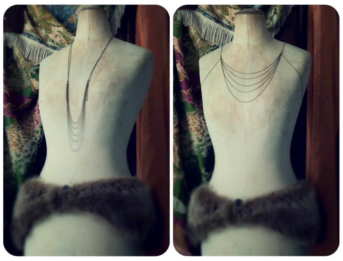 Cascade body chain, body jewellery, fine link antique brass chain, convertible necklace body harness, body armour.