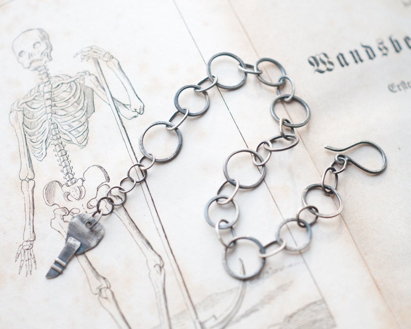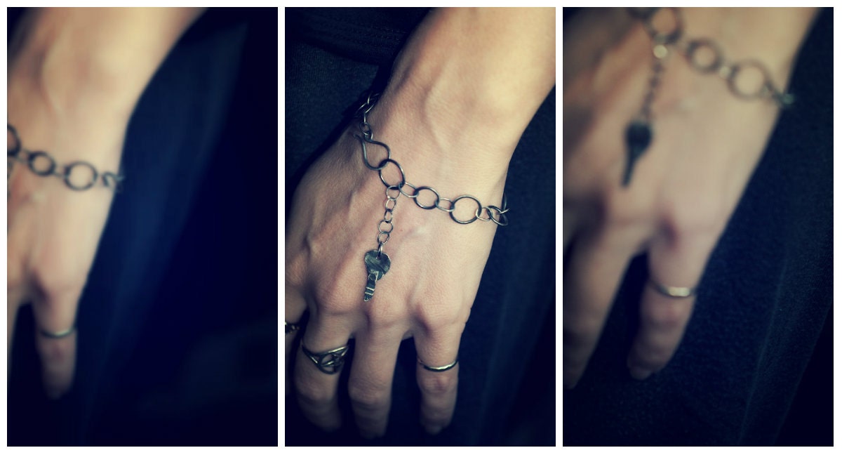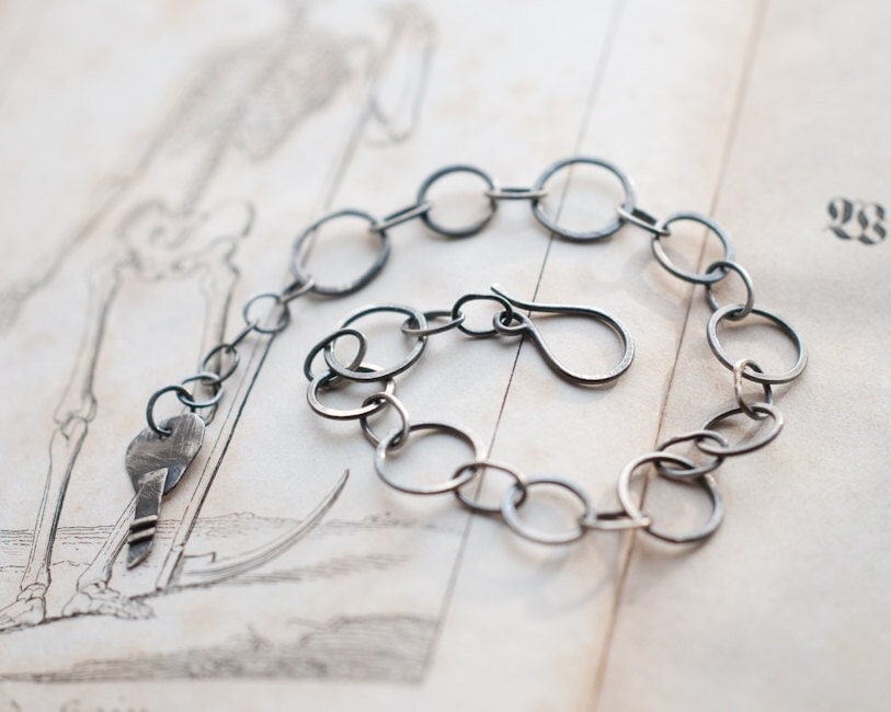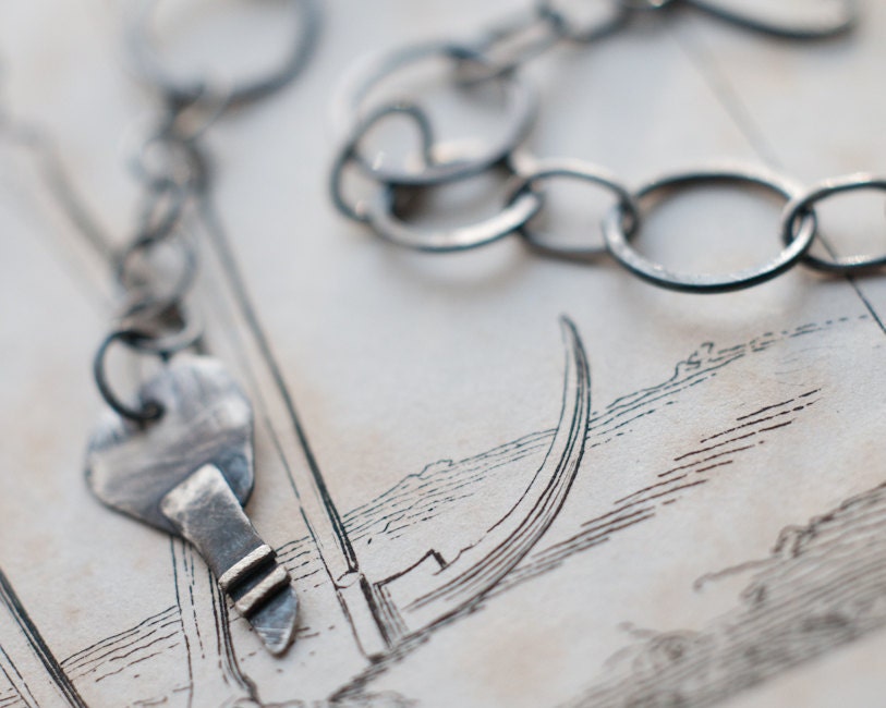 This completely hand made bracelet is made to order for each customer, each key charm is made from recycled scrap silver and is as individual as you are, no two keys will be made the same. The default size is approximately 7.25 inches in length (18.5 cm) with an additional 2 cm extension chain from which the key dangles, although a custom length can be accommodated if you message me at checkout. All silver is oxidised and then brushed for depth and character… but the oxidation is not been sealed to allow for the patina to evolve in a manner unique to the wearer.