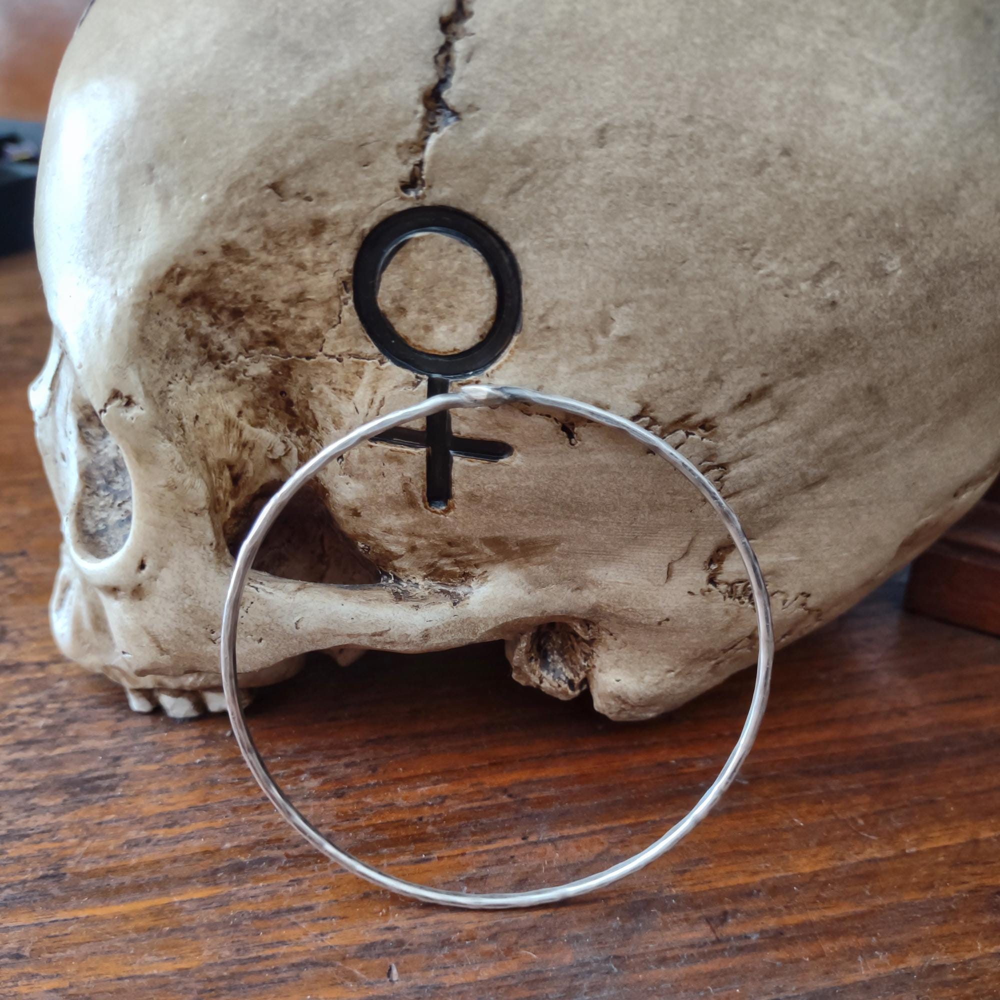 A single length of blackened and scarred 12 gauge sterling silver, a snake devouring it's tail. Gender neutral, choose between small (approx. 2.25 inches, 56mm), medium (approx. 2.5 inches, 63mm) and large (approx. 2.75 inches, 70mm) or request a custom size.