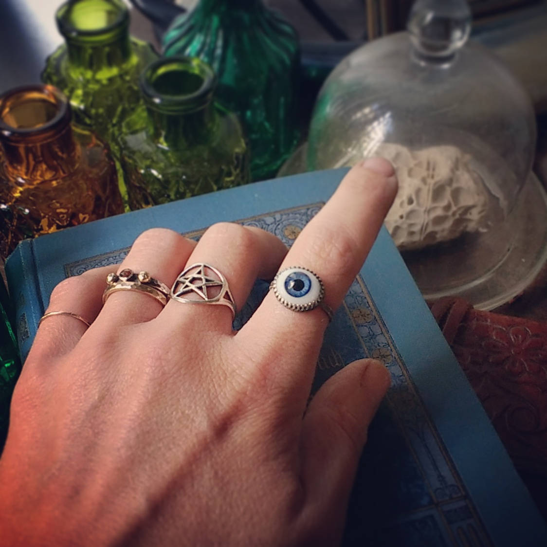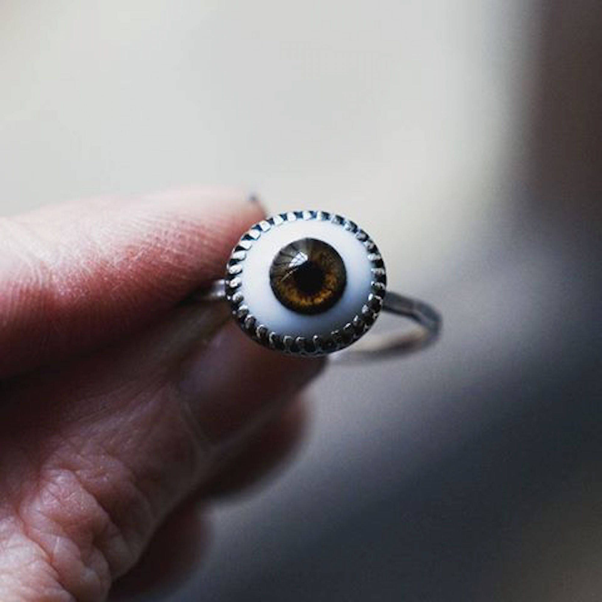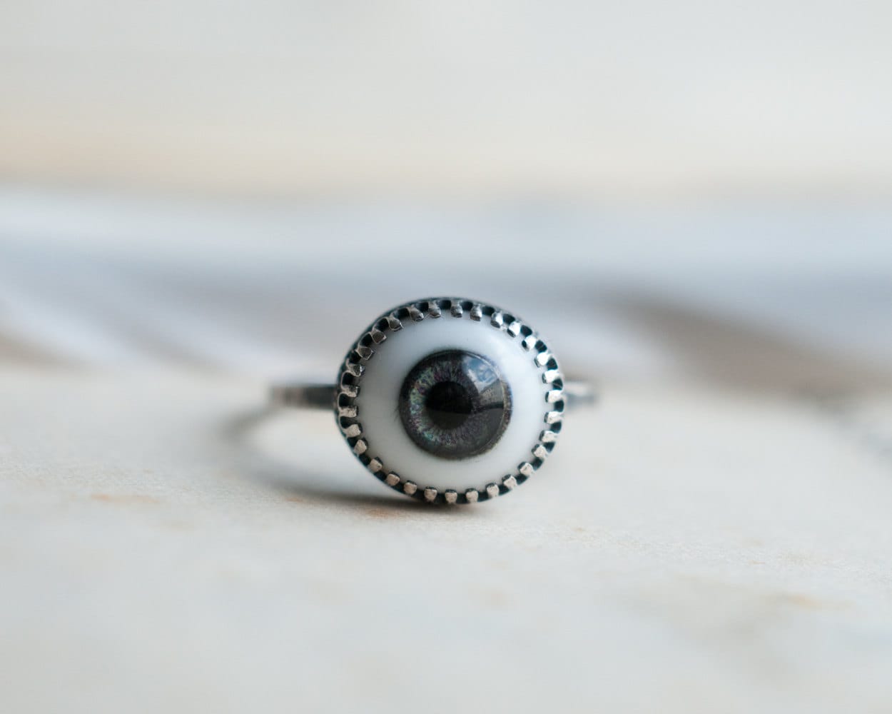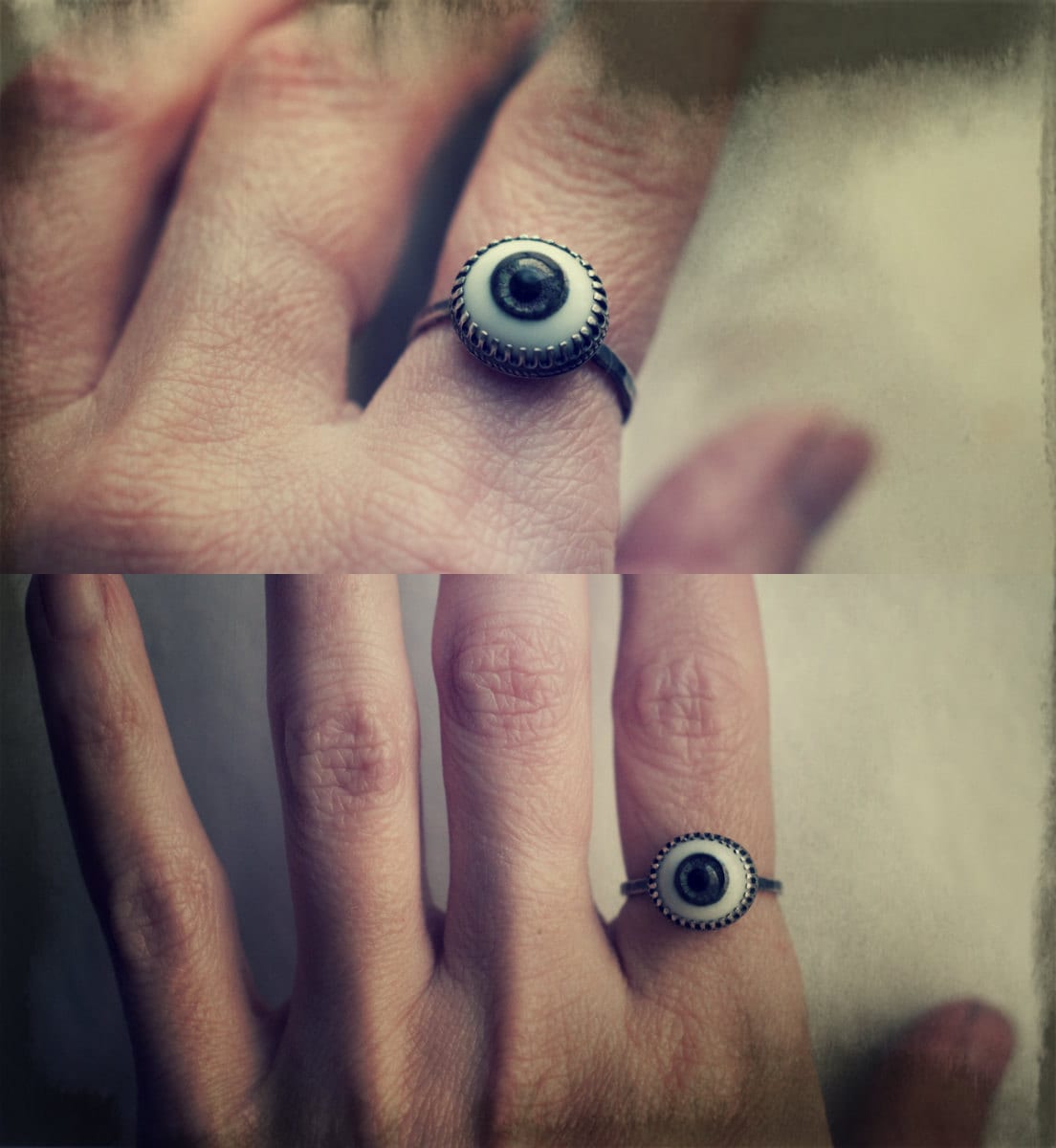 A 10mm solid glass eye sits within a fancy gallery bezel atop a hammered sterling silver shank, stackable with other rings (example shown in the fifth image using my wide hammered band stacking ring)... someone to watch over you...