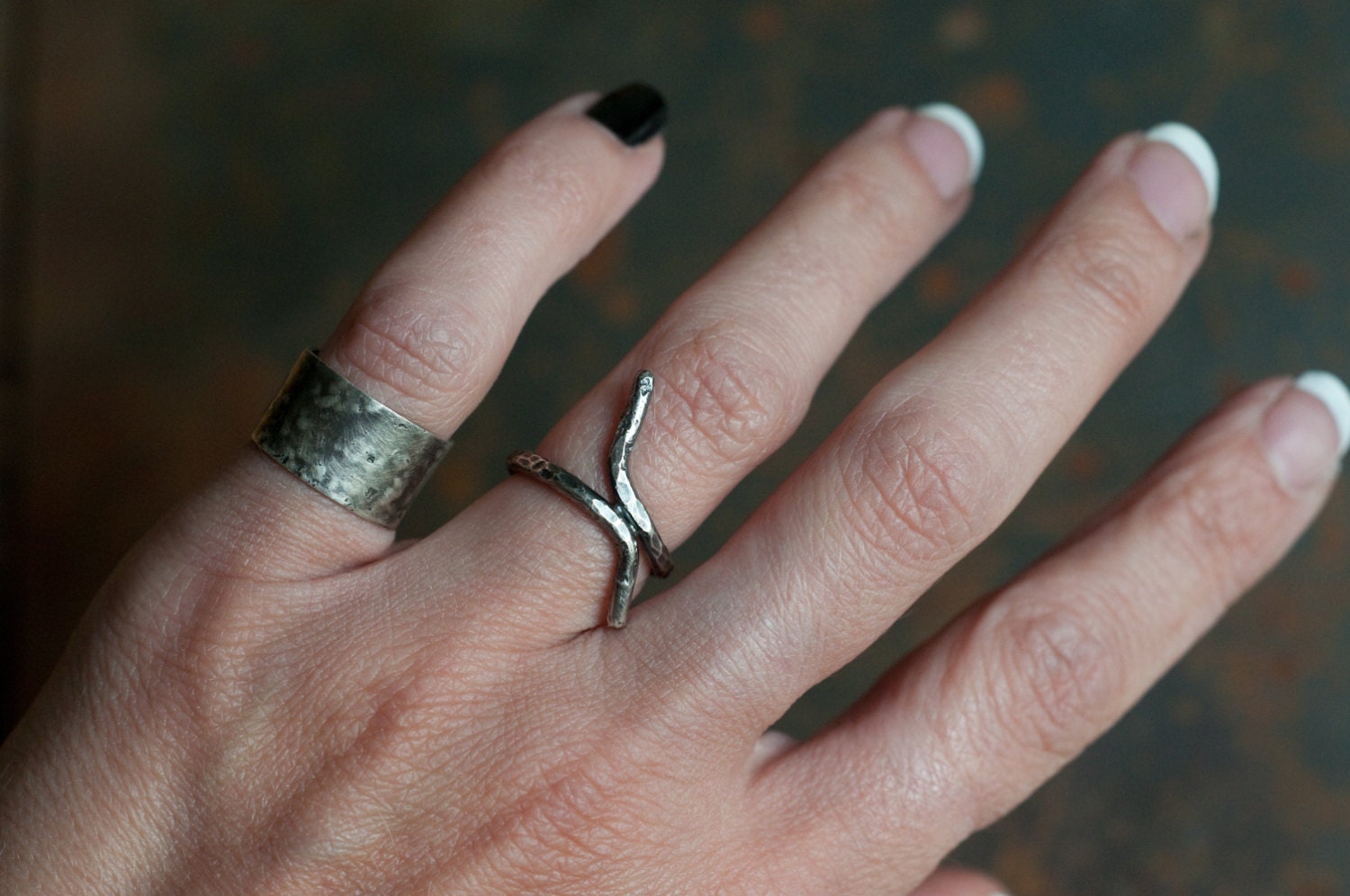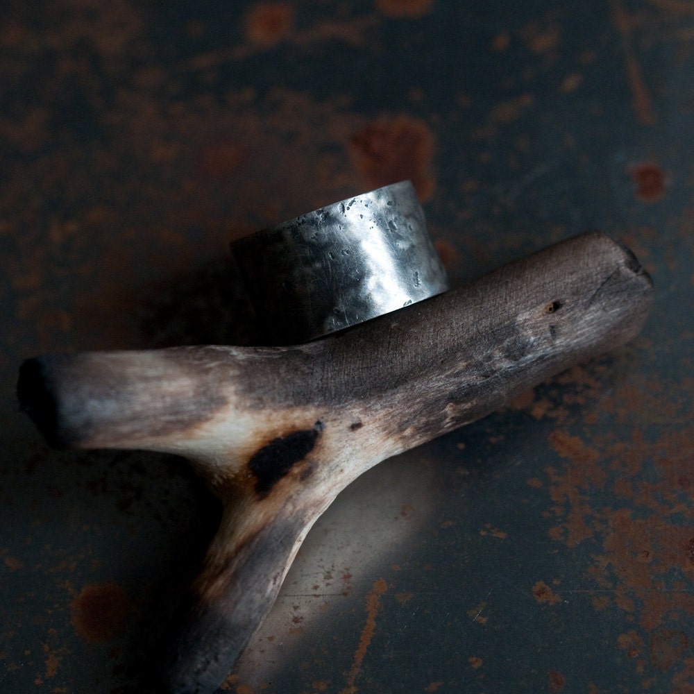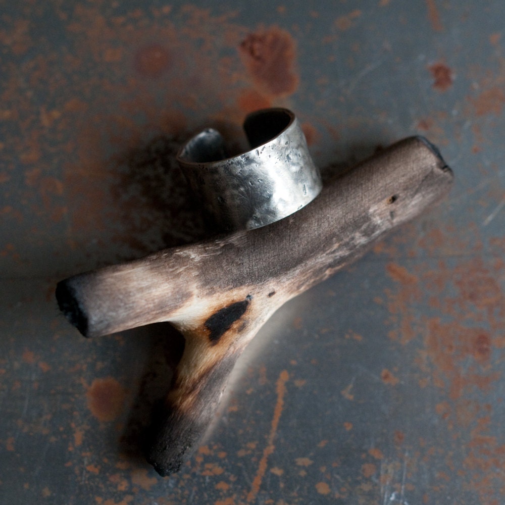 Part of the "Burnt Offerings" collection... the "Husk" ring, scarred and charred and curled towards itself... a wide band of sterling silver, open at the back for an adjusted fit... for the finger, pinkie or knuckle.