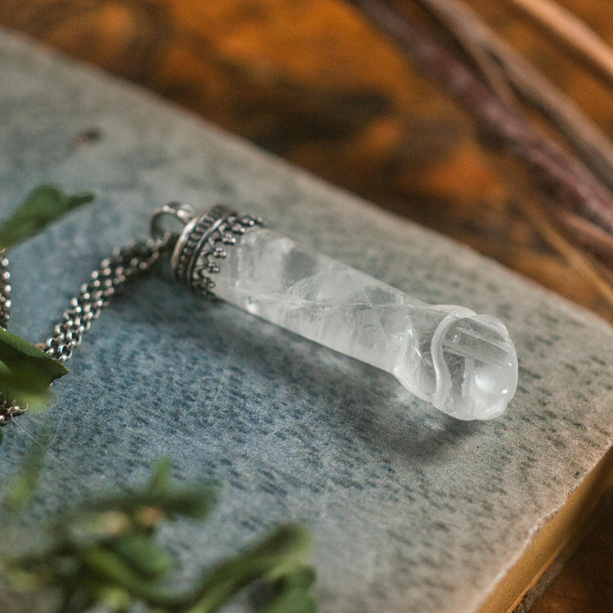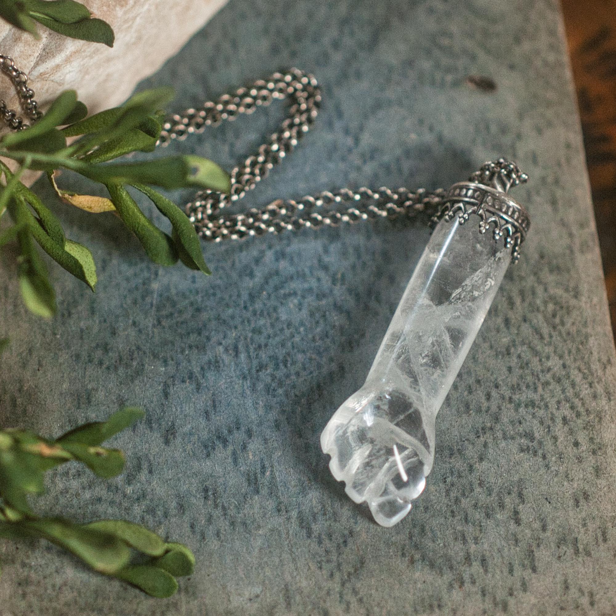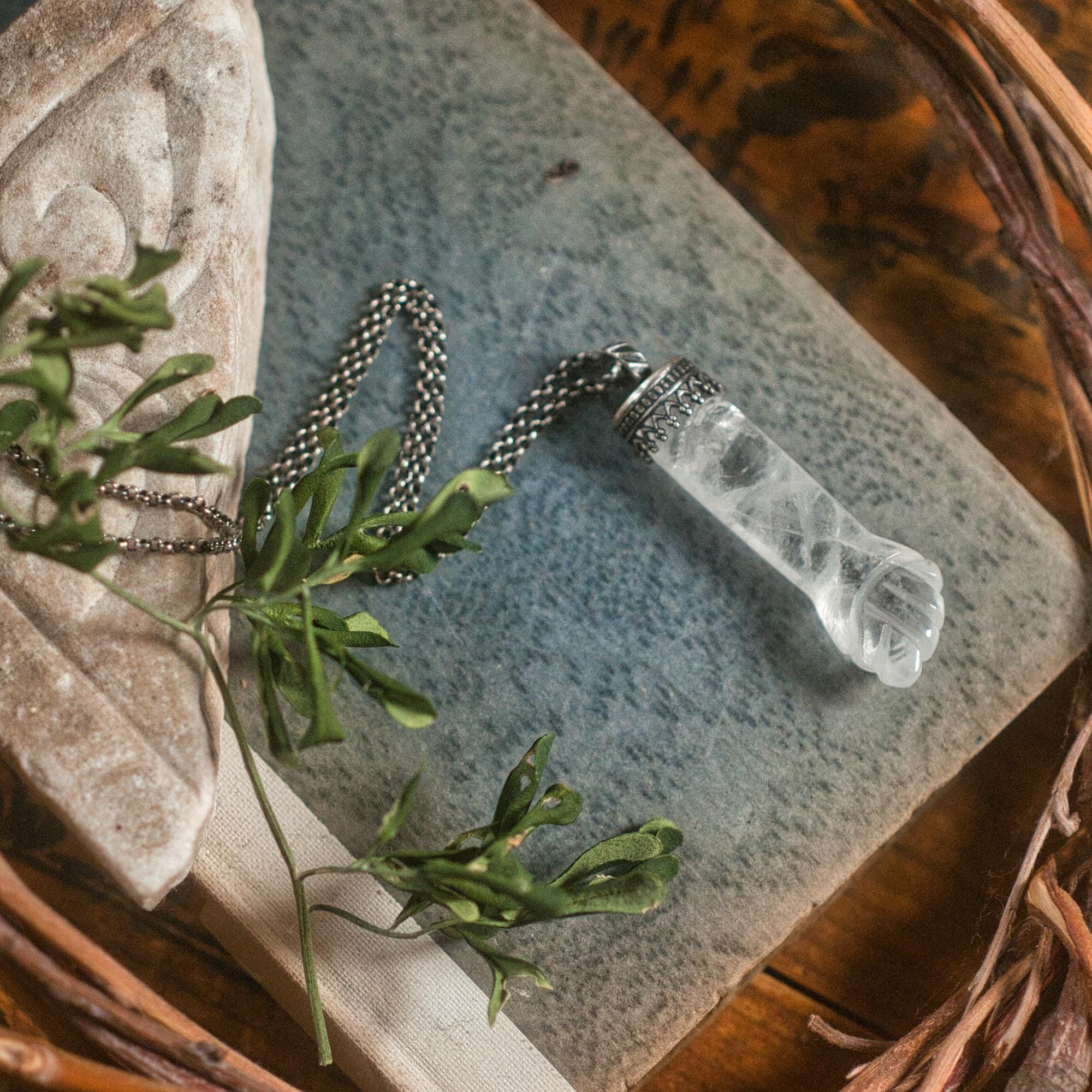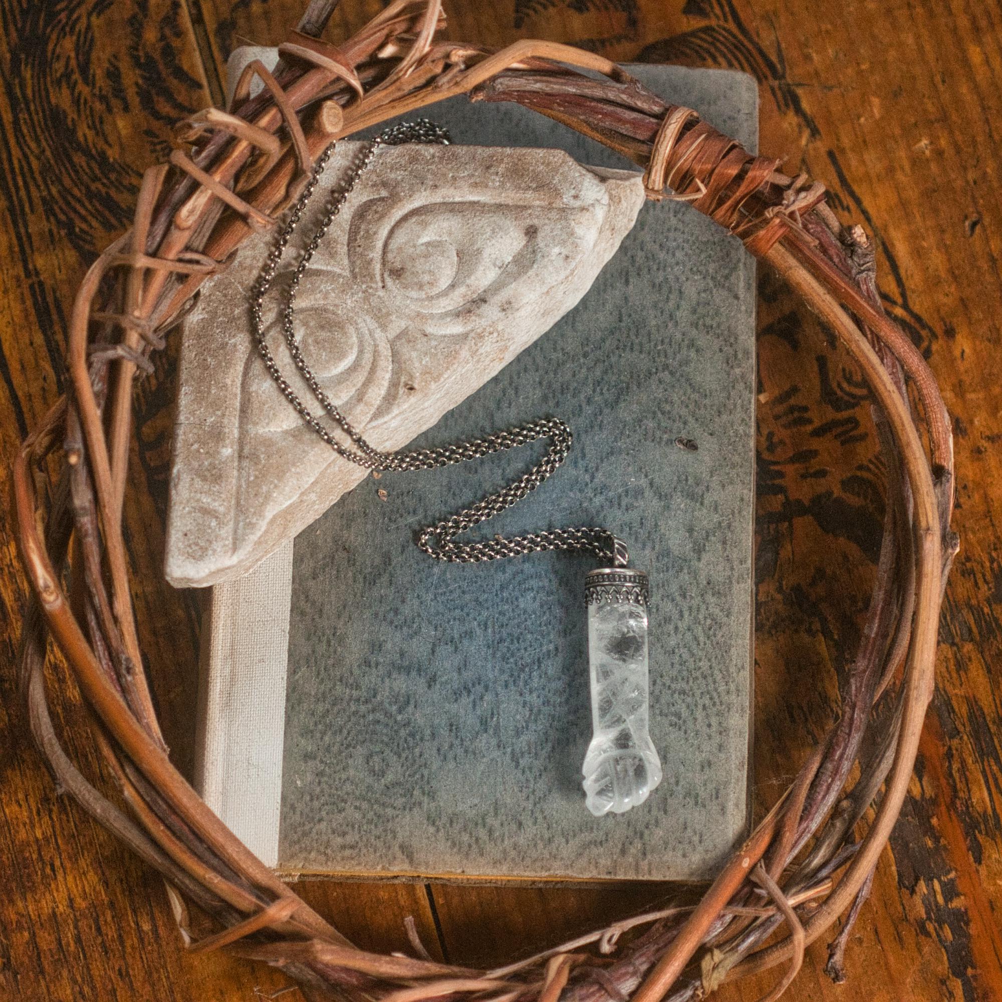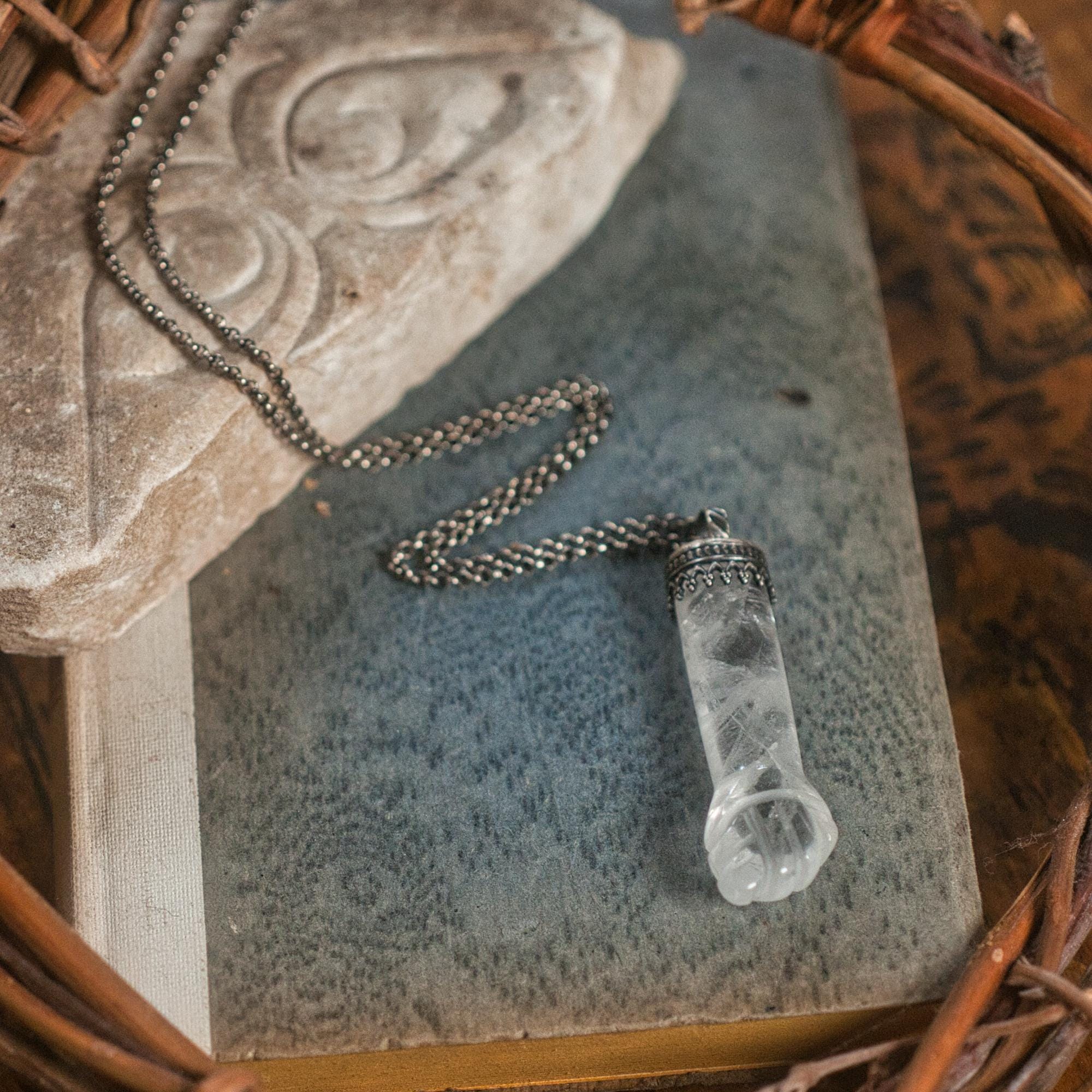 Carved from a chunk of beautiful clear quartz and capped in sterling silver, the pendant measures approximately 3.5cm. The 24" chain is also sterling silver and all metal work has been given a rich antique patina.