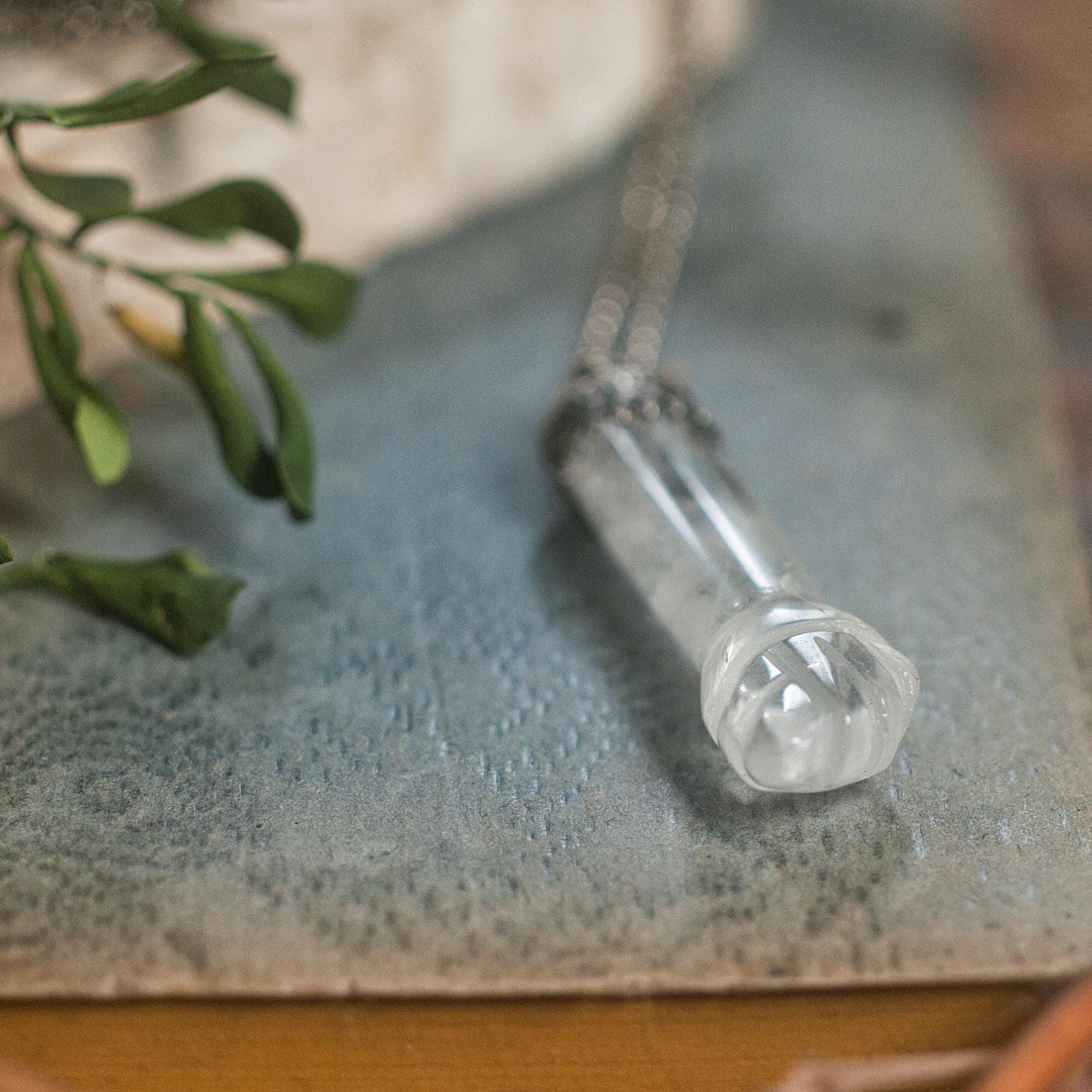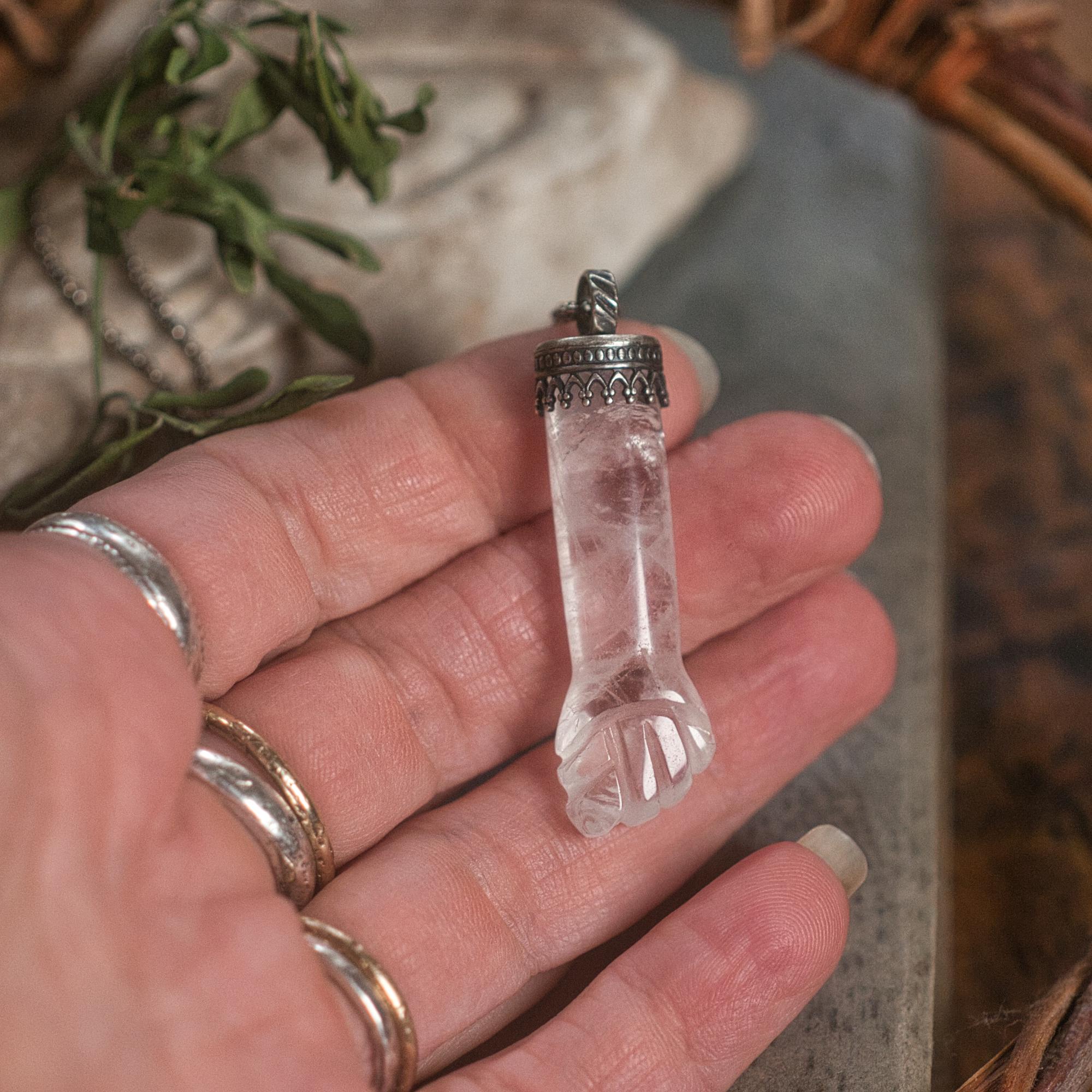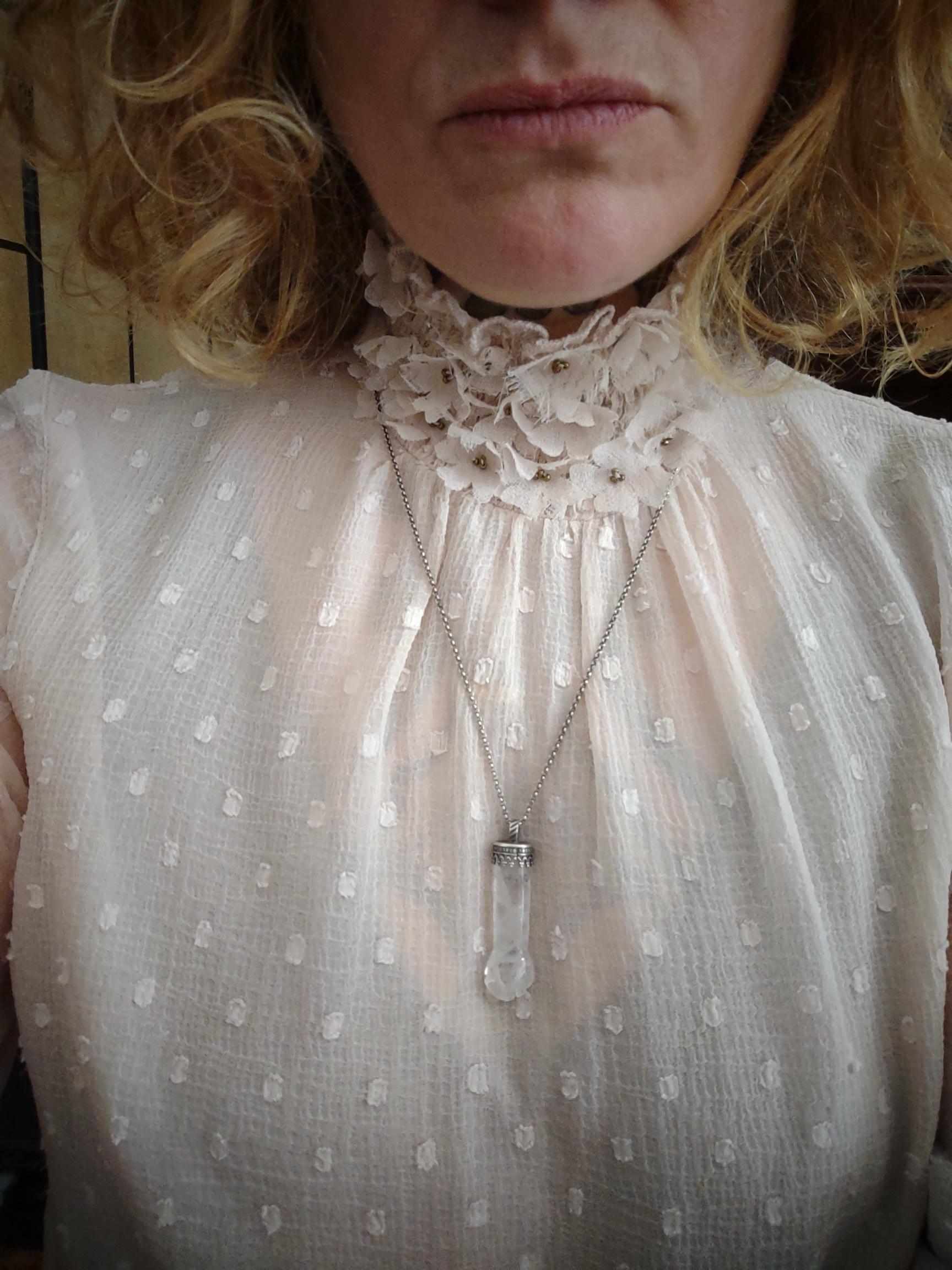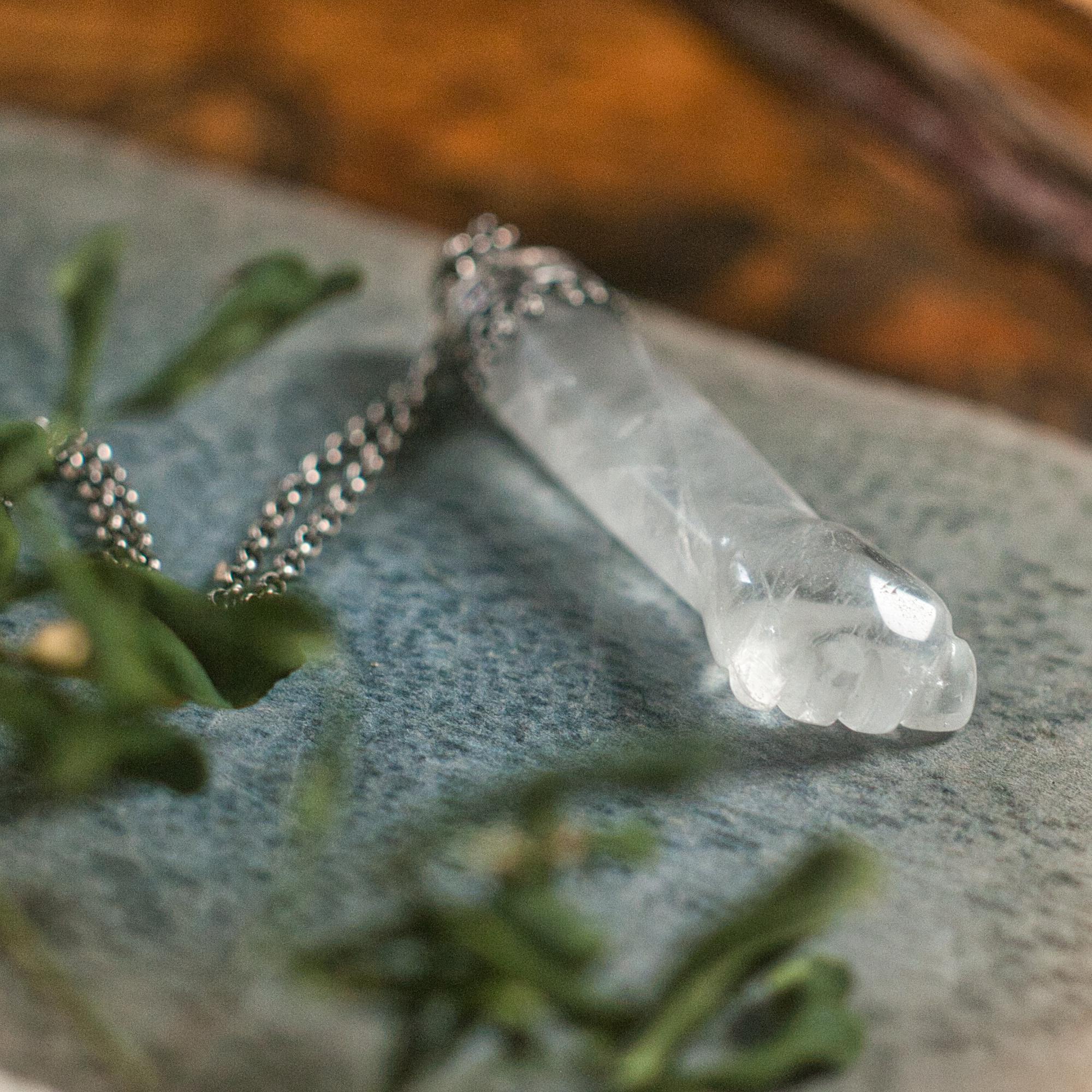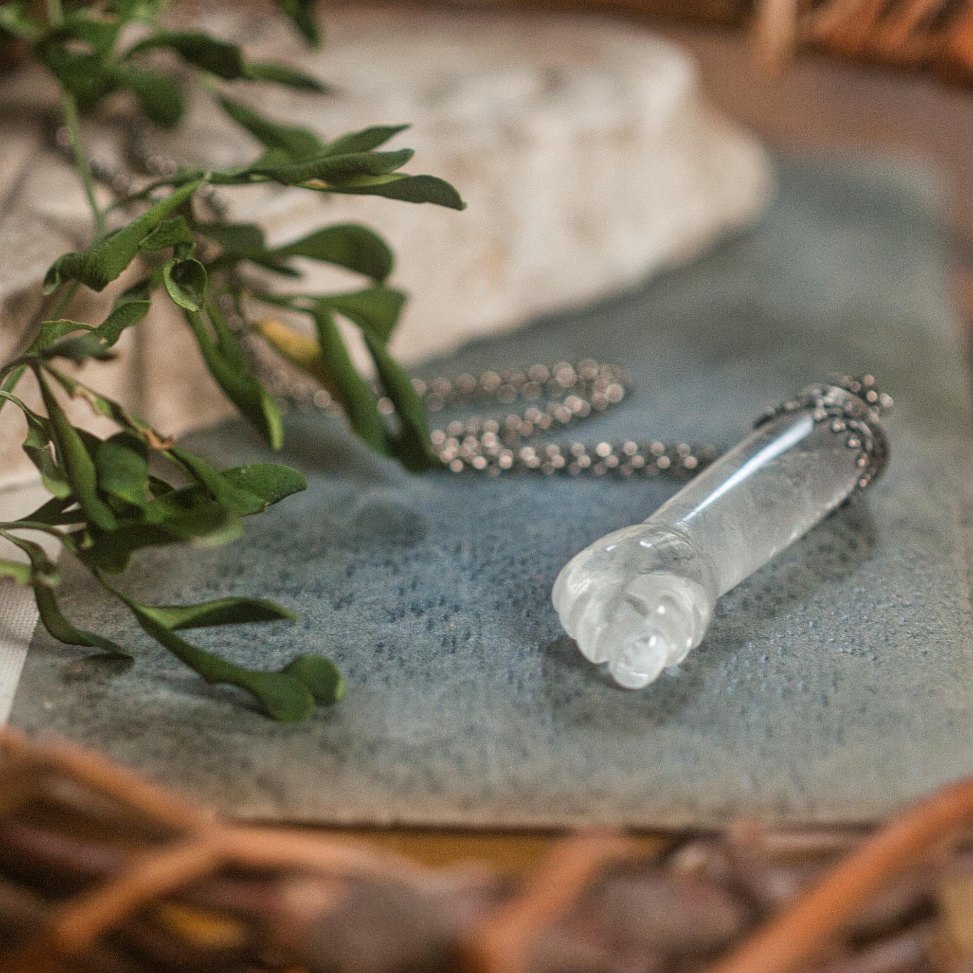 Carved from a chunk of beautiful clear quartz and capped in sterling silver, the pendant measures approximately 3.5cm. The 24" chain is also sterling silver and all metal work has been given a rich antique patina.