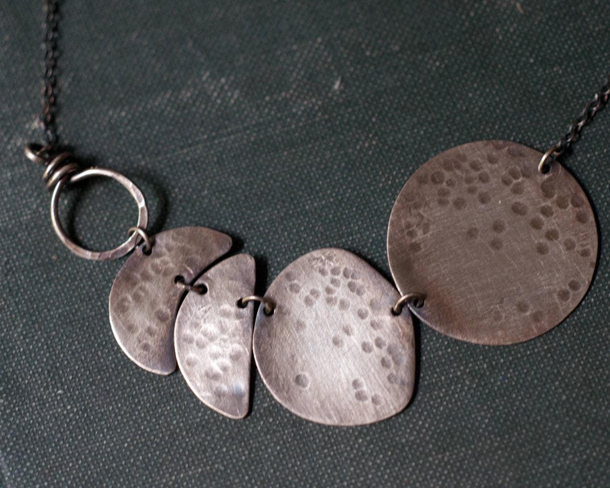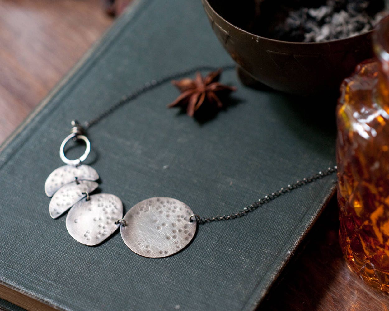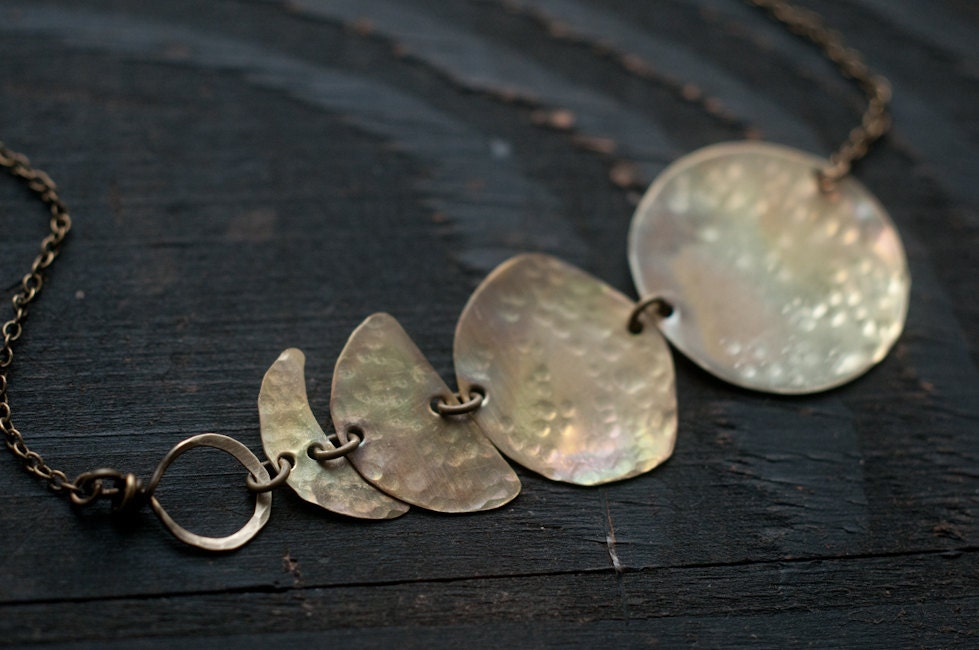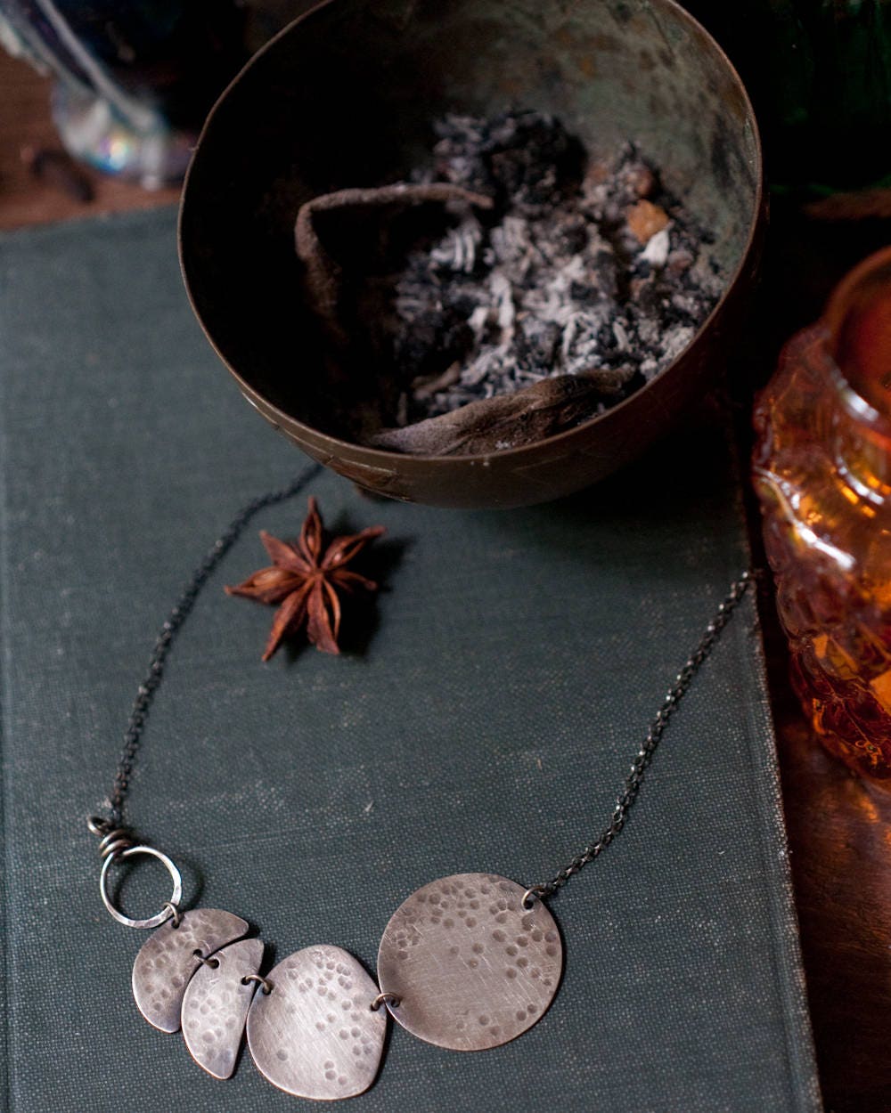 moon phase necklace -lunar cycle - lunar phase - hammered sterling silver - oxidised - moon Goddess necklace, fire patina, hammered brass.