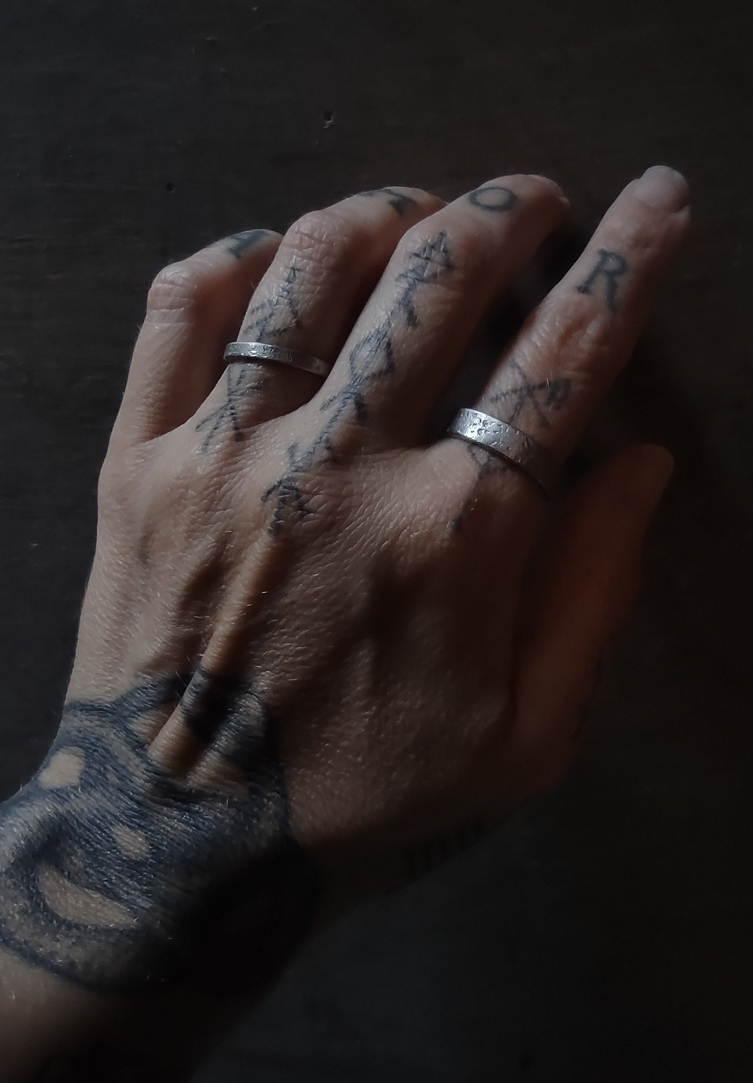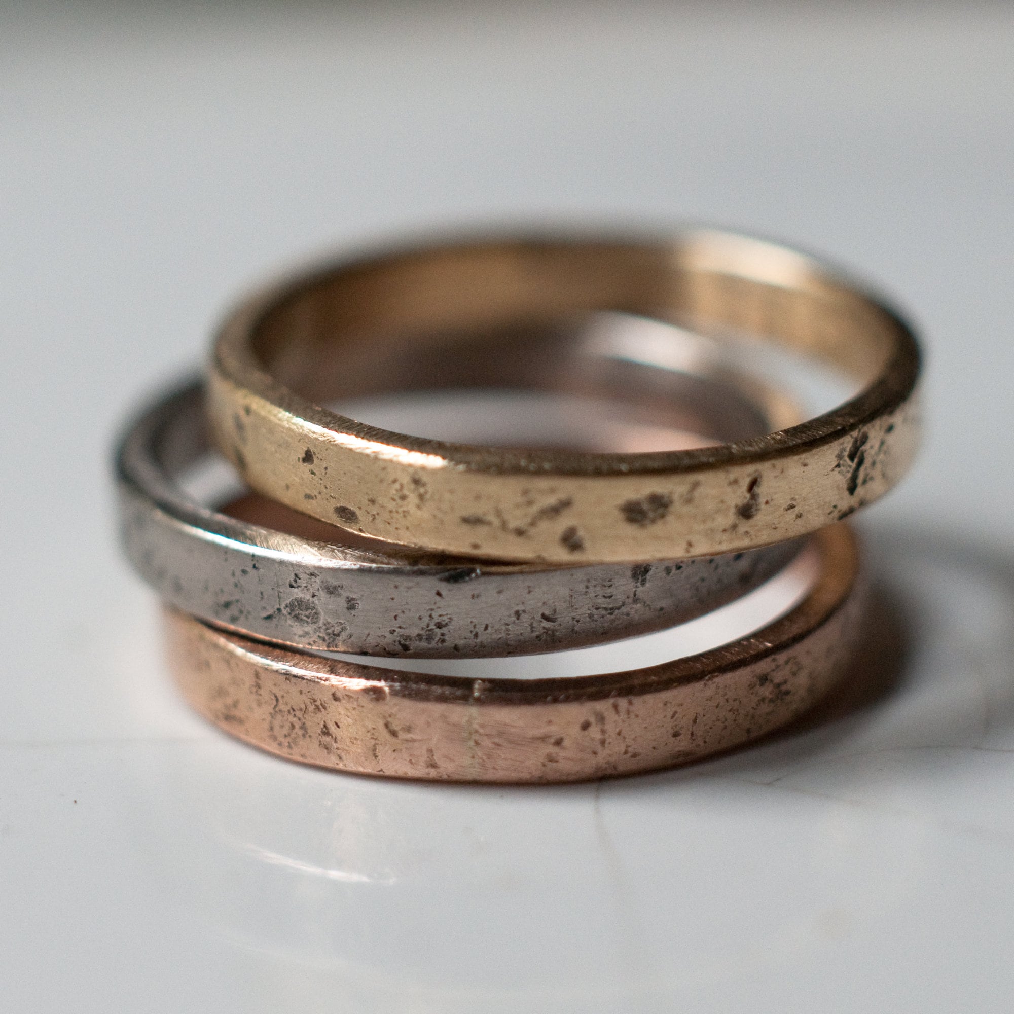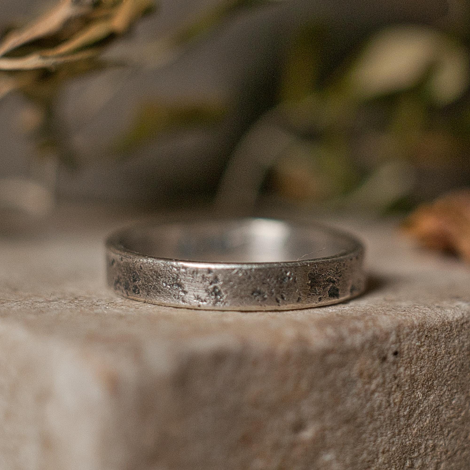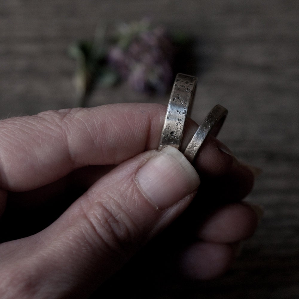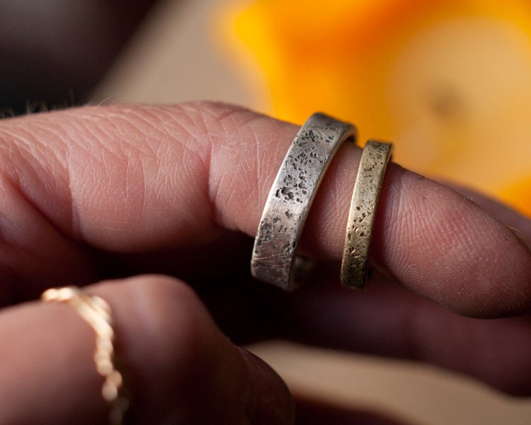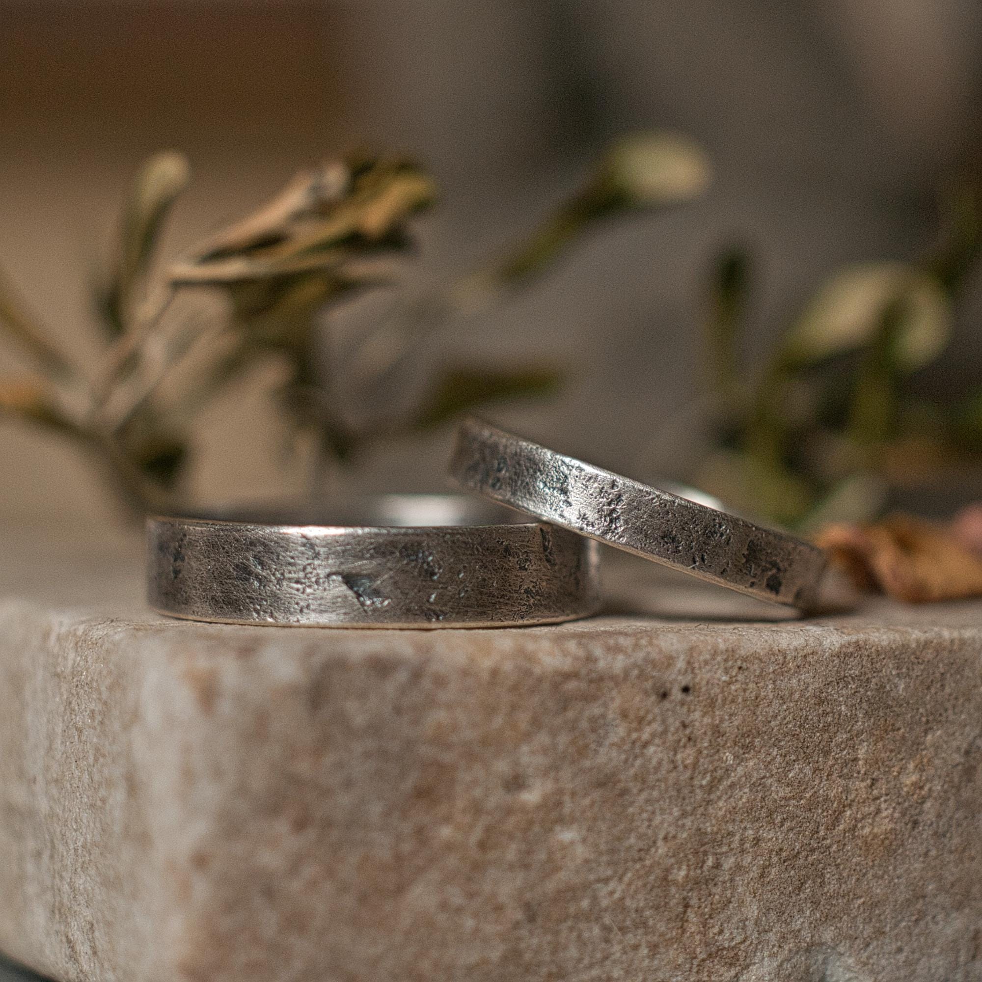 Rustic and raw, these wedding ring have been textured against stone because the strongest love has scars. In solid sterling silver.