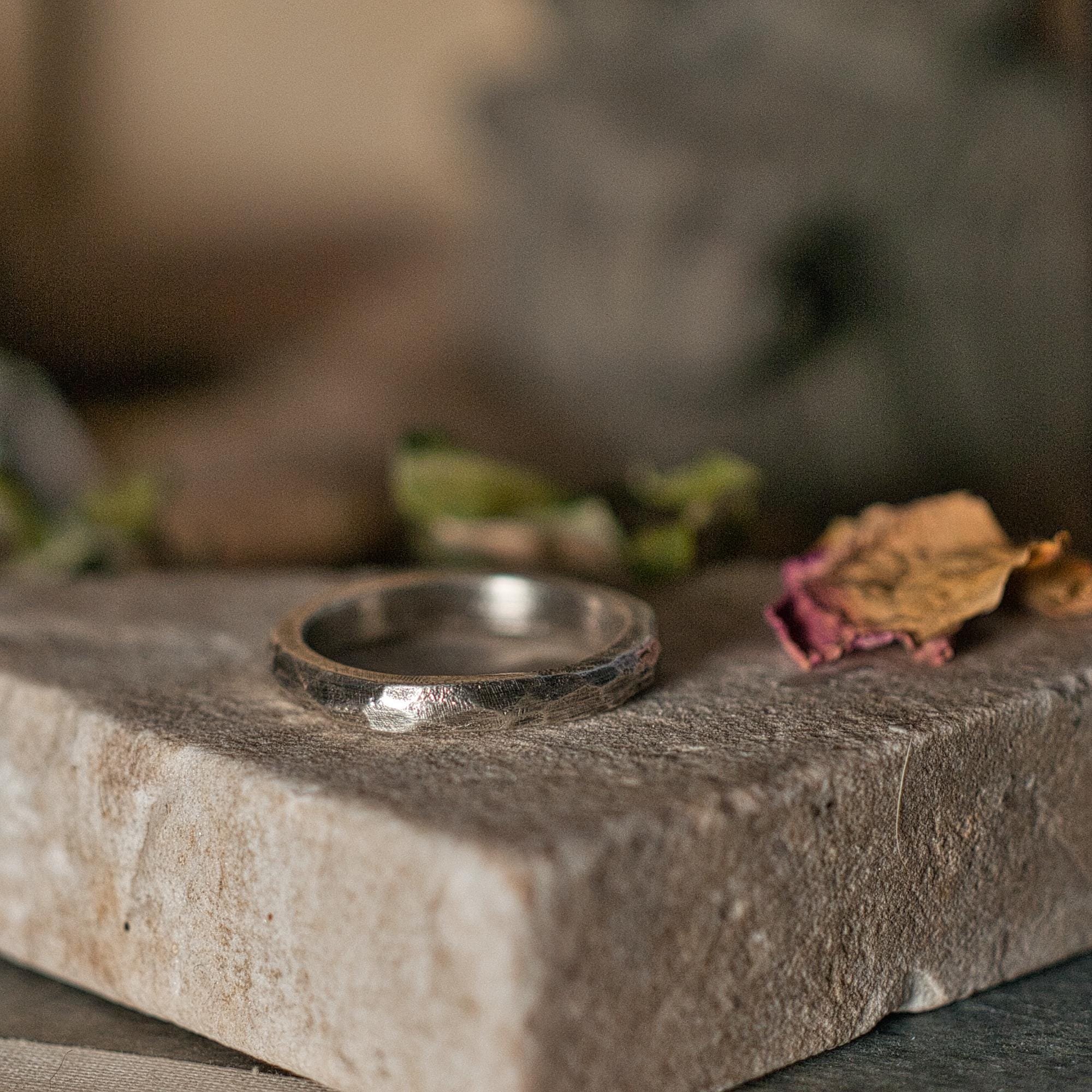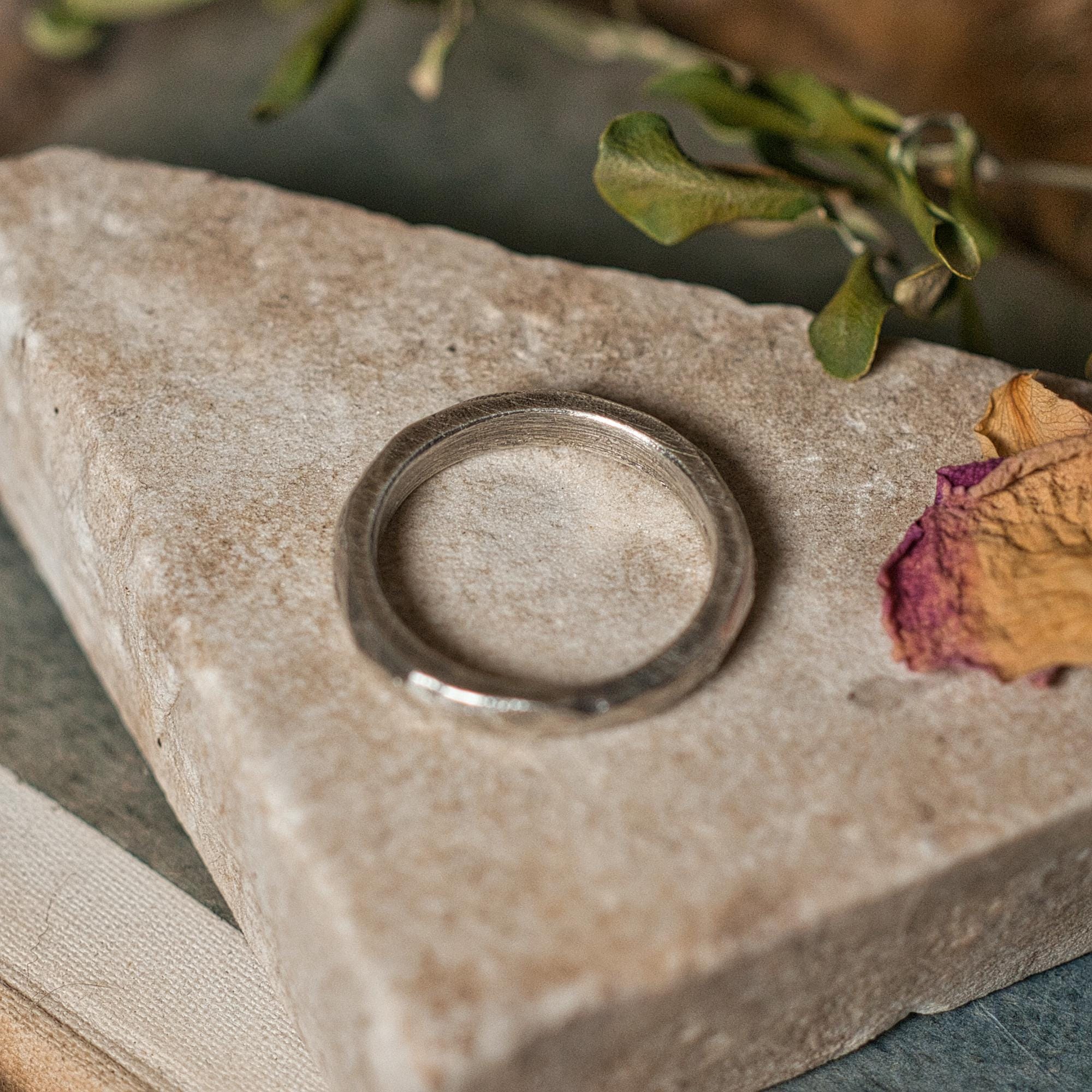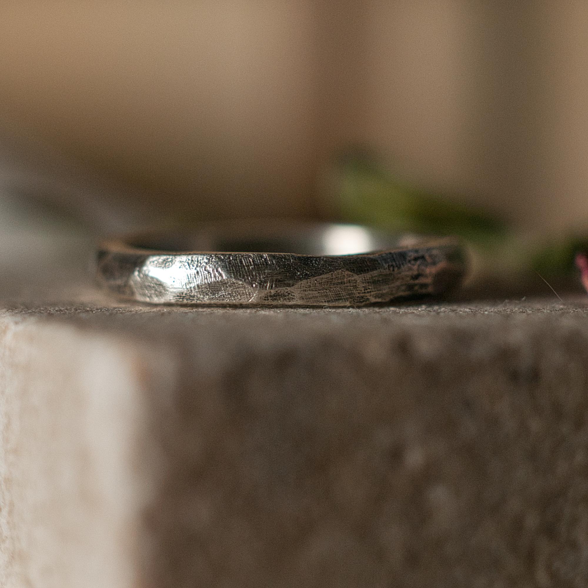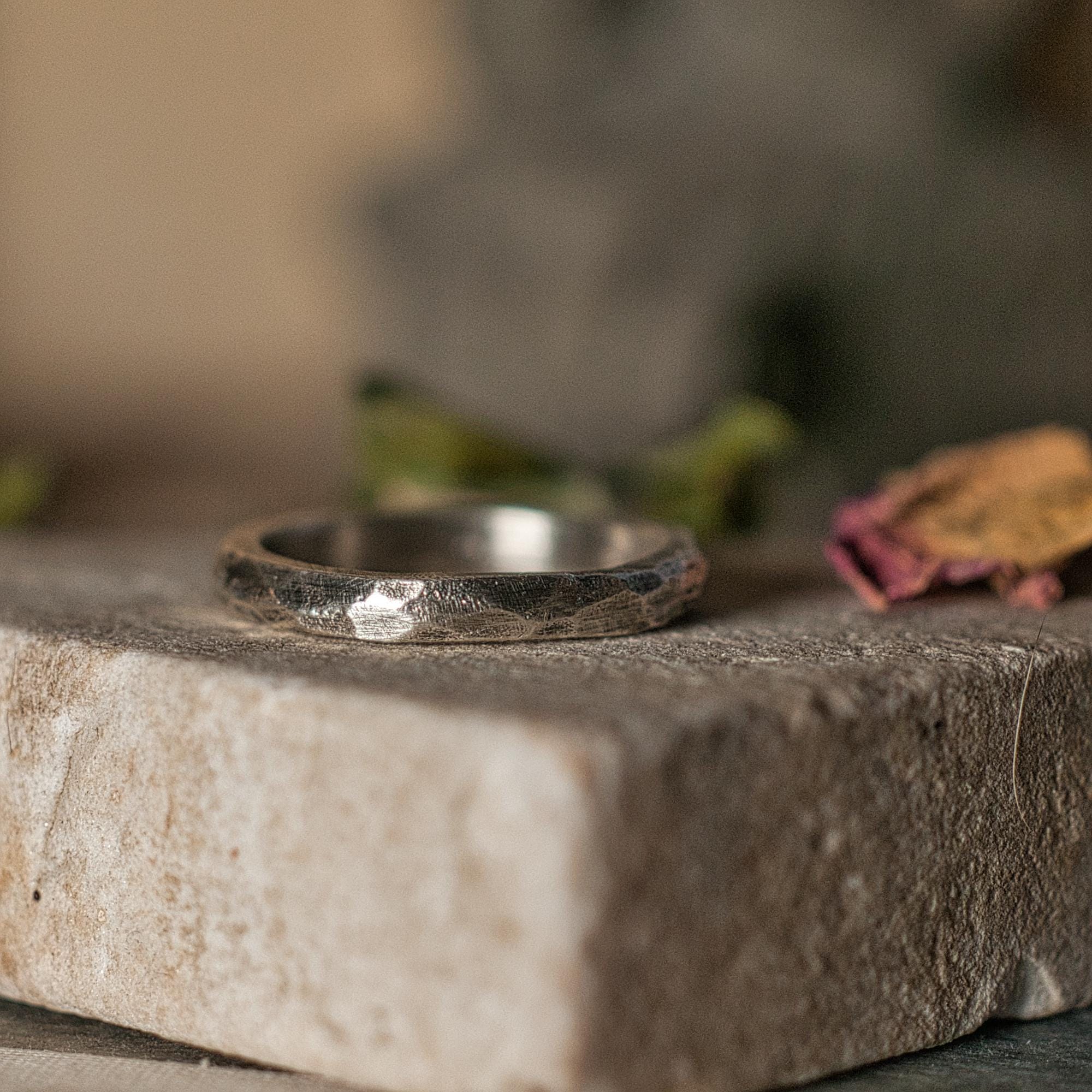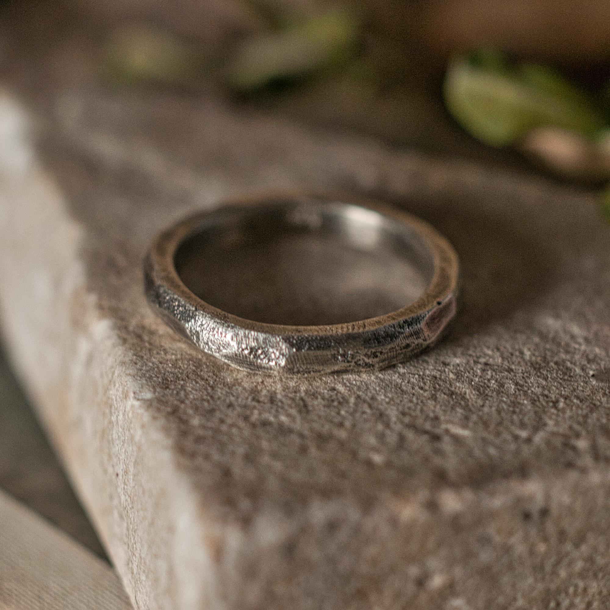 Rustic, raw and primitive... wedding or stacking rings carved in wax for each individual customer and then cast in solid silver. This ring is approximately 3mm wide and 1.8mm thick. Other dimensions are possible so drop me a line if you want something wider or thicker and I'll let you know what is possible.