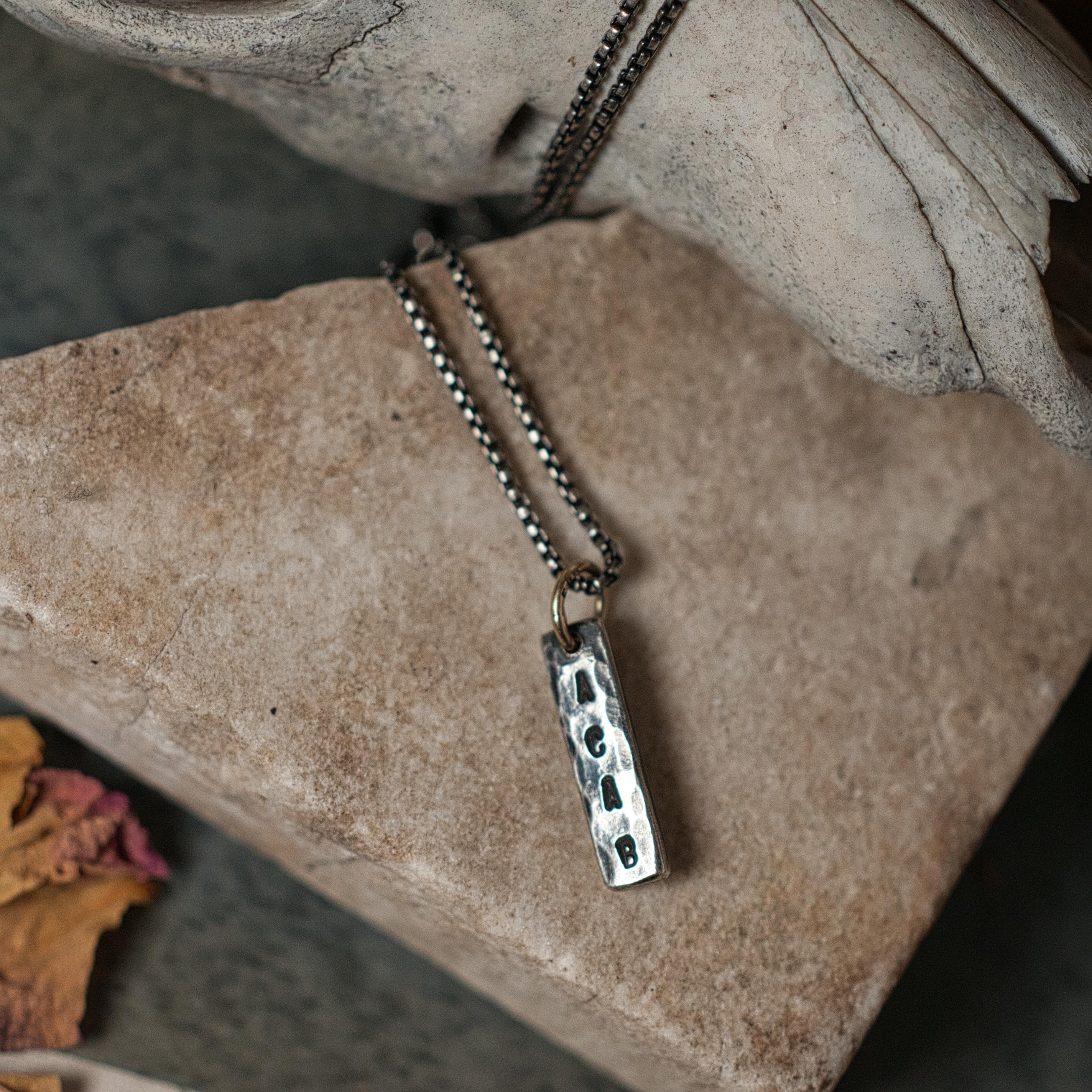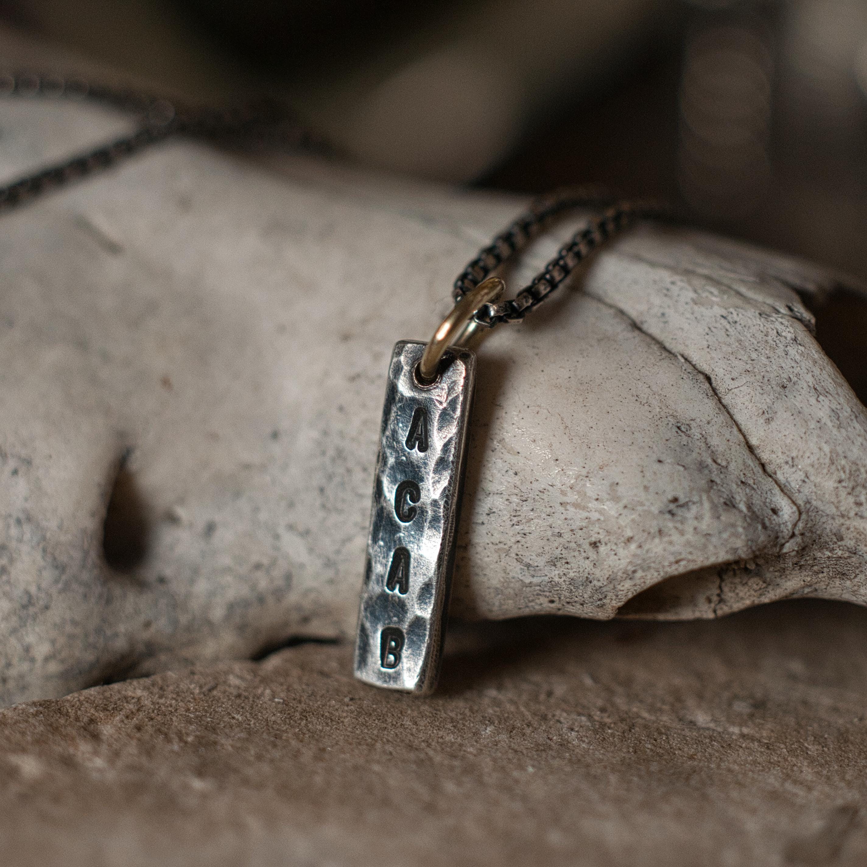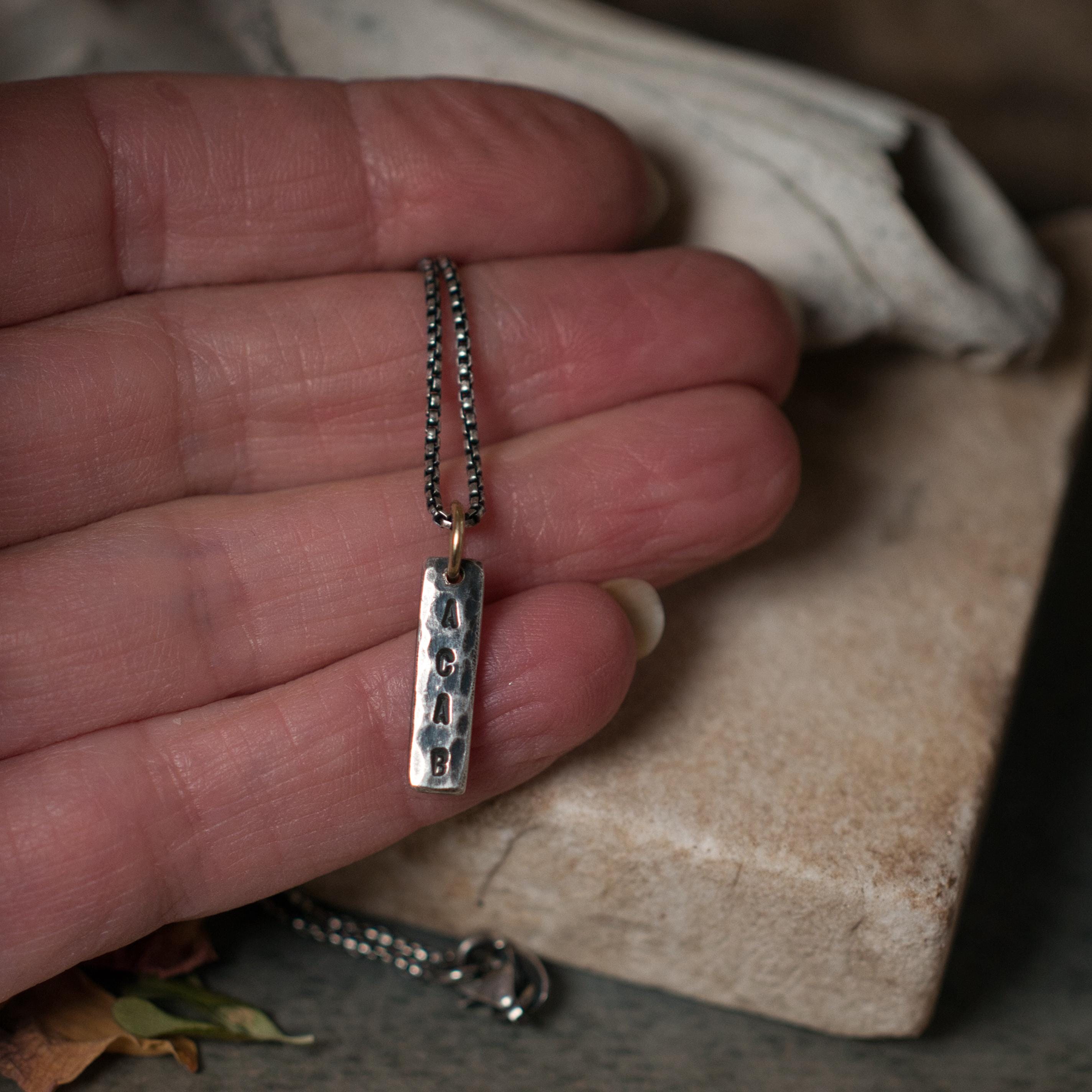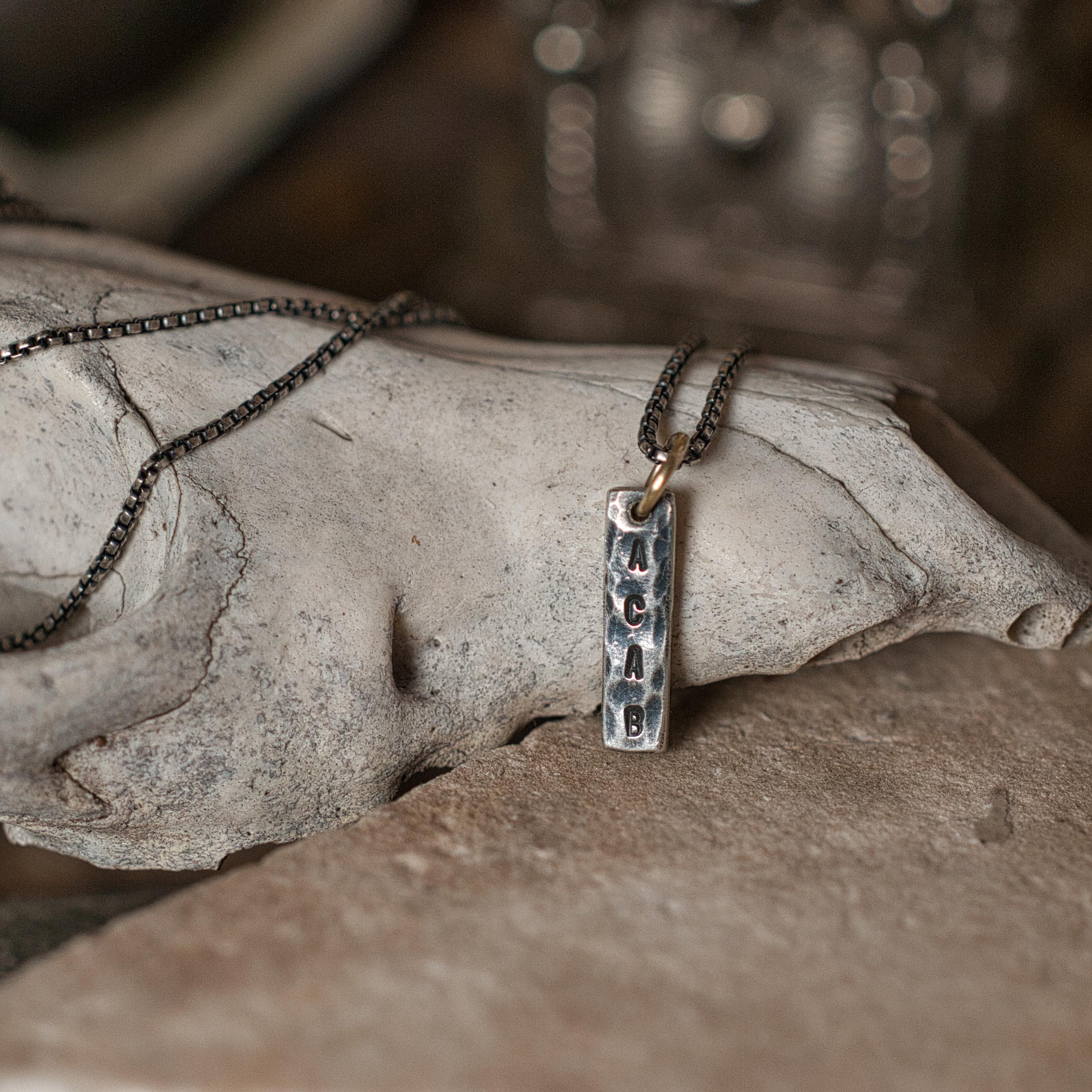 This ACAB pendant has been stamped and hammered onto recycled sterling silver, the hanging bail is 14k recycled gold and the chain is a 16" box chain that has been oxidised to match the patina of the pendant.