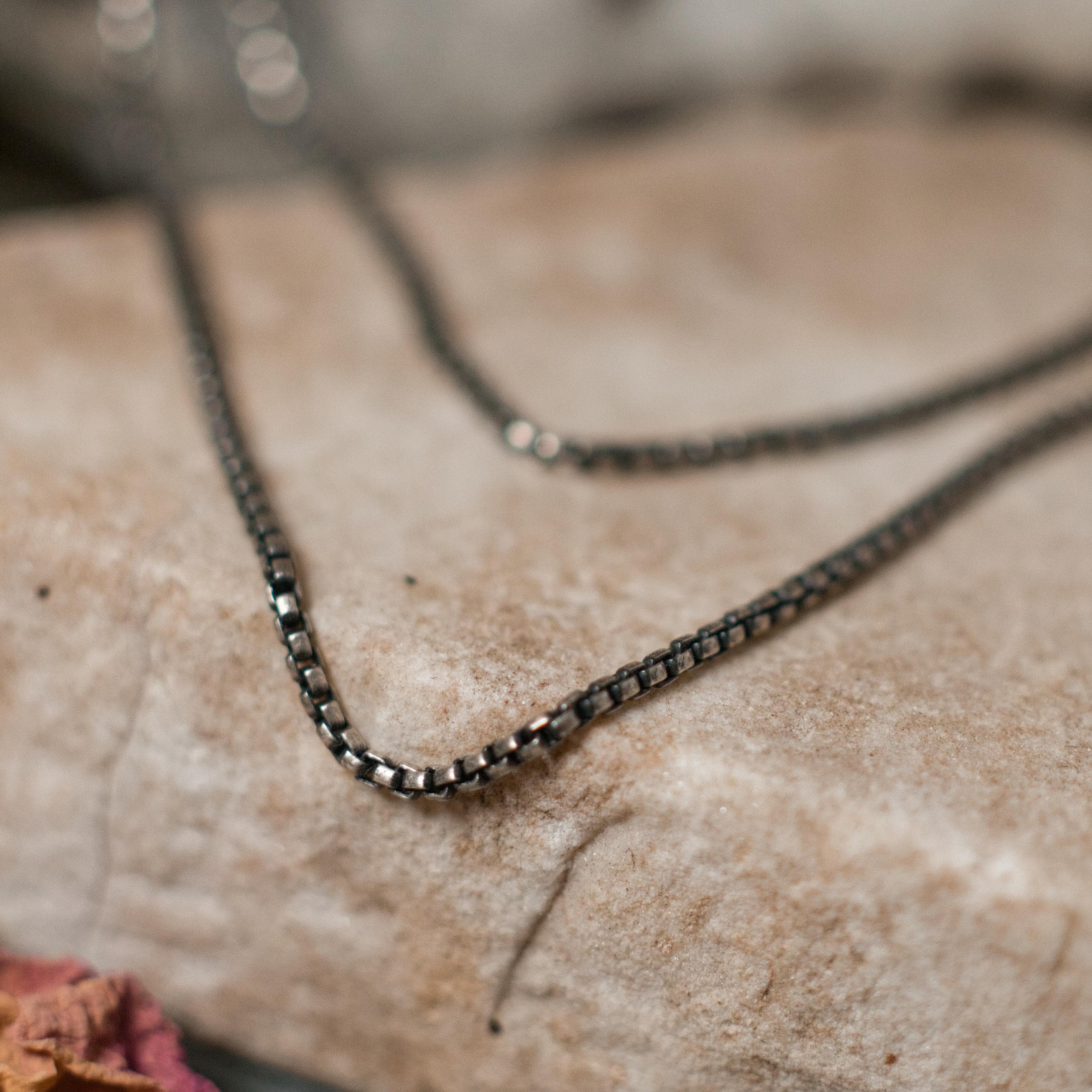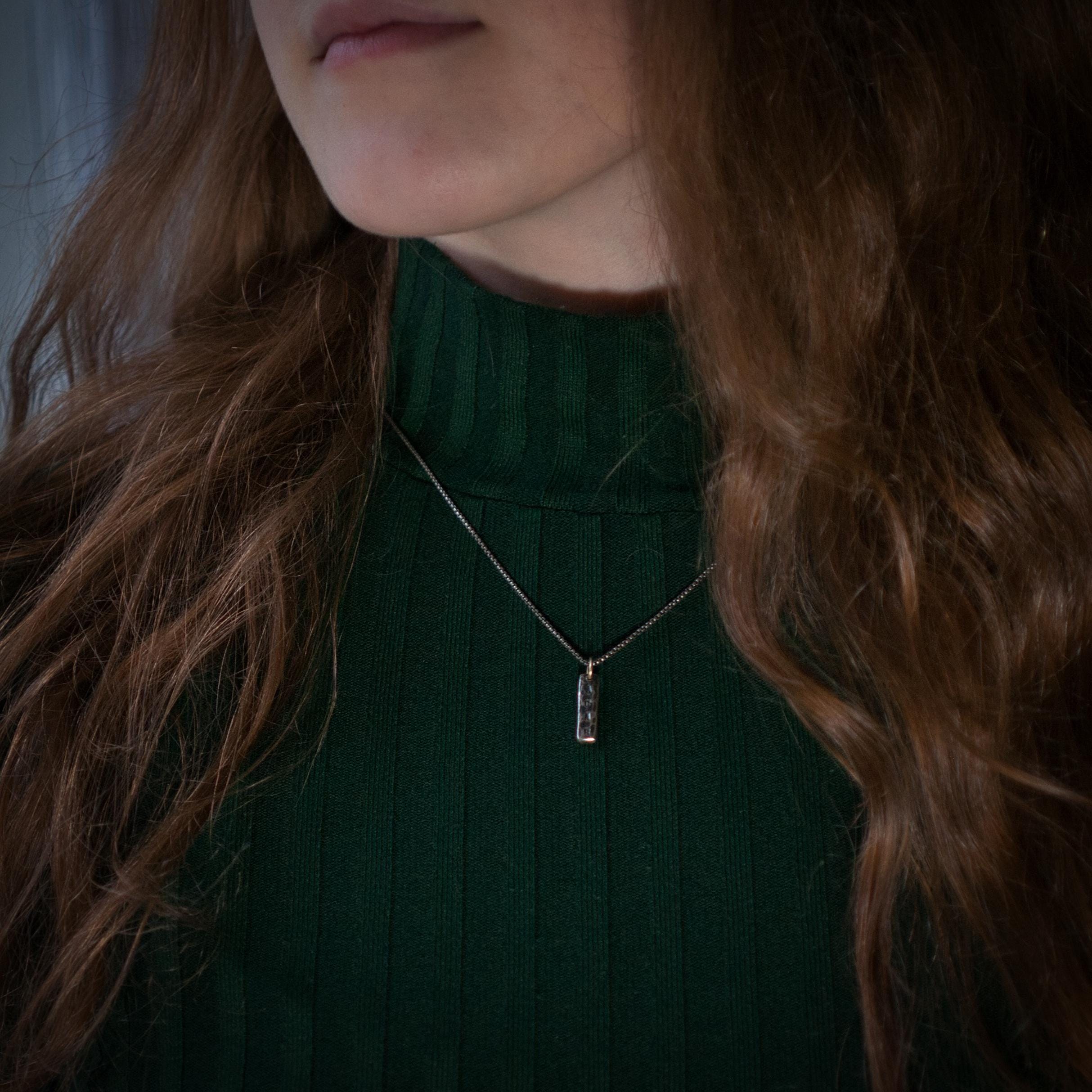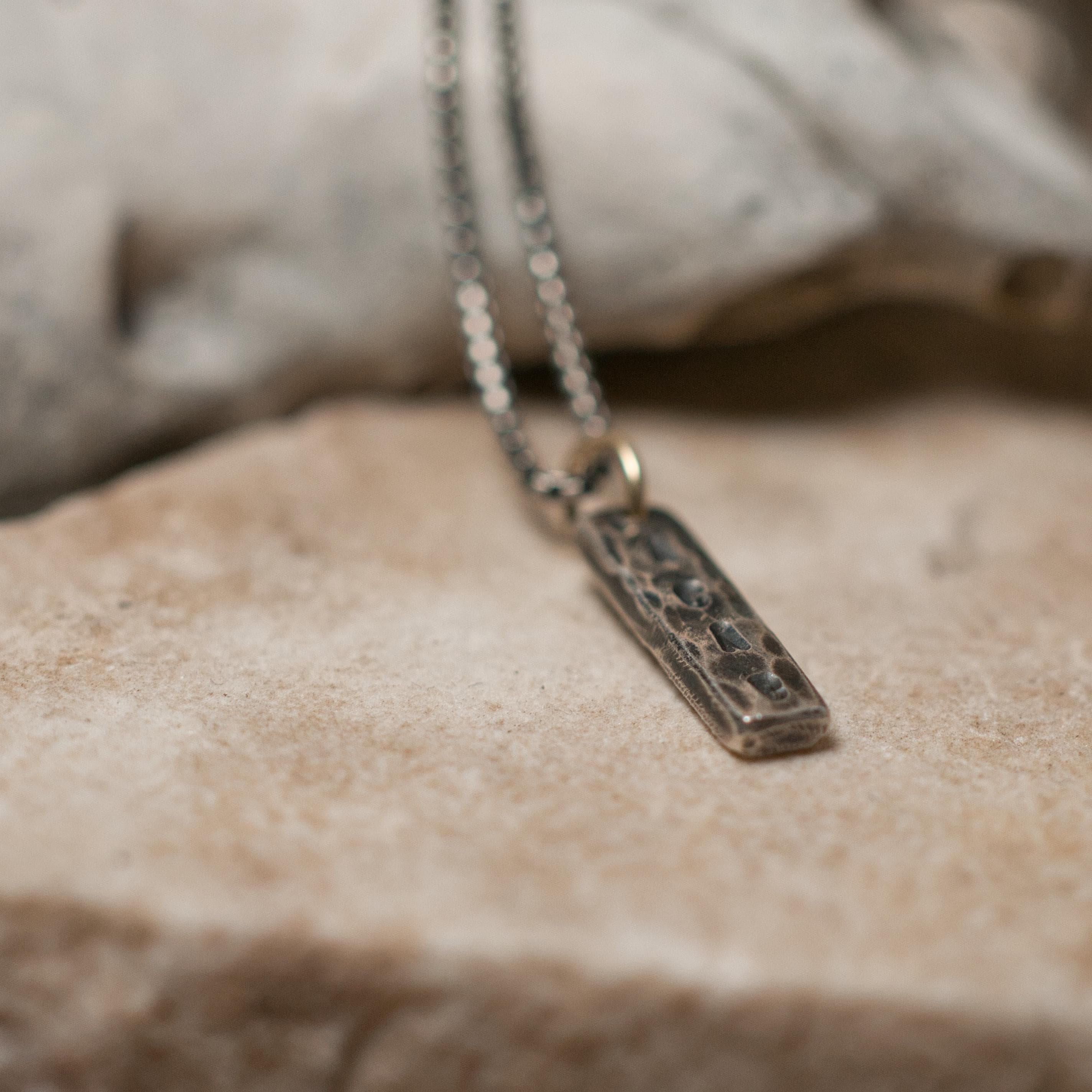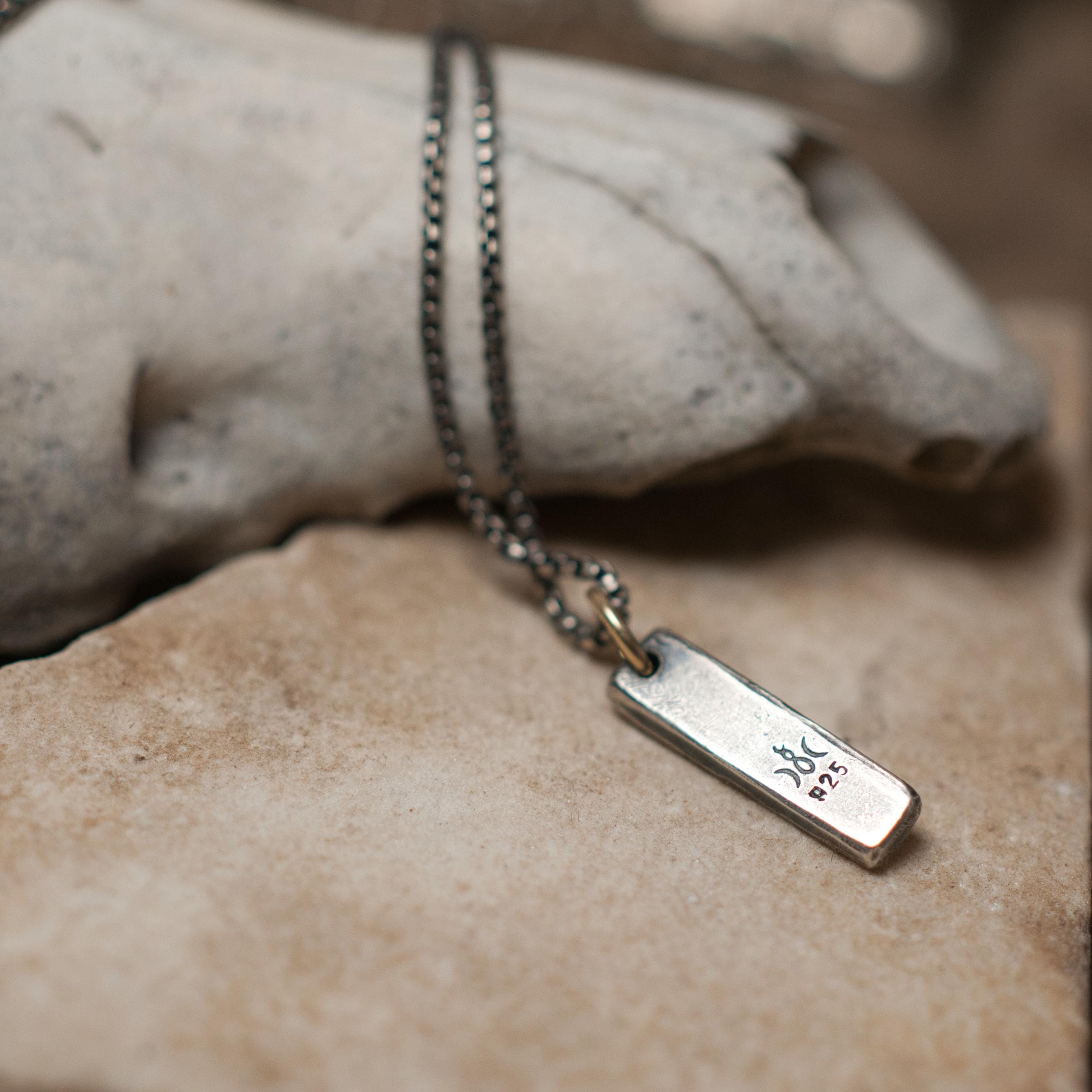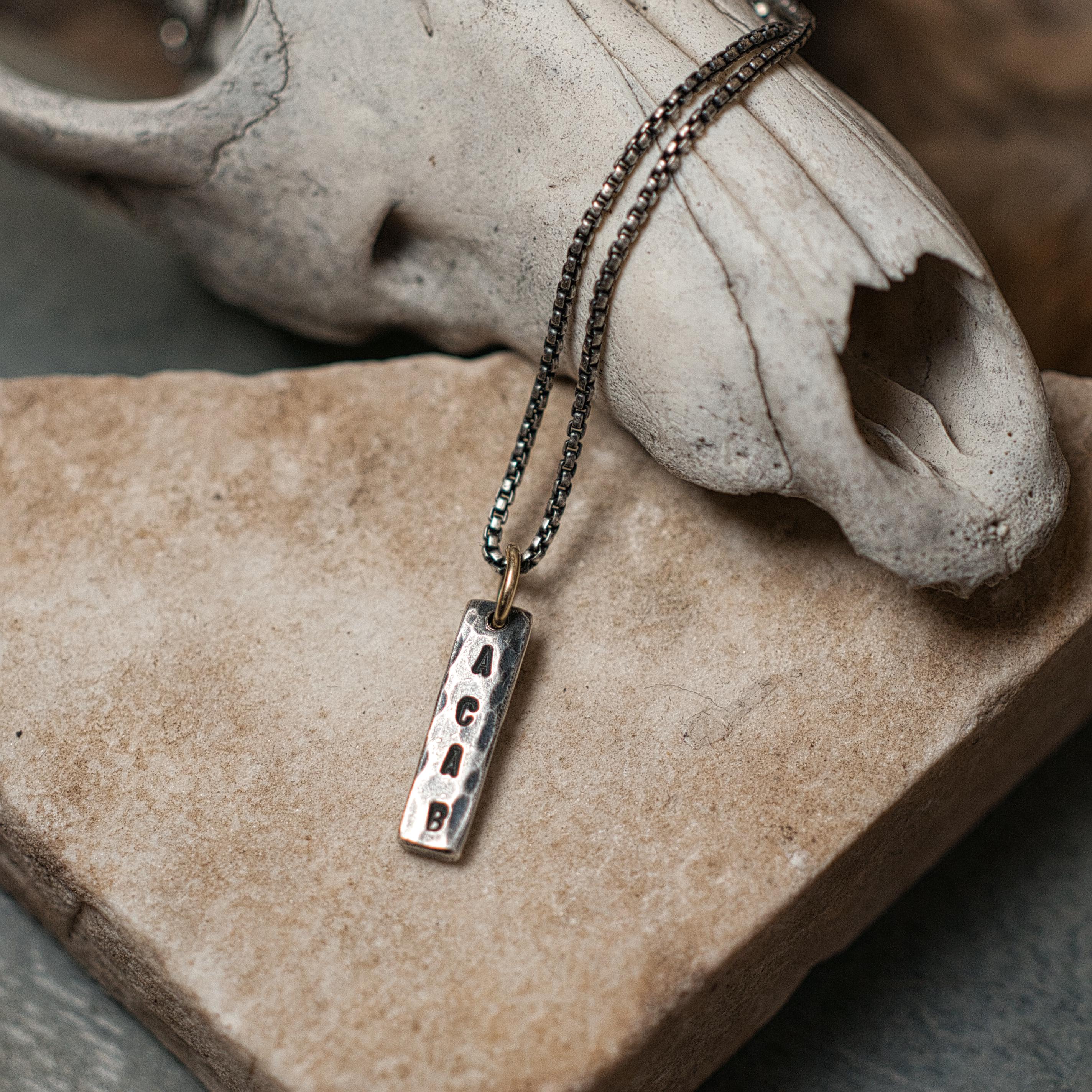This ACAB pendant has been stamped and hammered onto recycled sterling silver, the hanging bail is 14k recycled gold and the chain is a 16" box chain that has been oxidised to match the patina of the pendant.