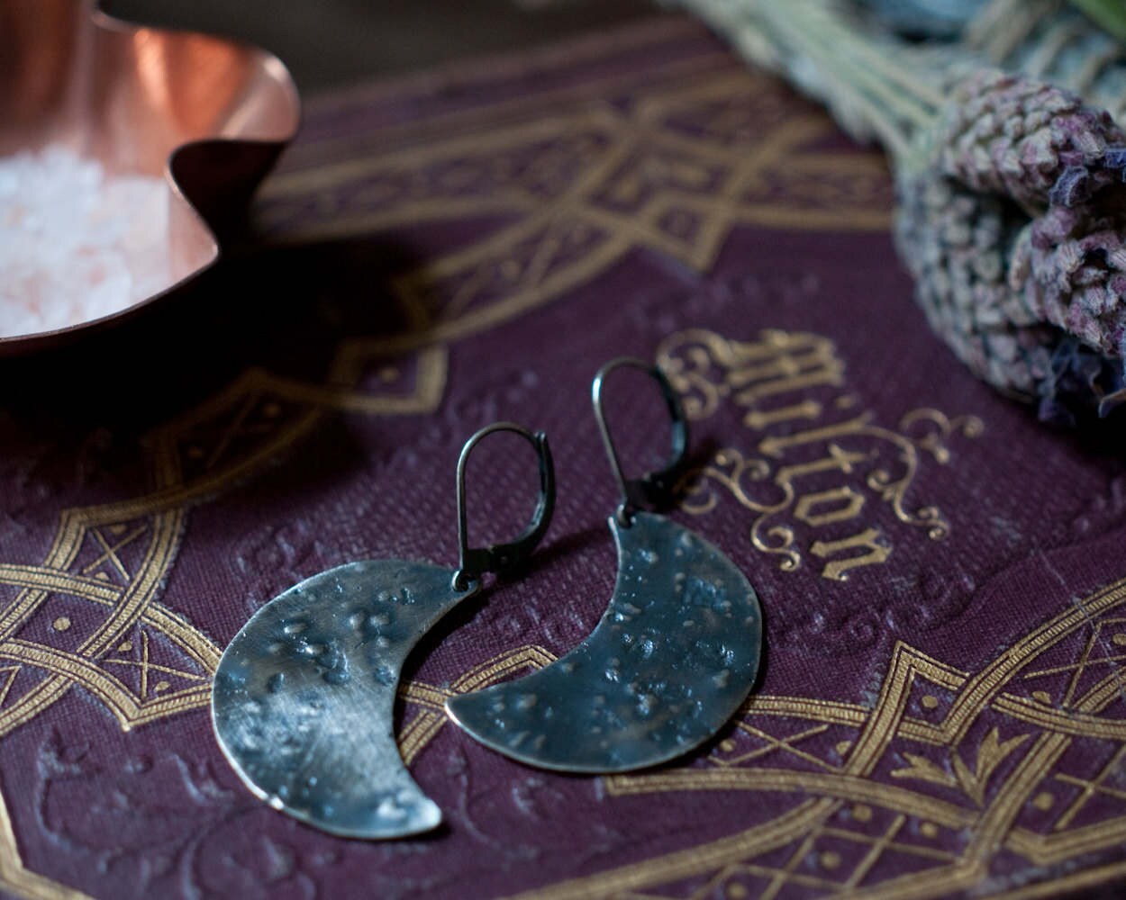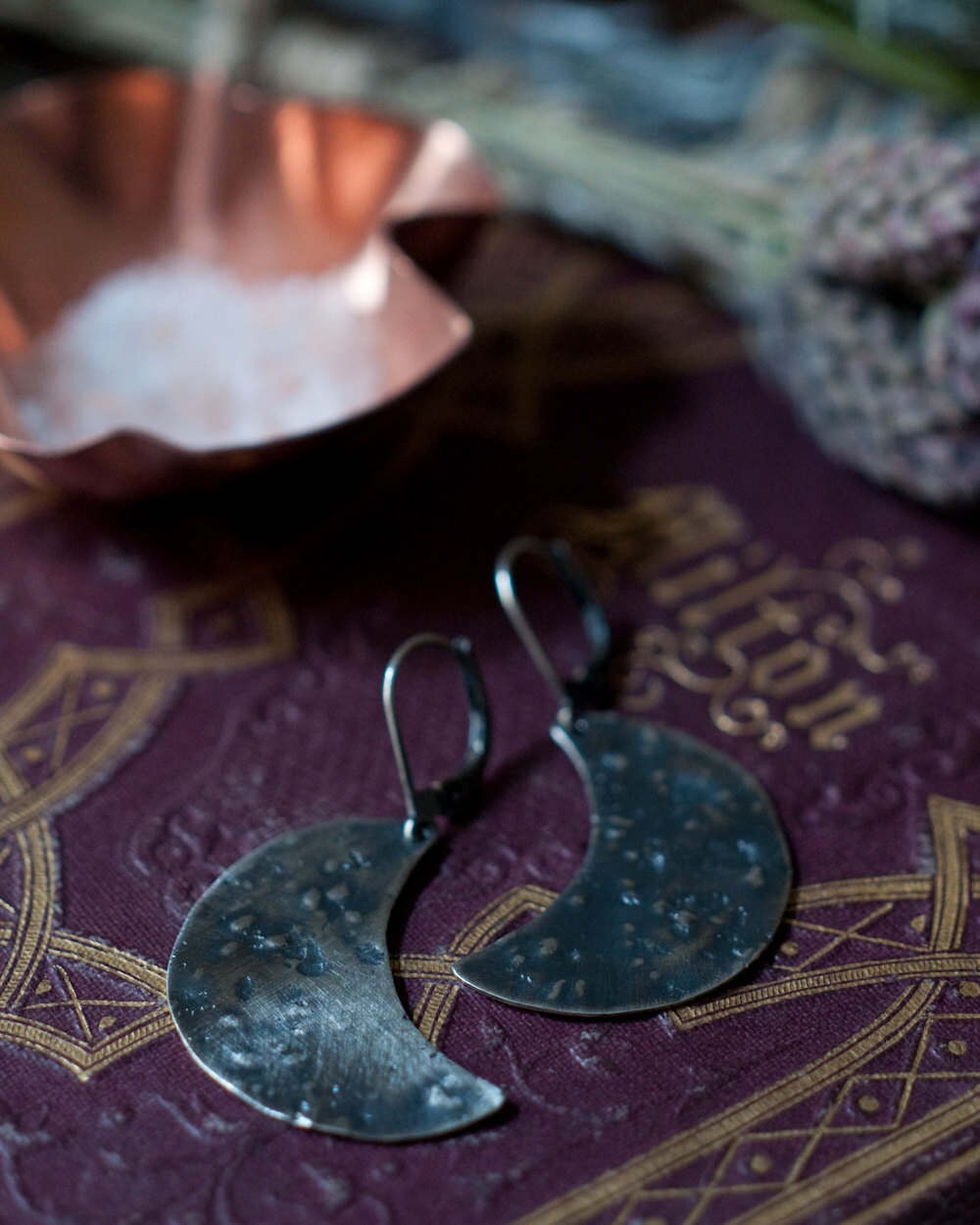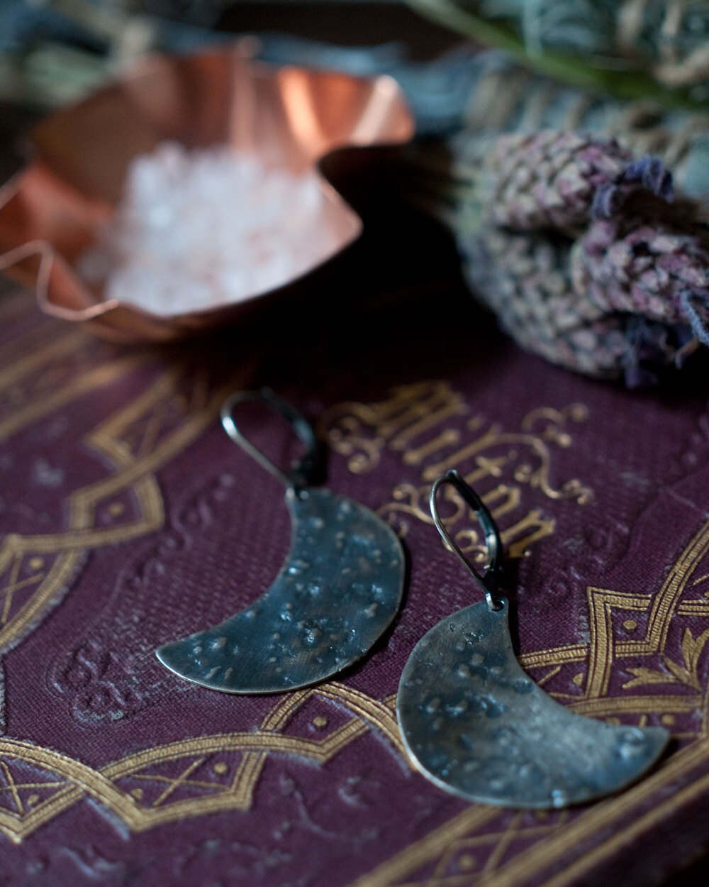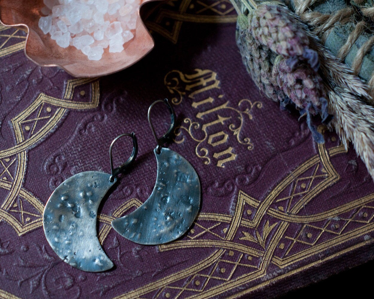 Crescent moon earrings, hammered sterling silver, textured and oxidised, large crescent earrings, moon phase jewellery.