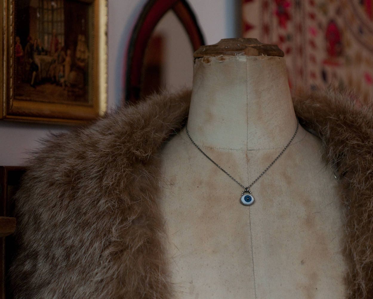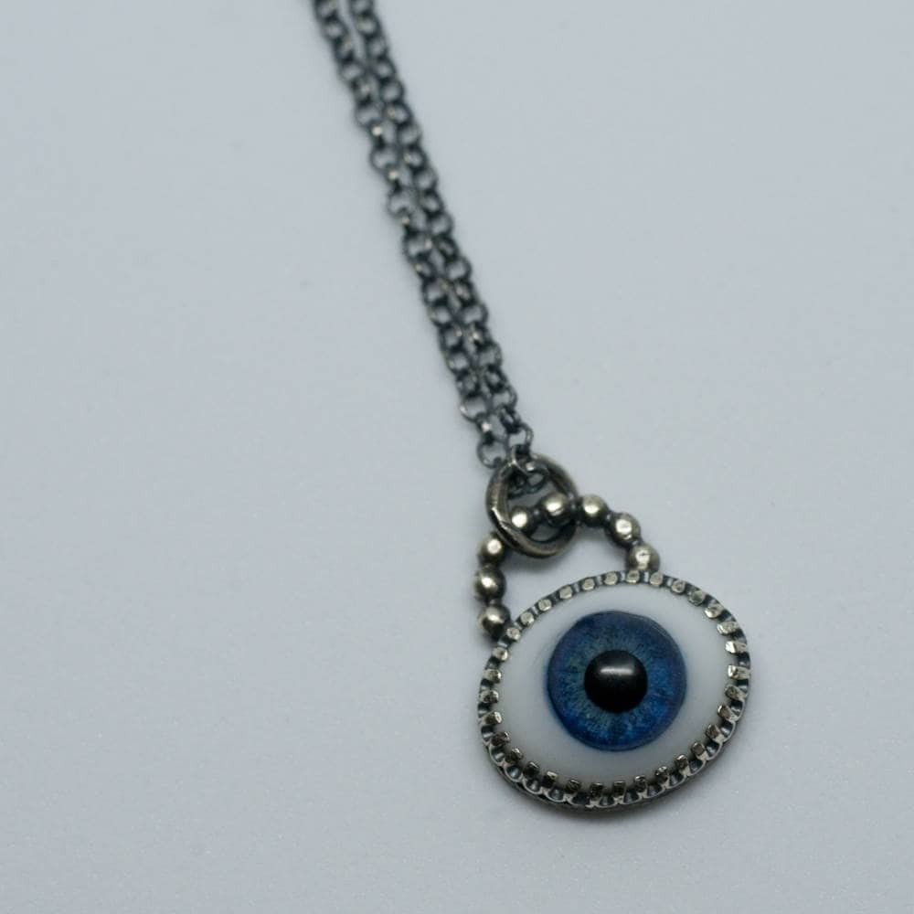 A necklace version of my best selling evil eye ring... A 10mm solid glass eye sits within a fancy gallery wire bezel and hangs from a 16" length mini belcher chain that closes with a spring ring clasp... someone to watch over you...