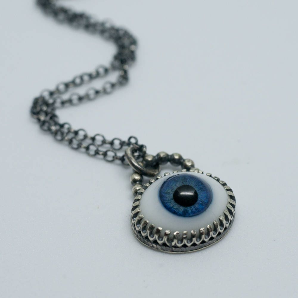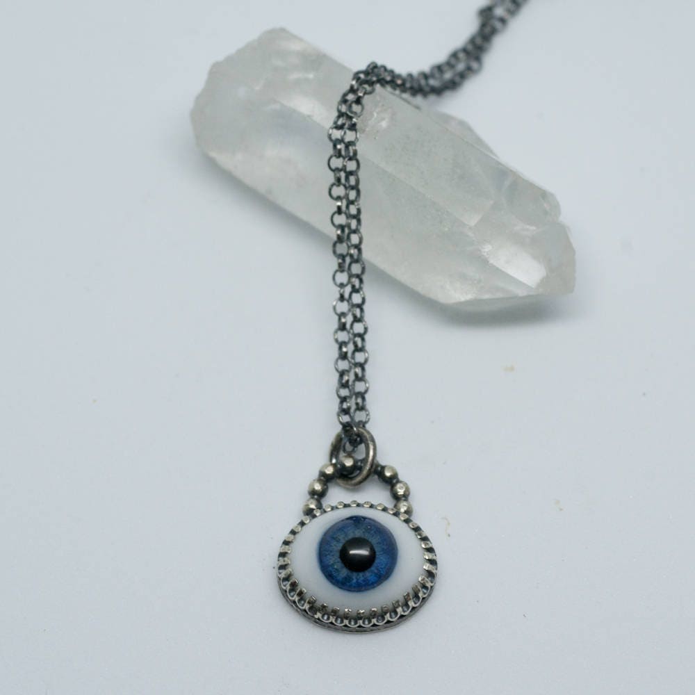 Evil eye necklace, glass doll eye and sterling silver, choker length necklace, magick talisman, protection amulet.