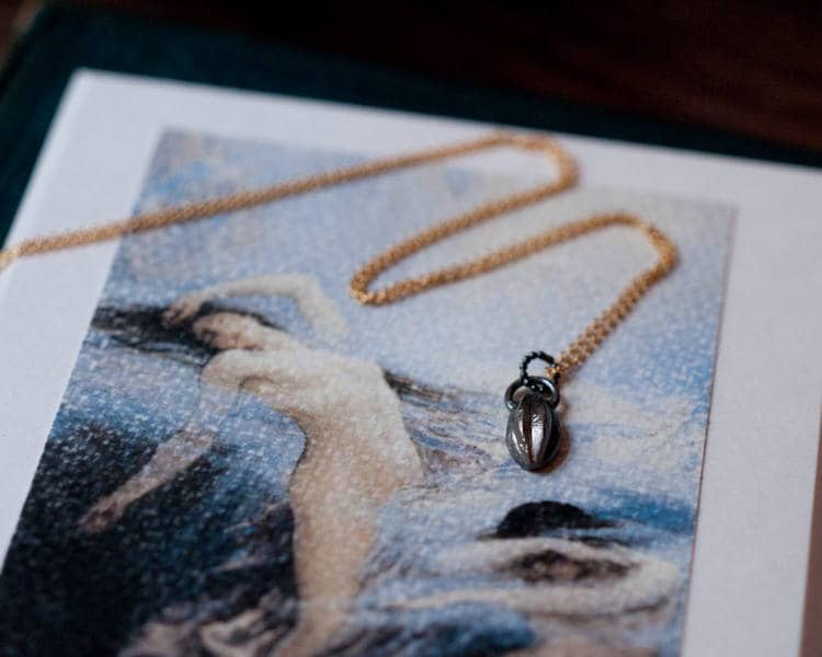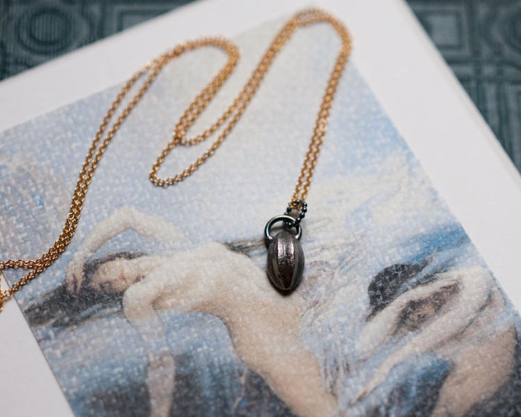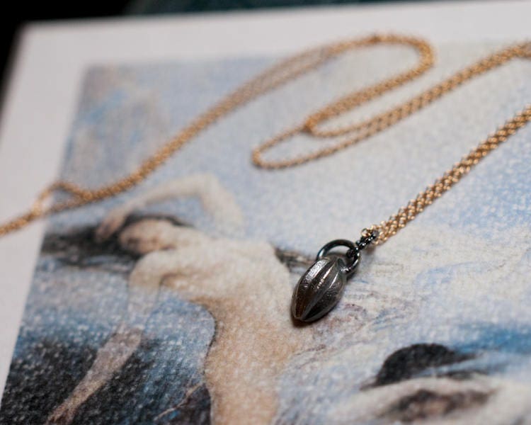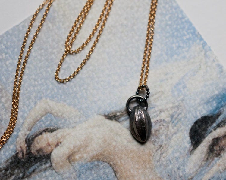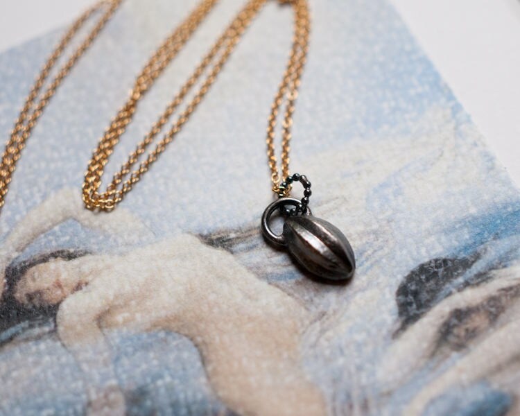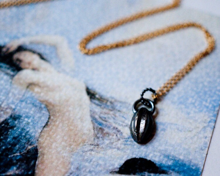 The Yoni is the ultimate symbol of feminine power and creative energy. A stylised version of the female genitalia it is sacred to the mother goddess especially within Hinduism (where it represents the goddess Shakti.) The significance of the Yoni has spread across the globe in recent years as more and more women embrace and celebrate their divine womanhood. This Yoni is subtle enough for everyday wear but the marriage of 14k gold fill and solid sterling silver, blackened and polished to a shine, imparts the opulence and fecundity that the symbol so richly deserves.
