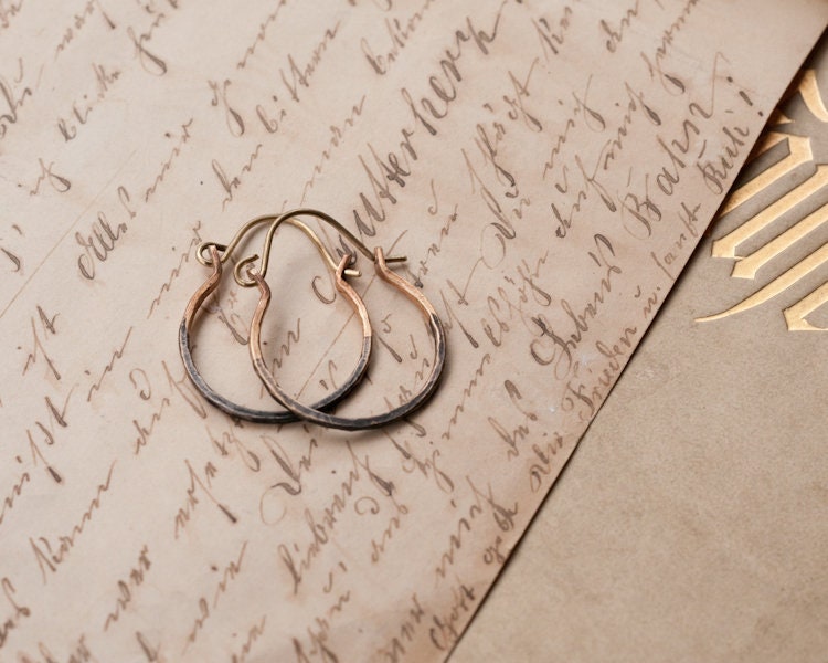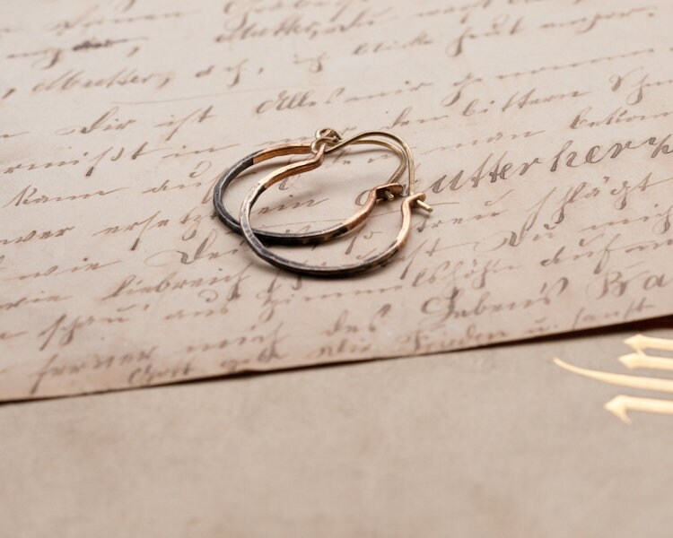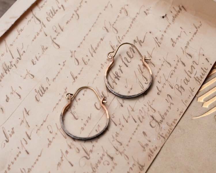 A staple item for any jewelry lover, these hammered rustic ombre hoops in brass or sterling silver are easy to wear and lightweight.
