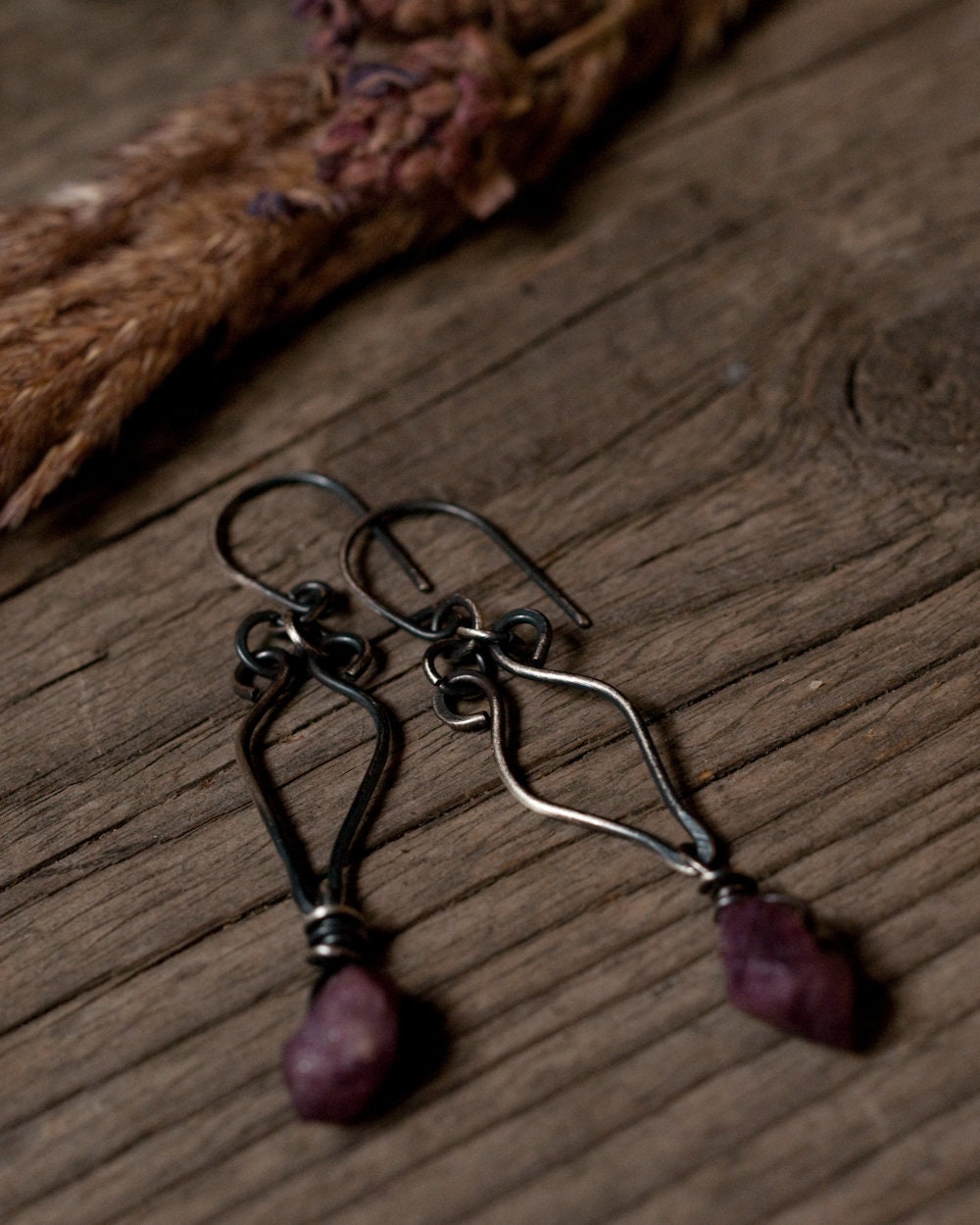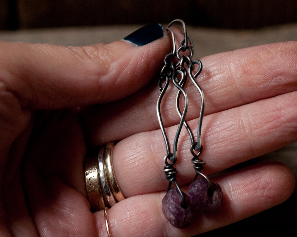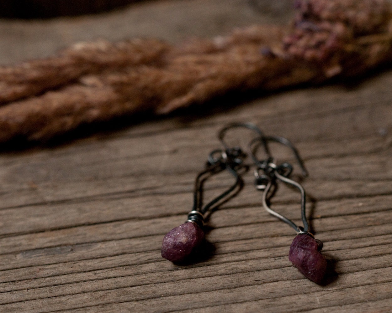 Sterling silver wire wrapped dangle earrings with raw rubies. 6cm in length but very lightweight and easy to wear. 100% handmade findings. Simple hook ear wires. Oxidised for an antiqued look.