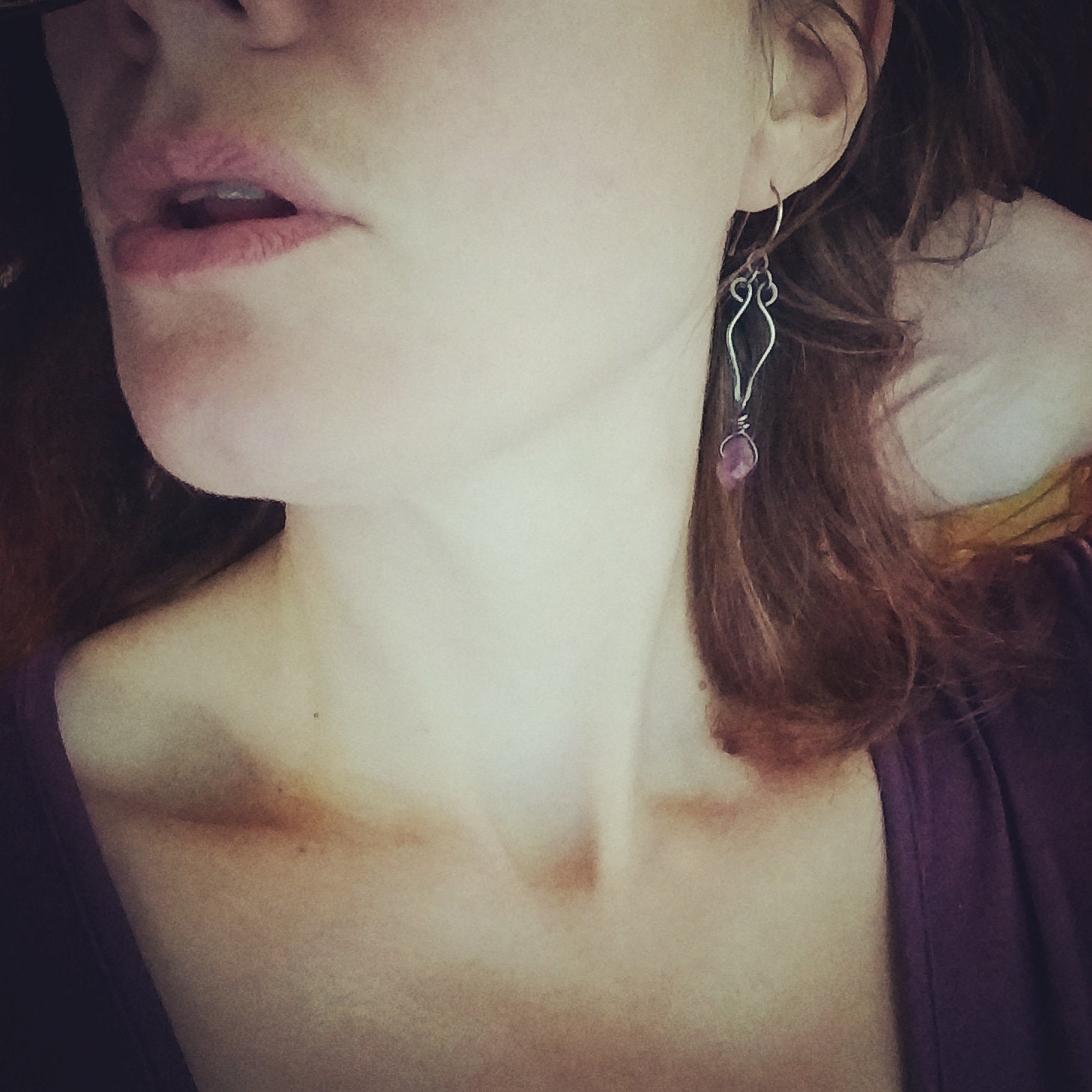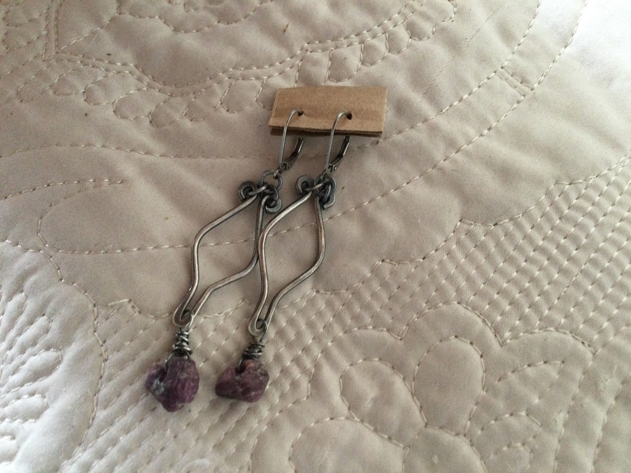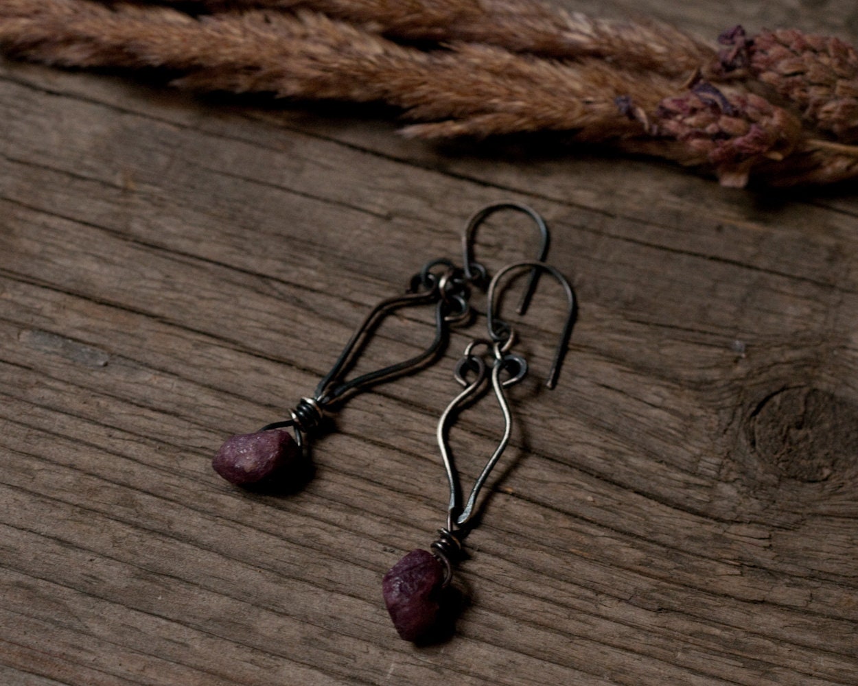 Sterling silver wire wrapped dangle earrings with raw rubies. 6cm in length but very lightweight and easy to wear. 100% handmade findings. Simple hook ear wires. Oxidised for an antiqued look.
